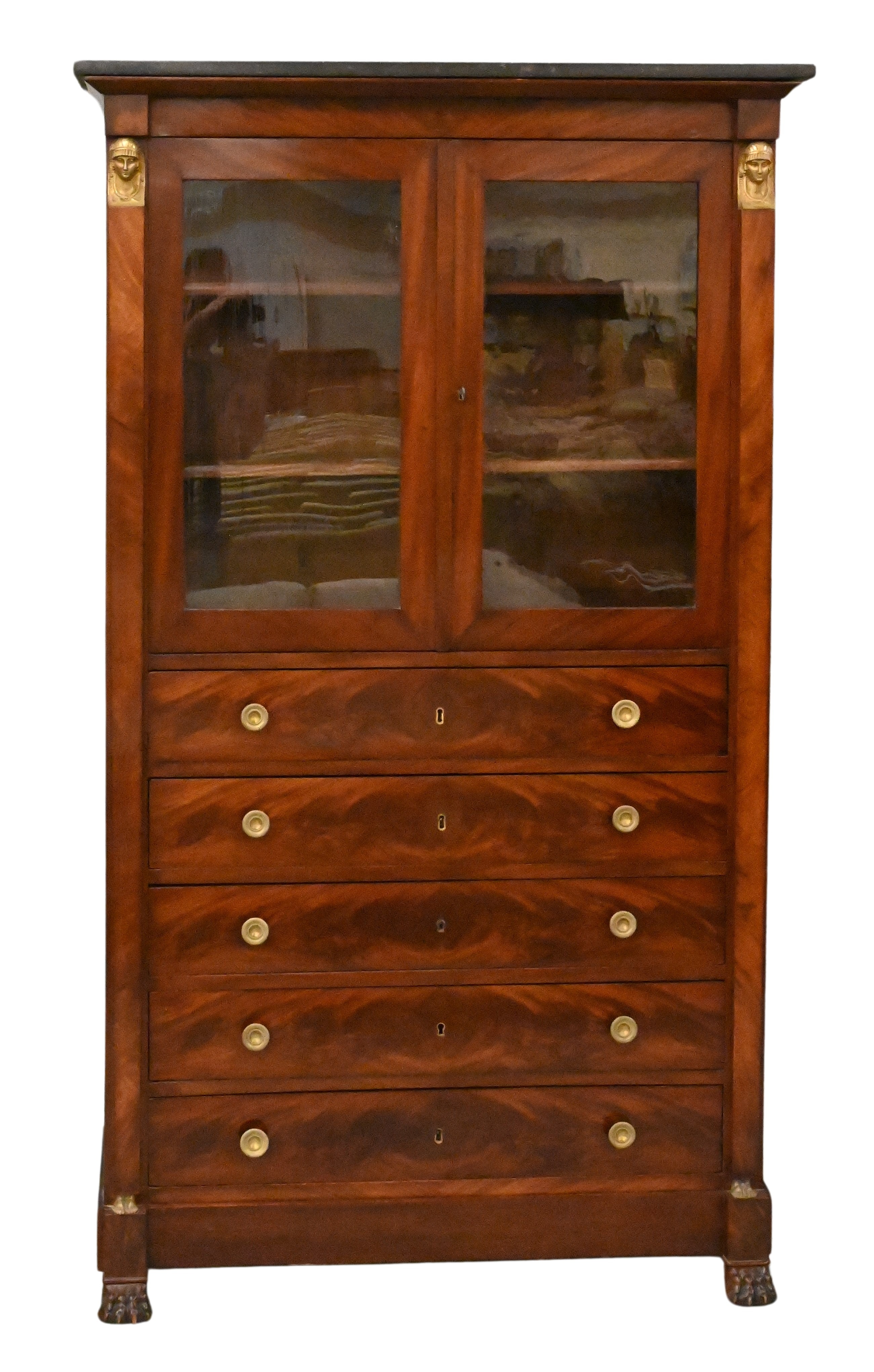 having Egyptian revival motif bronzes, mounted with two glass doors over five drawers flanked by columns set on claw feet, France early 19th century