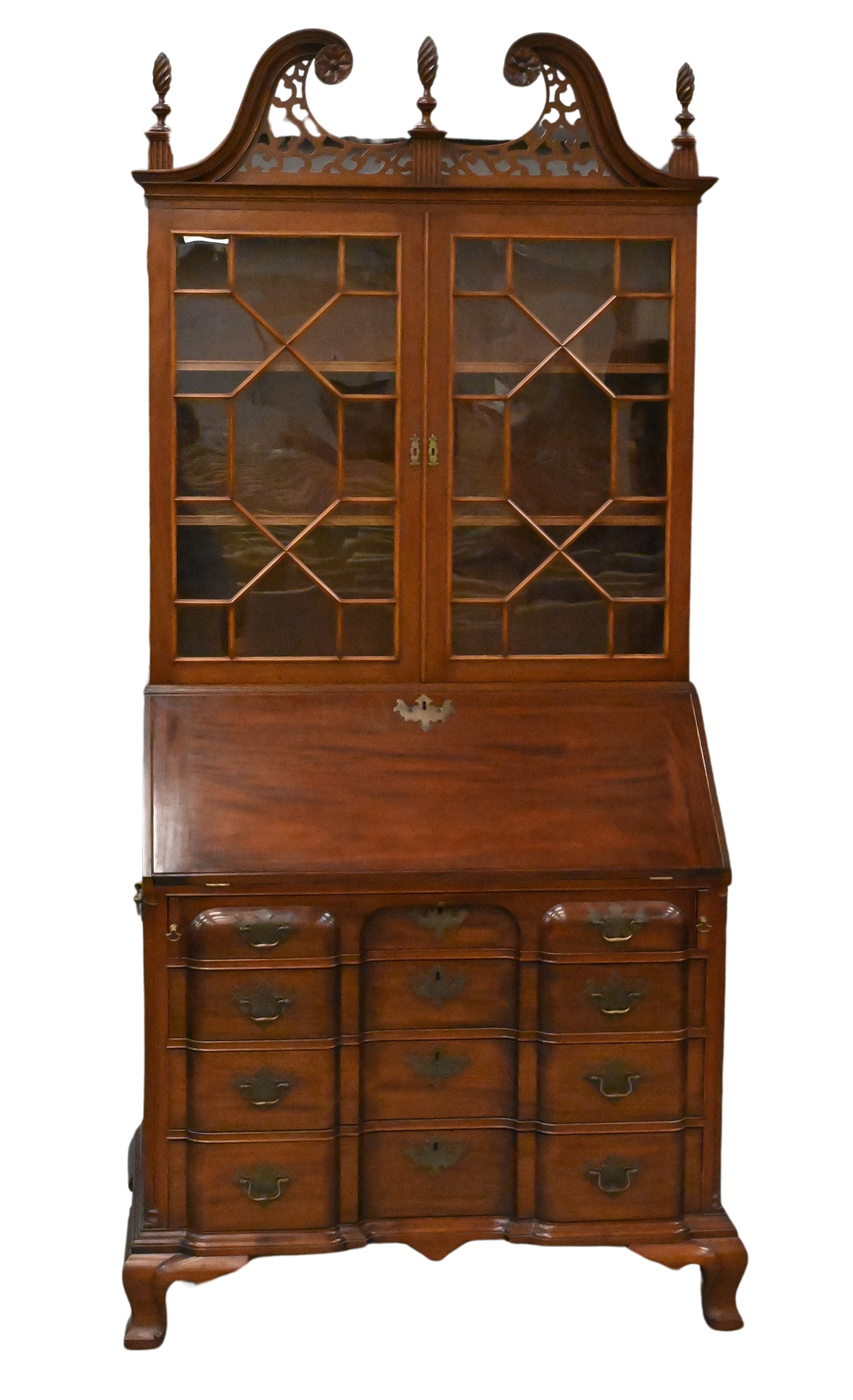 in two parts, upper section having pierced broken arch top with two glazed doors on lower section with slant lid opening to shell carved interior over block front with fluted columns set on ogee feet and brass handles on sides