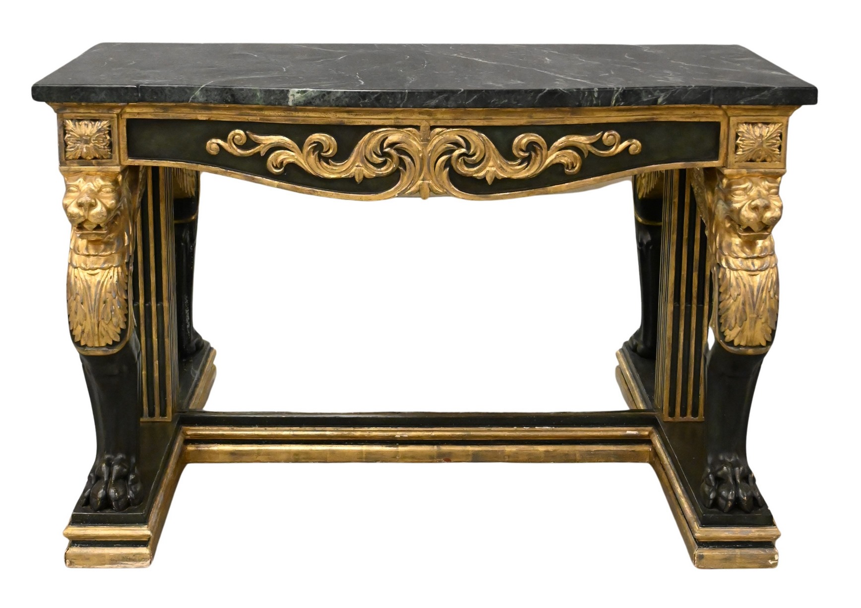 having gilt winged lion monopodia supports, stop fluted columns, with later mirror backing as well as later Verde Antico marble top
