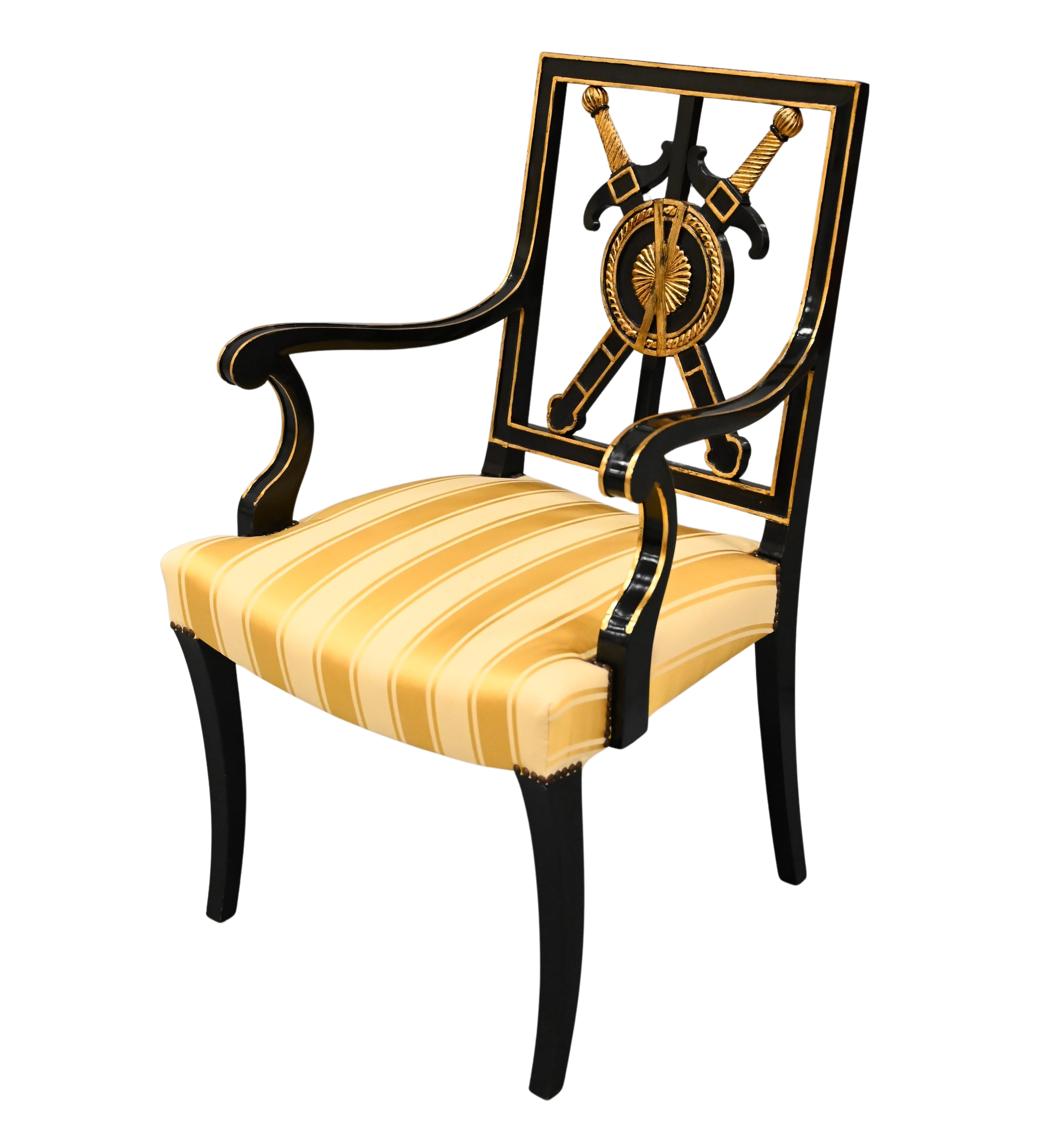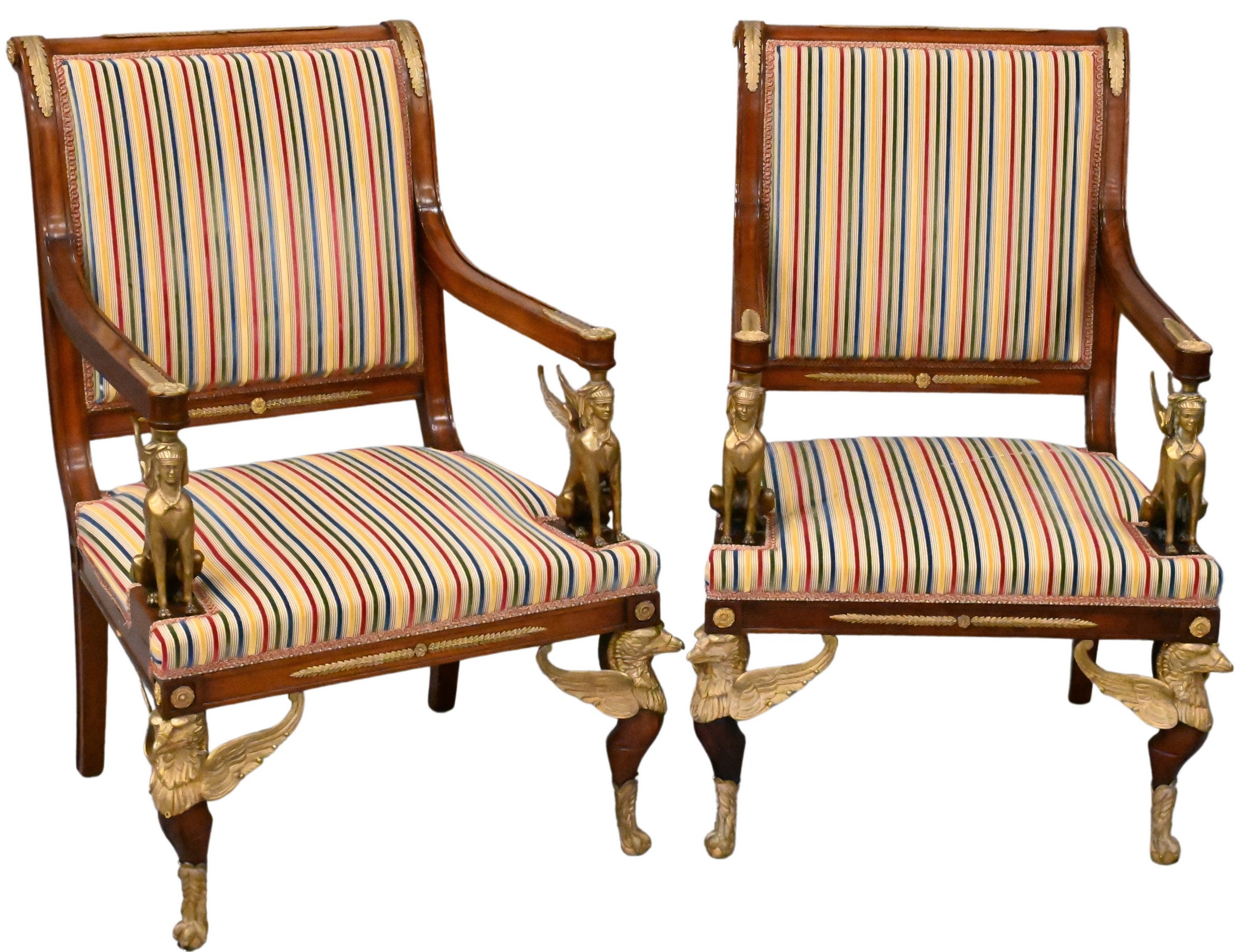having gilt bronze applique and winged sphinx arm supports raised on eagle motif legs and claw feet, early 19th century