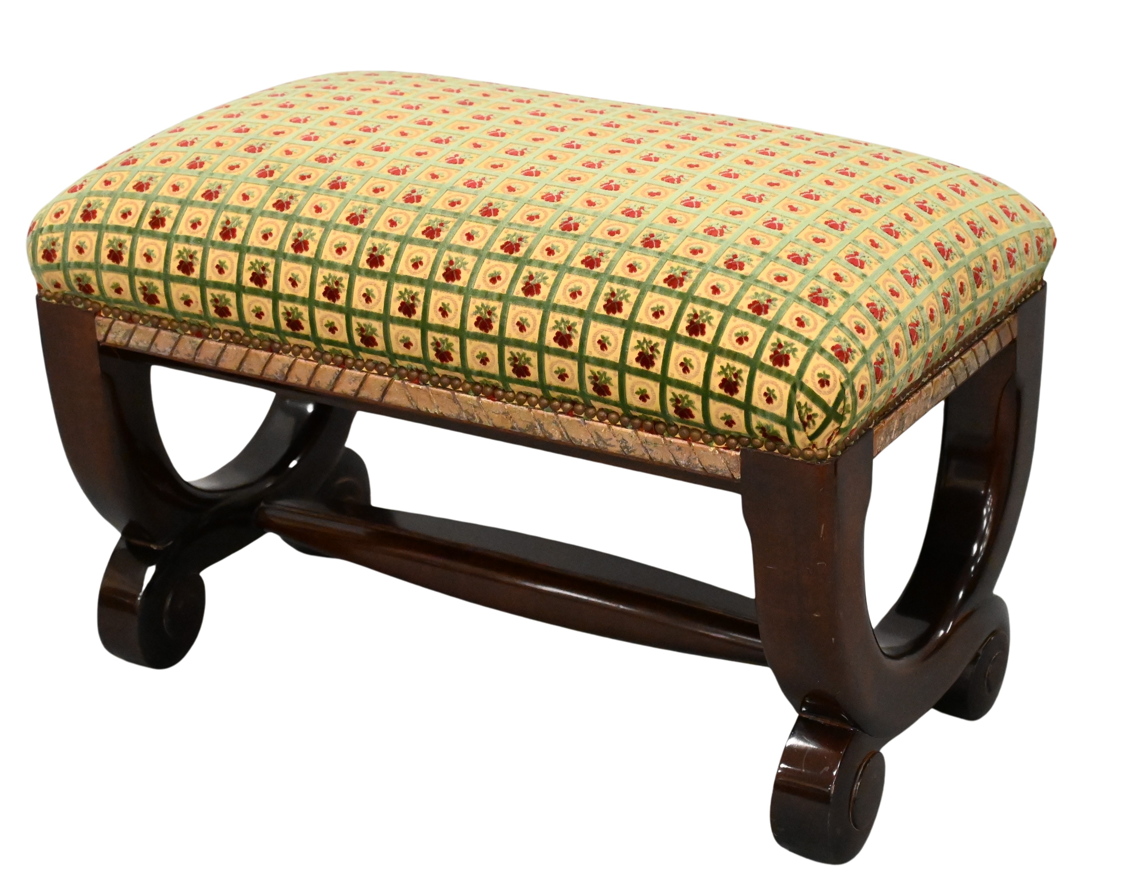 having gilt gadrooned rail, custom upholstered top, and brass tacks