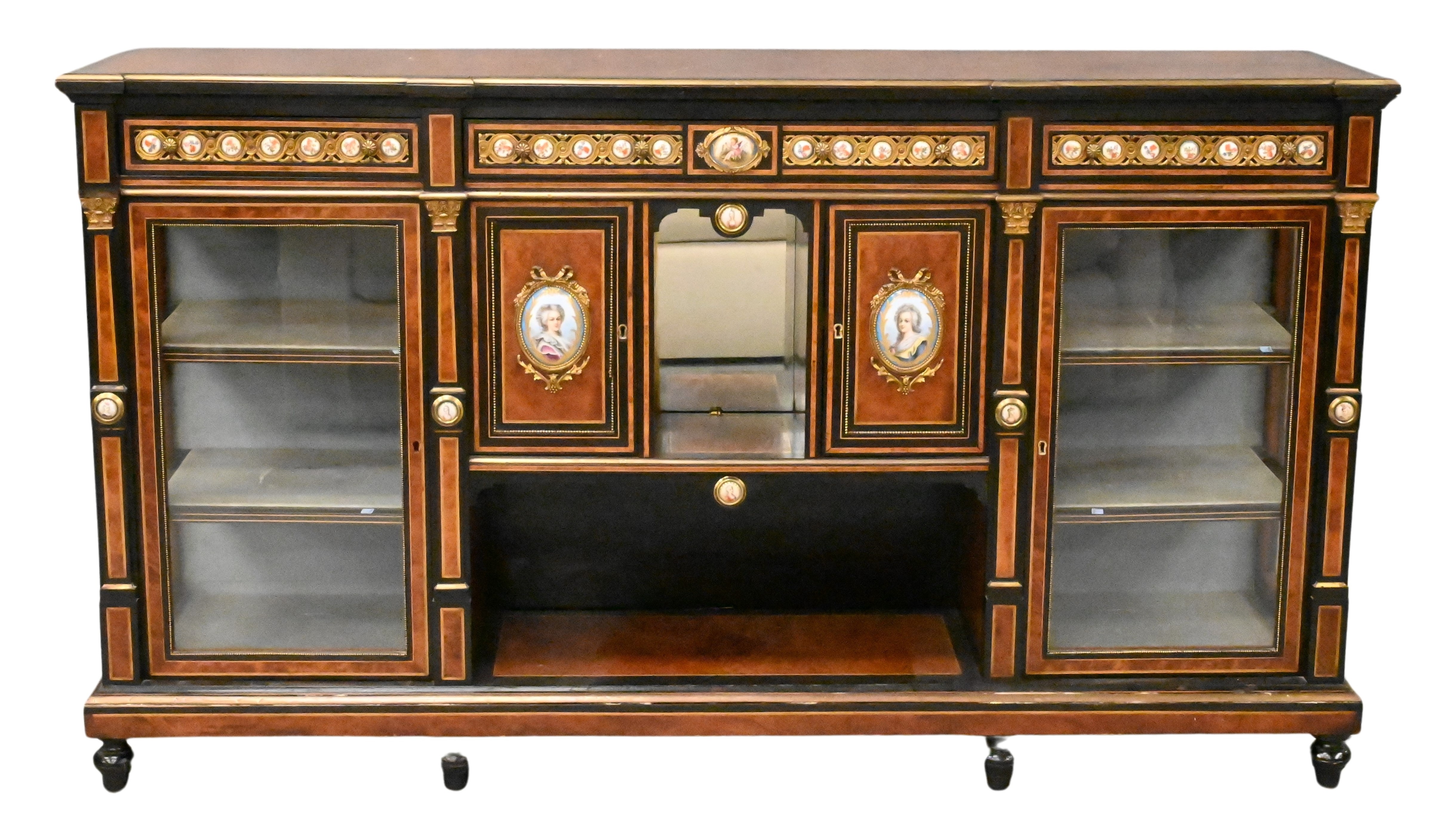 having burlwood top with brass edges over three drawers with painted porcelain round plaques, over four burlwood and ebonized doors, with two large porcelain painted plaques, all with bronze trim set on turned legs