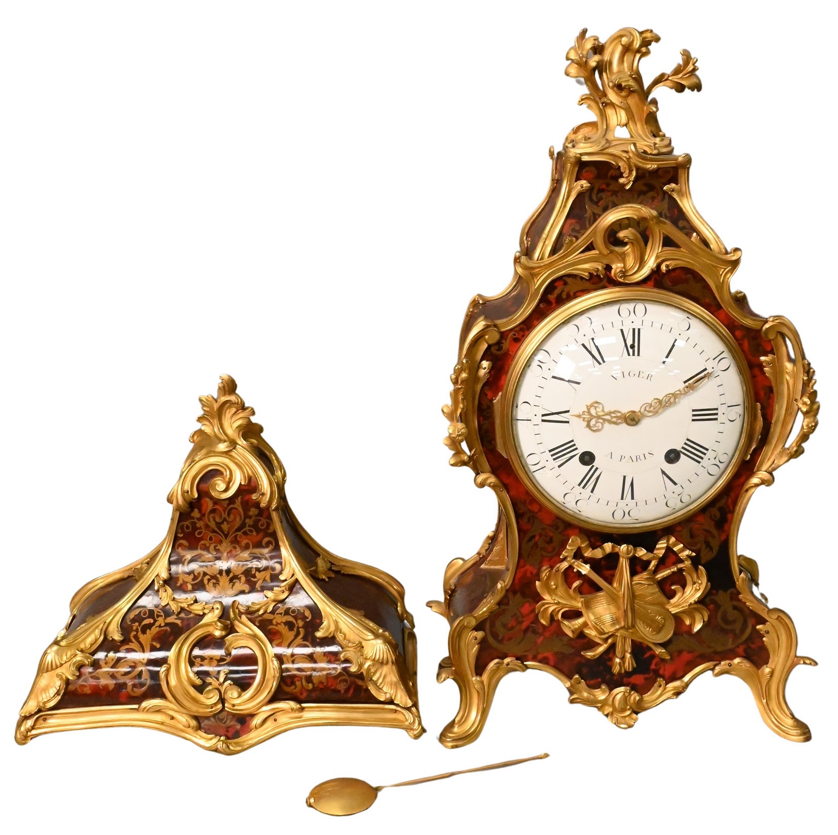 having Boulle case with brass inlays, gilt bronze mounts, white dial marked Viger A Paris, along with shelf
