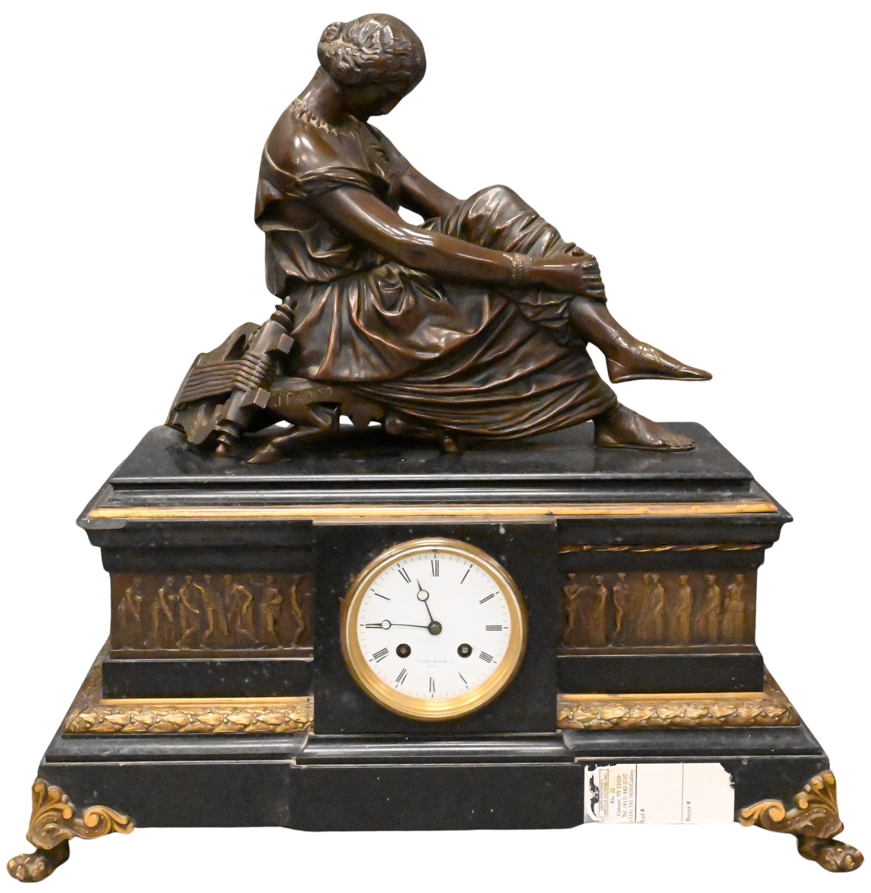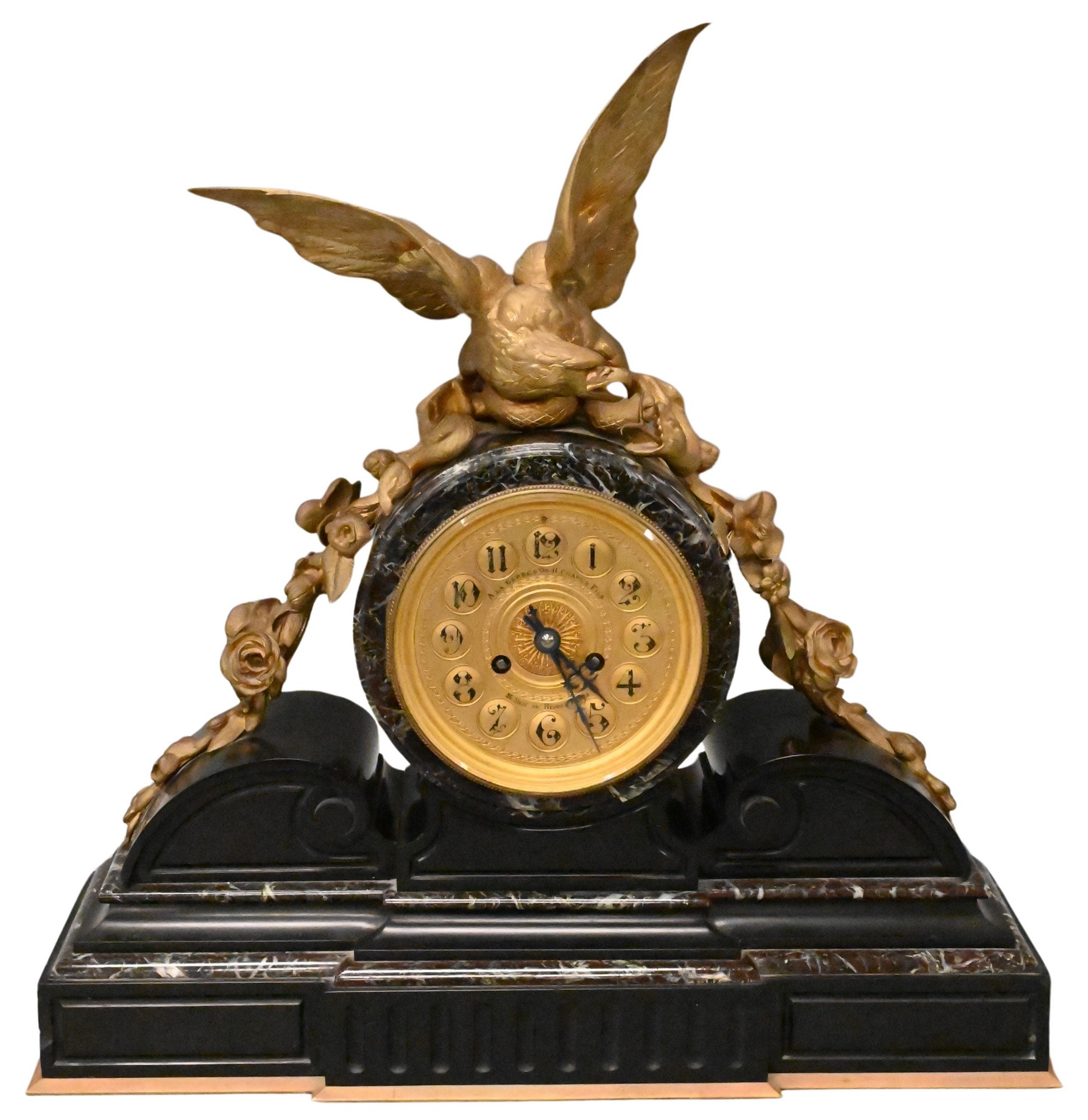 having gilt ormolu oore bronze figural eagle and snake finial with floral garland mounted on black slate, marble base, circular clock dial marked A La Gerbe D OR-H Chapus Fils, 86 Rue De Rivoli Paris, clock works marked La Gerbe Chapus