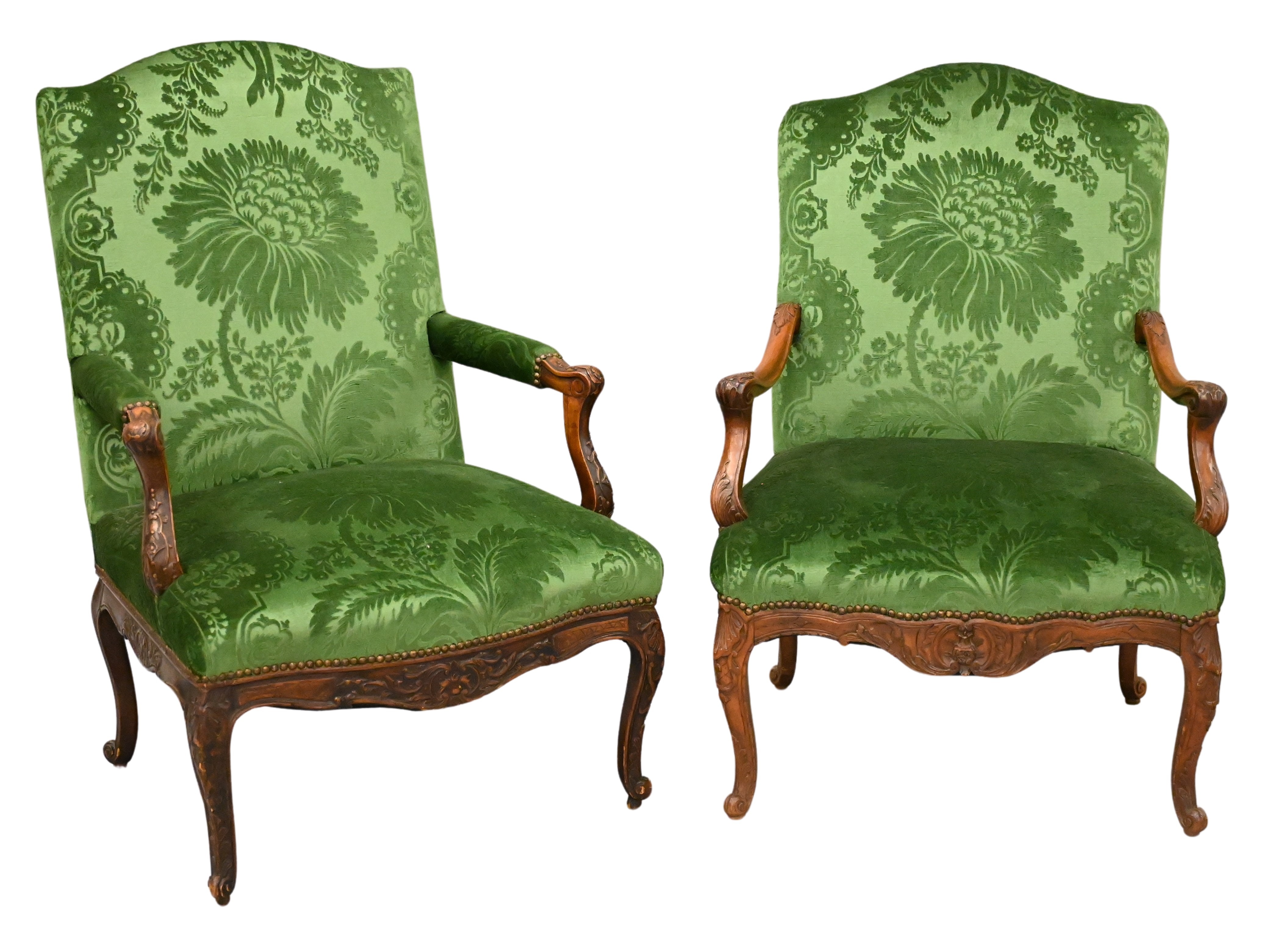 having green velour upholstery with carved arms over carved framed and cabriole legs, one is pinned, 18th/19th century