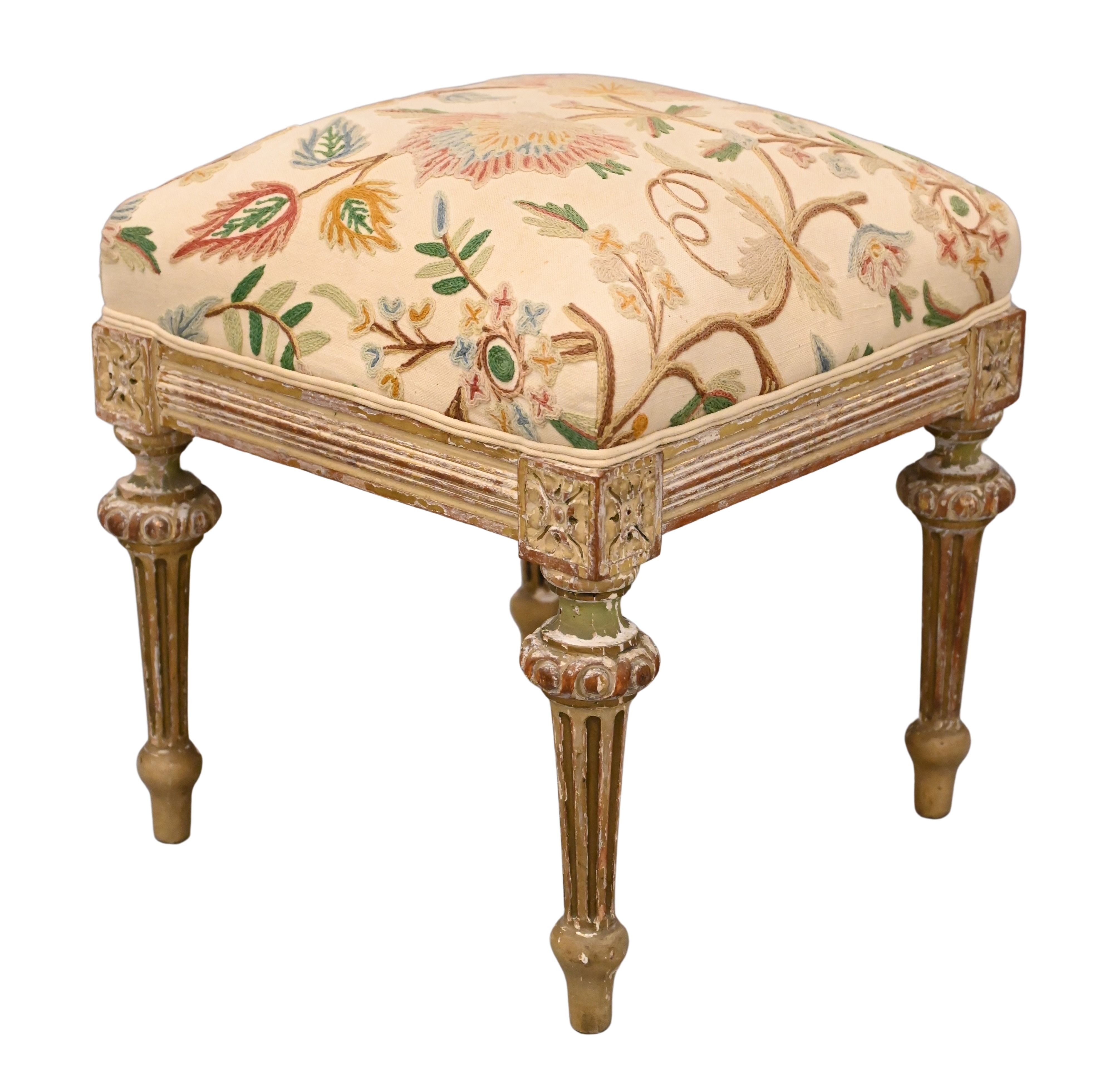 having green and gray painted and parcel gilt, covered in machine crewel work on cream cotton ground all raised on fluted legs, 19th century