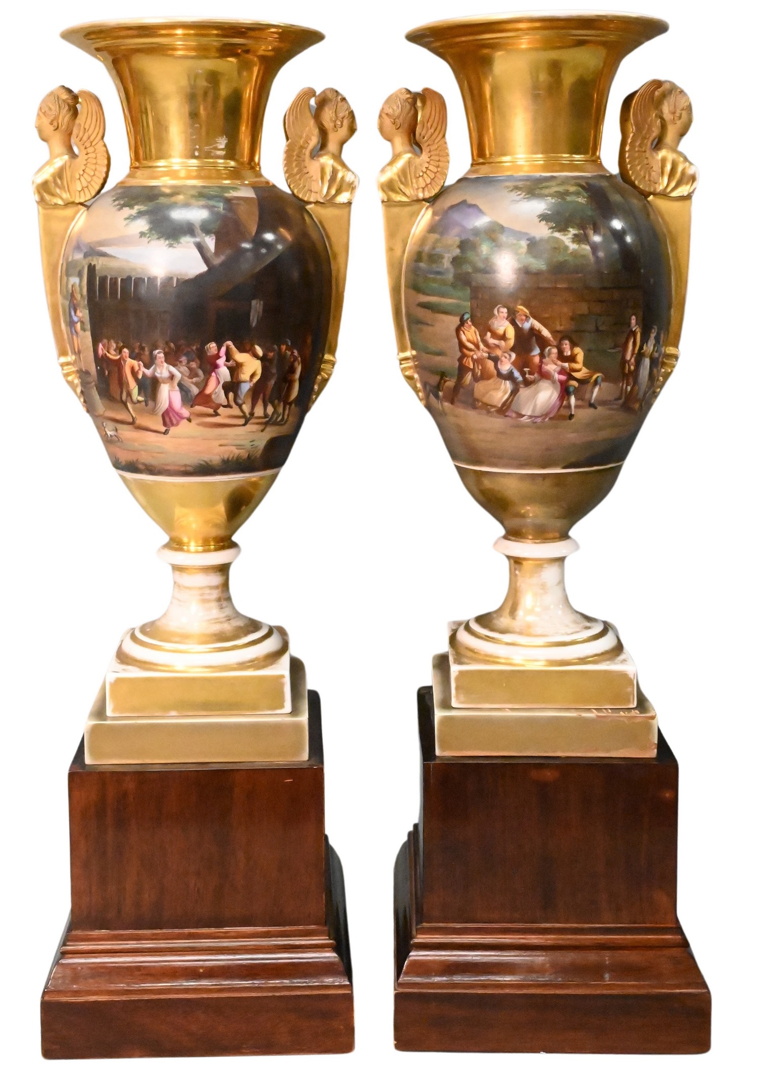ovoid body having gilt winged female, caryatid handles, each having hand painted courting and dinner landscape scenes on square gilt base, all raised on square wood base, 19th century