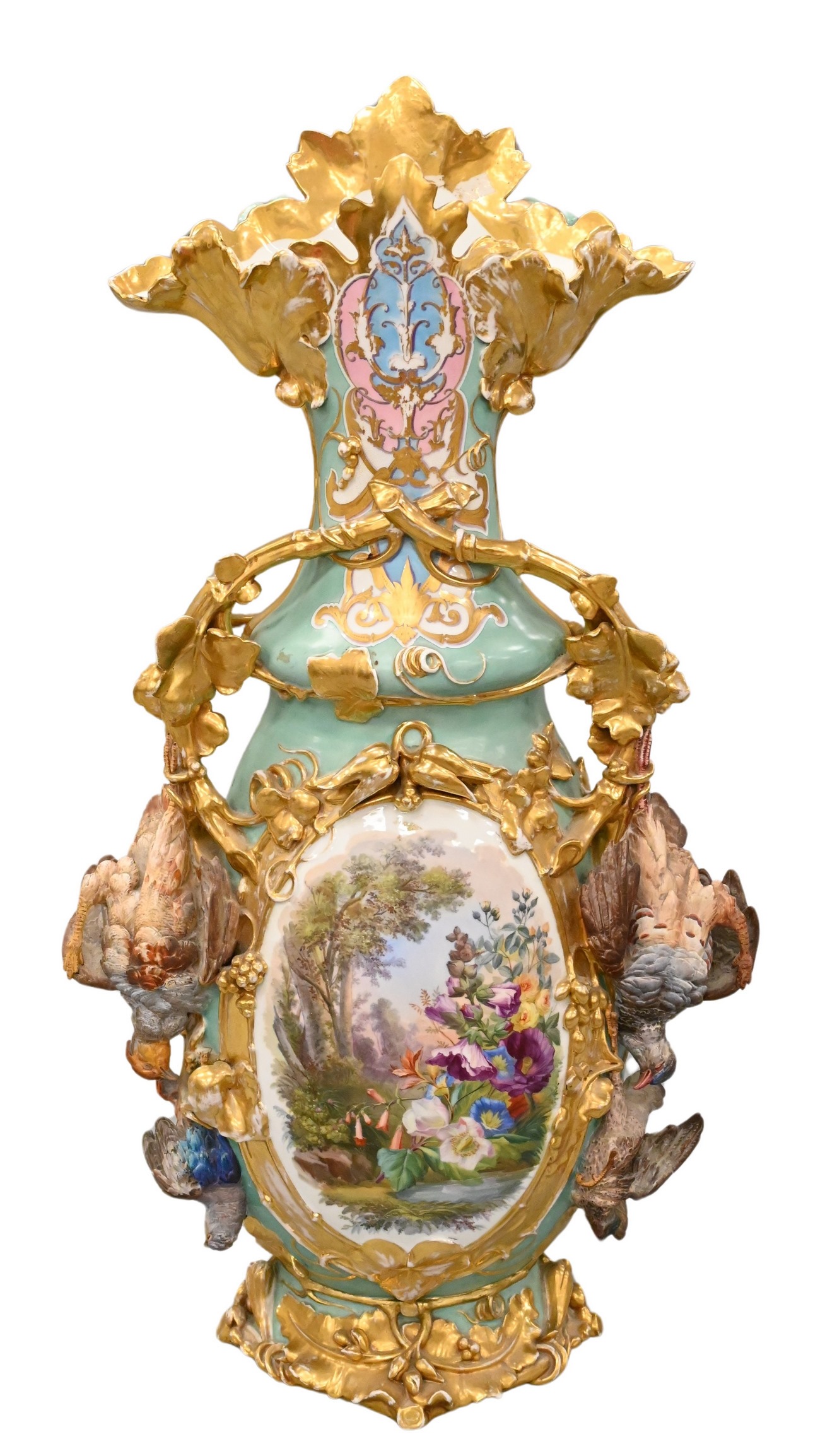 gilt decorated, oval painted panel flanked by unglazed porcelain birds