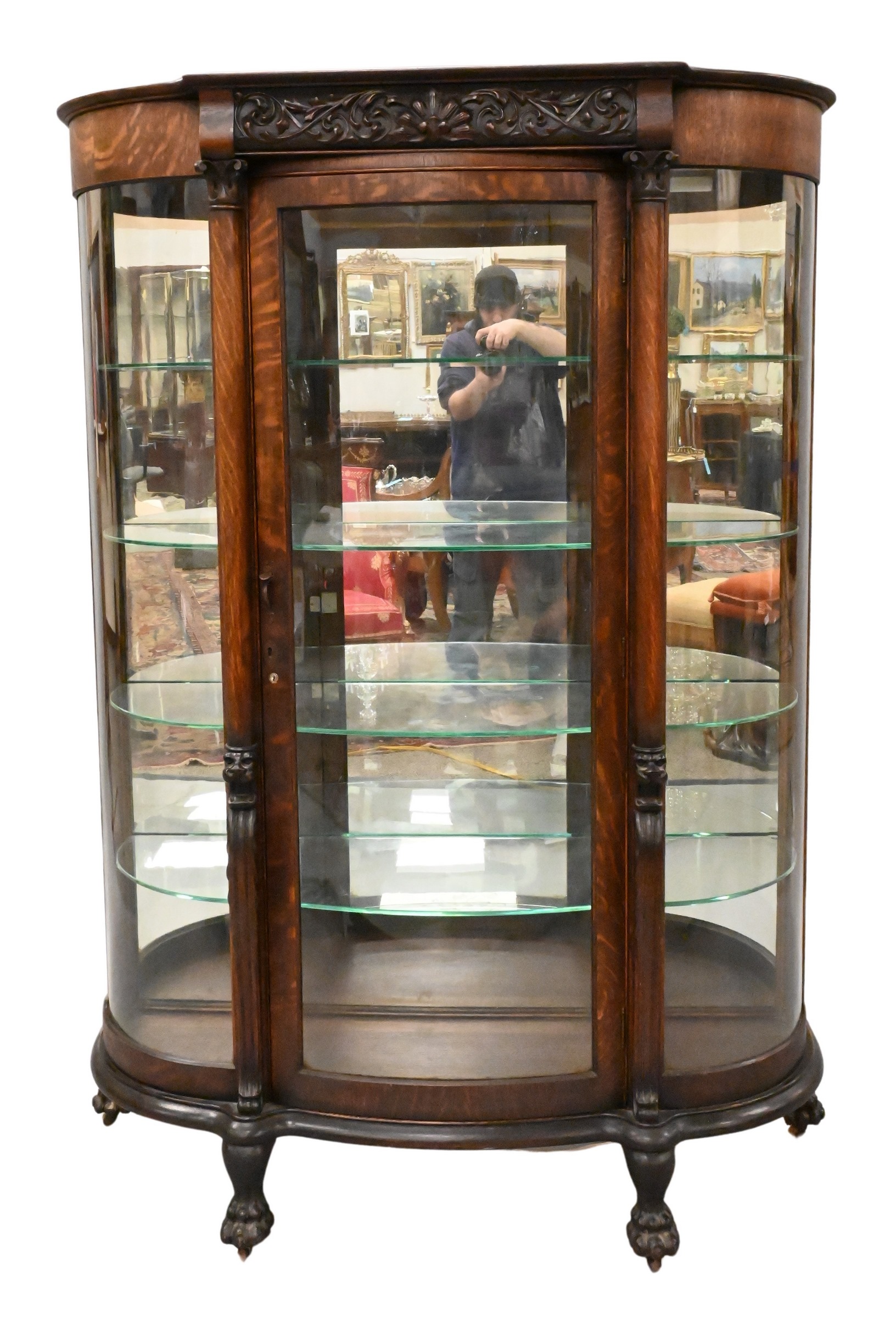 having carved top and lion heads set on paw feet, sides and front having bowed glass with glass shelves