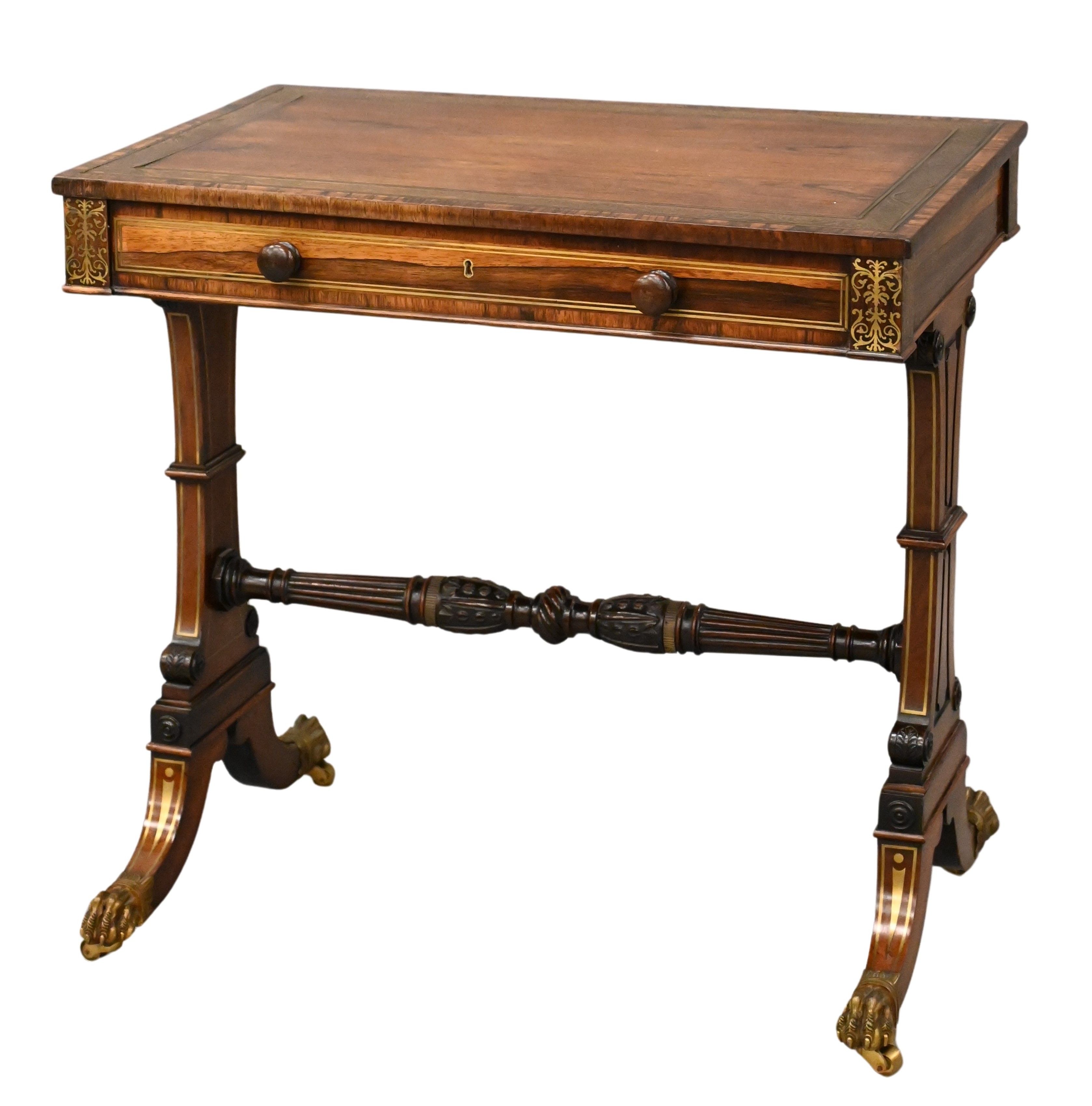 having inlaid brass top and supports over drawer, set on four downswept members and brass paw feet, having carved and turned stretcher