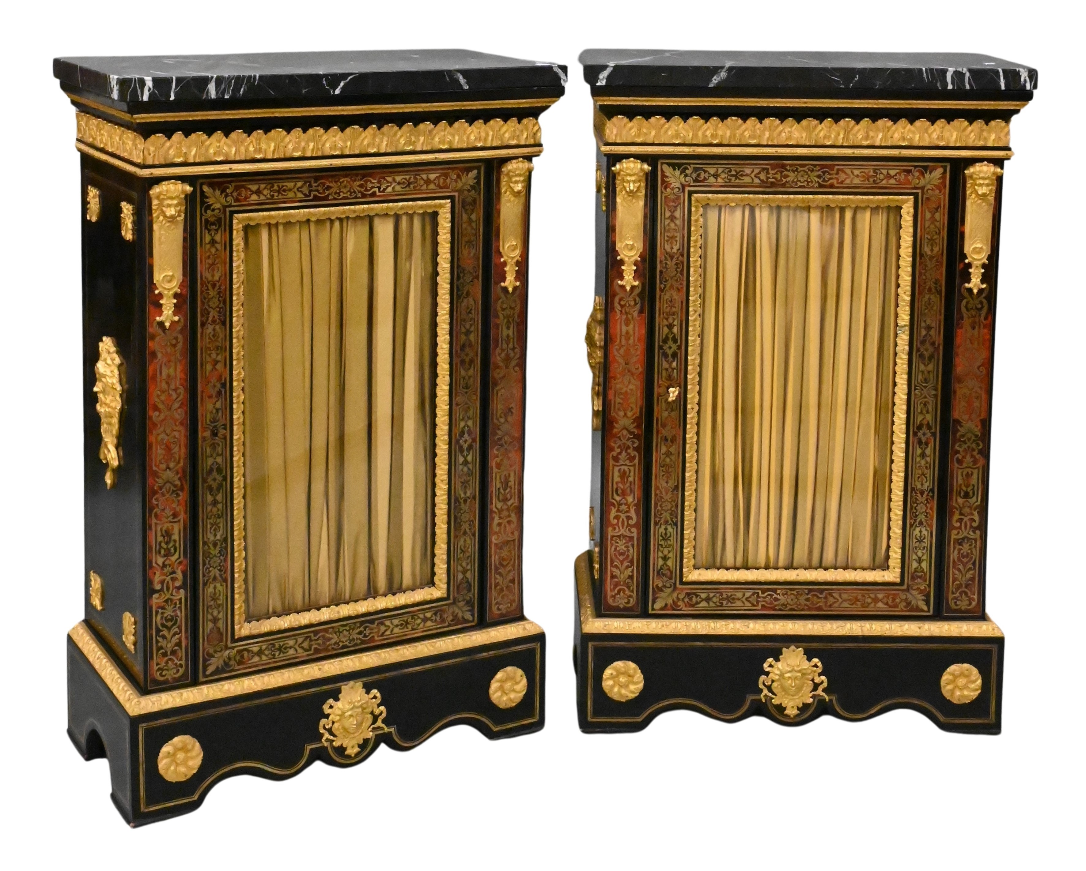 in the style of Andre-Charles Boulle (1642-1732), having striated black marble tops, over gilt bronze mounted cabinet with glass door and curtain surrounded and flanked by boulle and gilt bronze lion masks on sides, 19th century