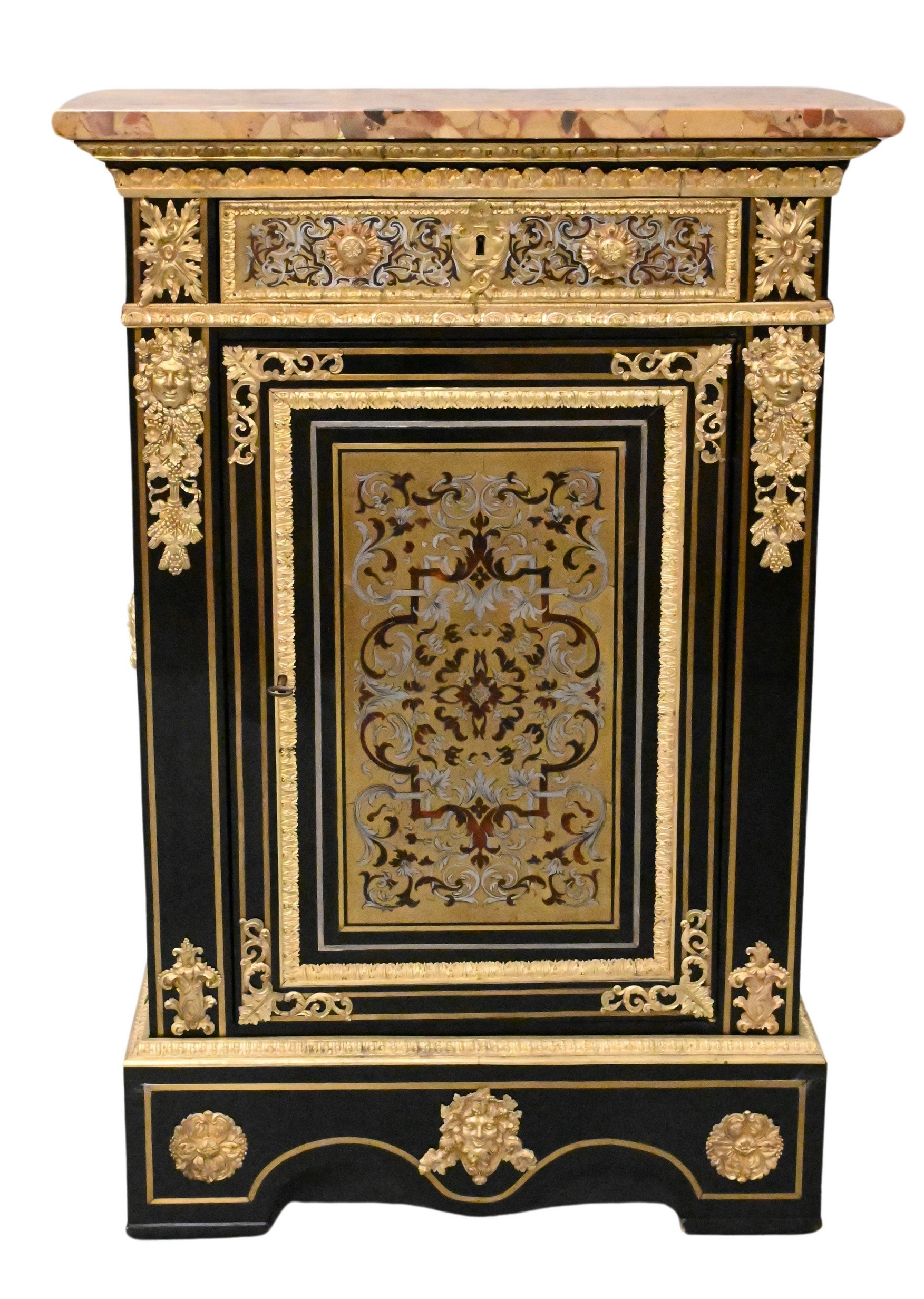 having gilt bronze mounts and Breche D’Alep marble top over drawer and door, gilt bronze lion masks on sides, 19th century