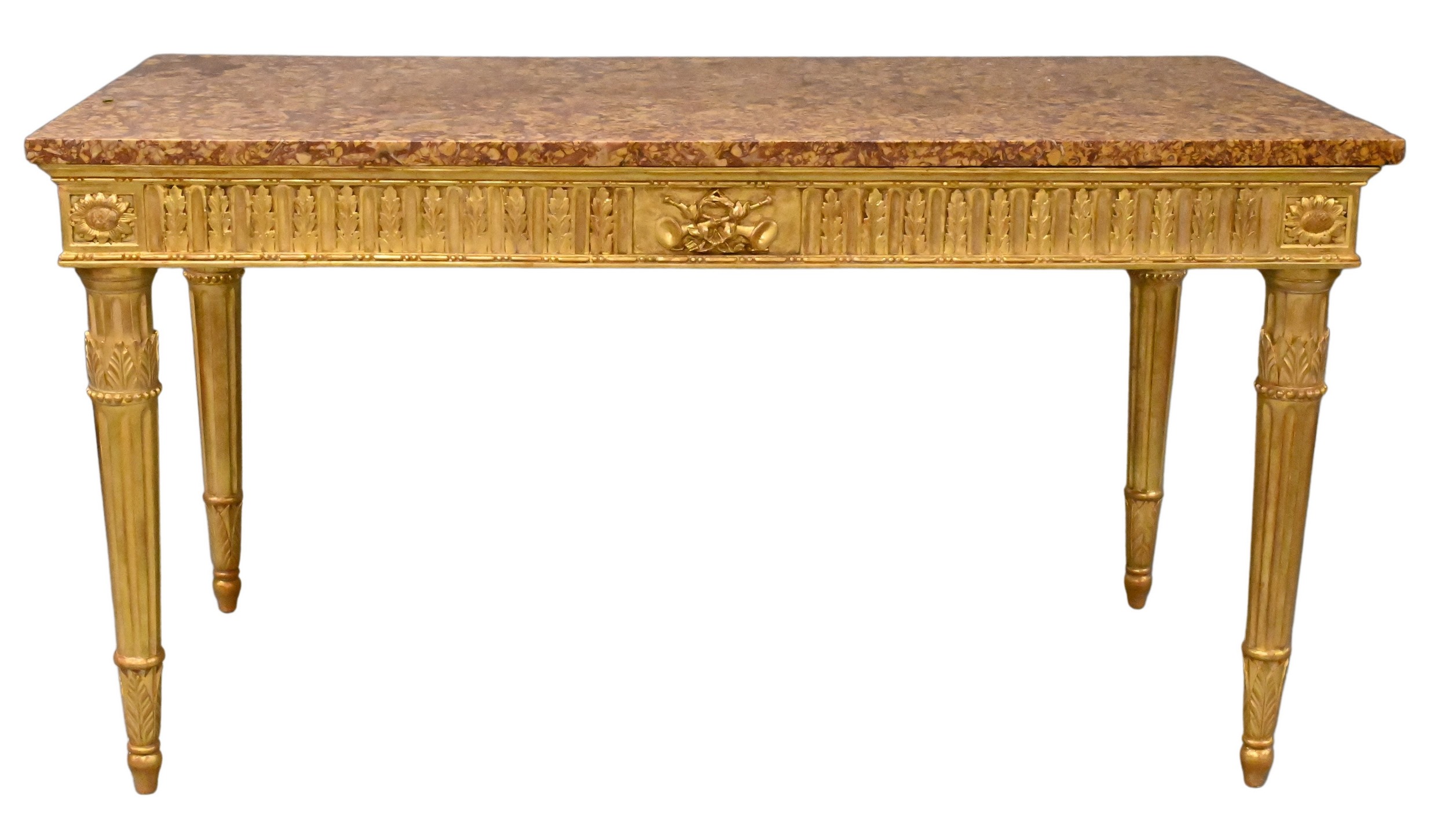 having anthemion leaf frieze, raised on tapering fluted column legs, with a rouge/jaune marble top