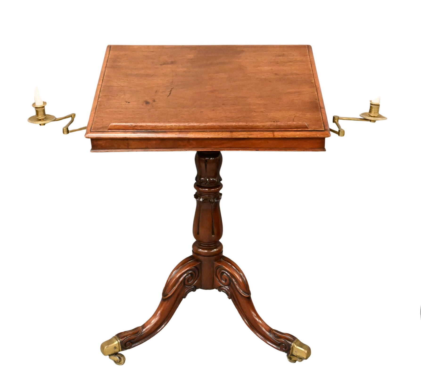 flanked by adjustable candle holders on carved base set on three downswept members having brass feet and wheels, 19th century