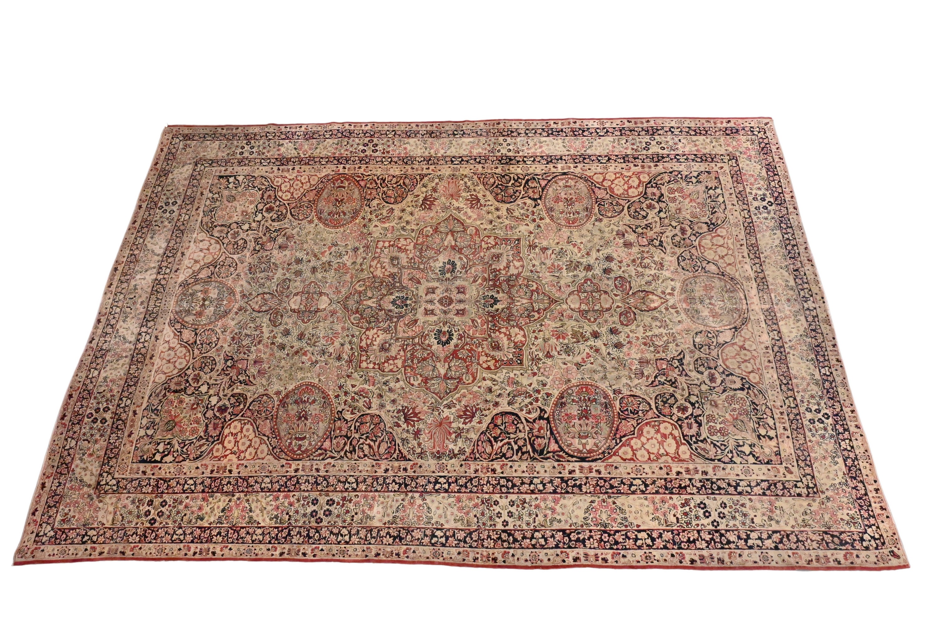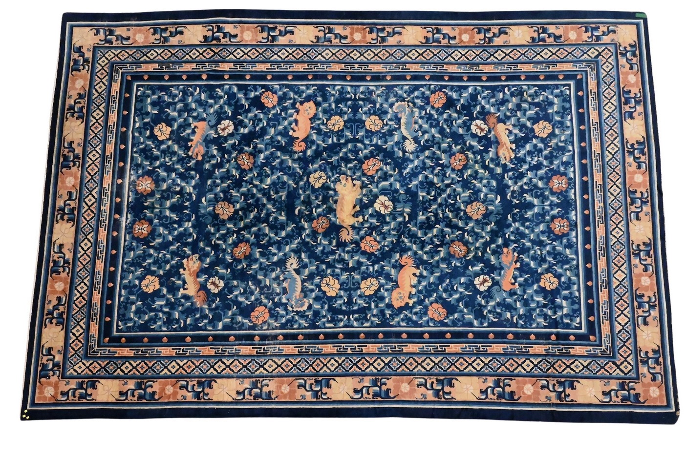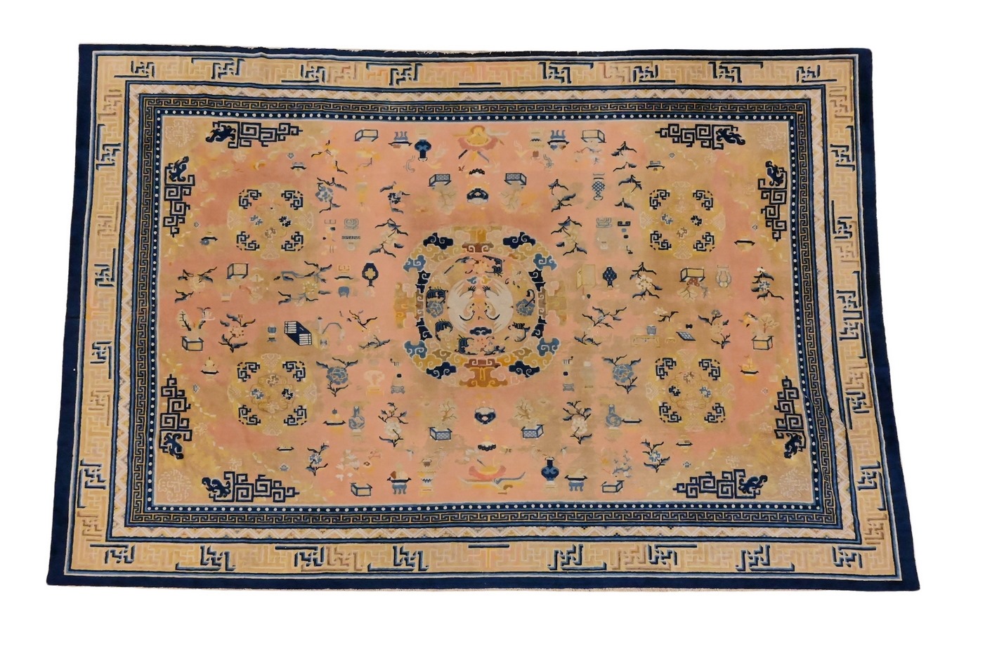 pale terracotta, having blue, taupe, gold, coral, and cream-ground border, with Hundred Antique motifs, Northwest China circa 1900