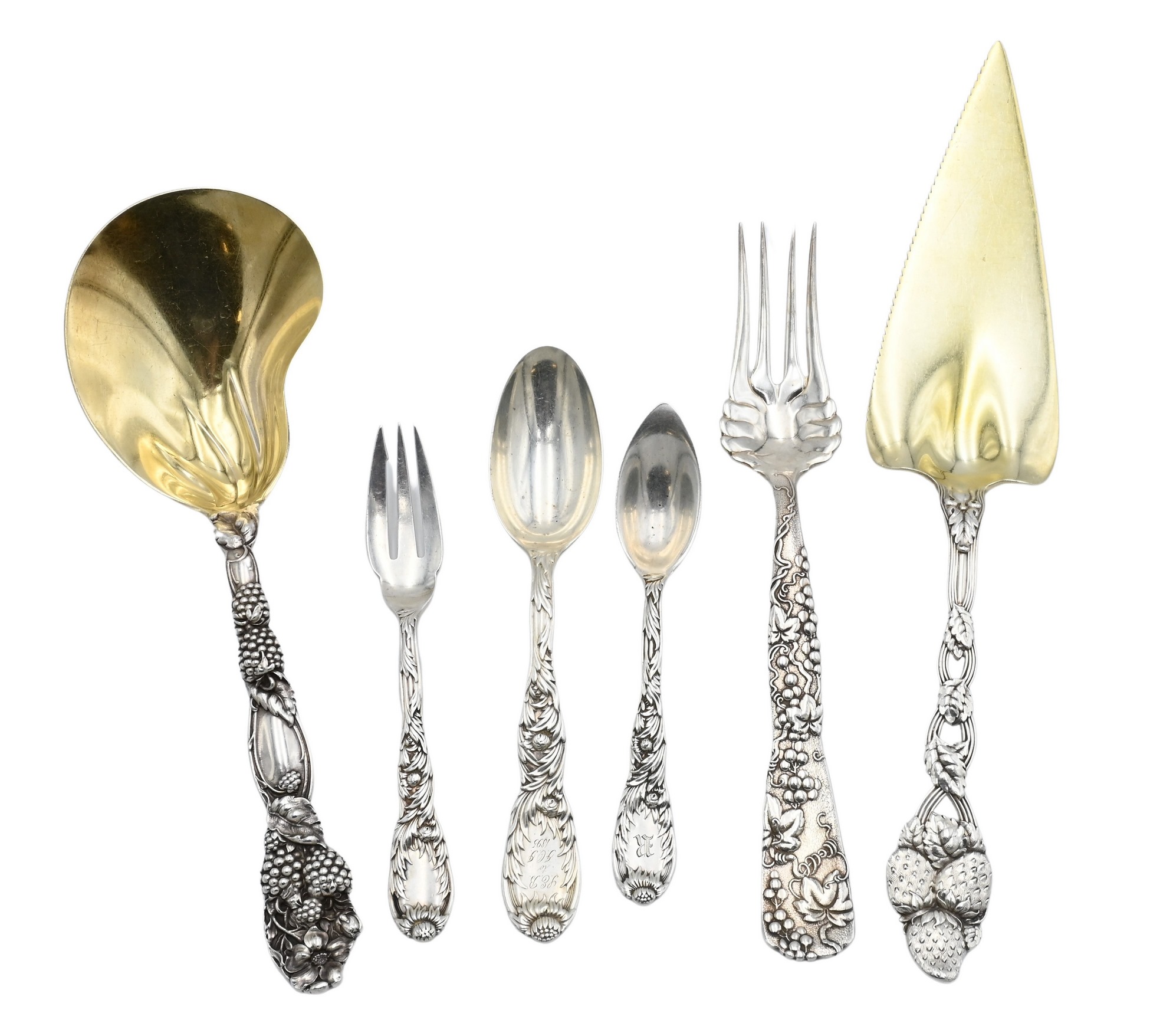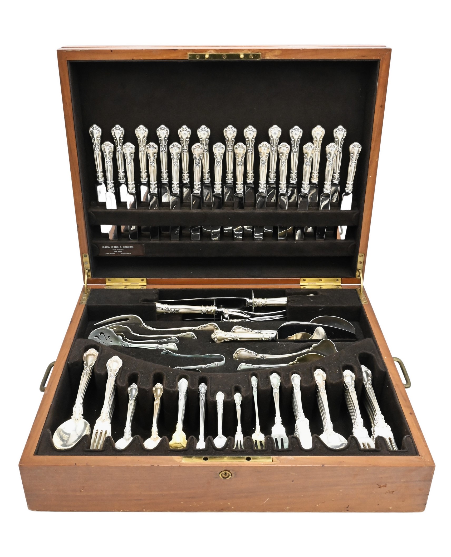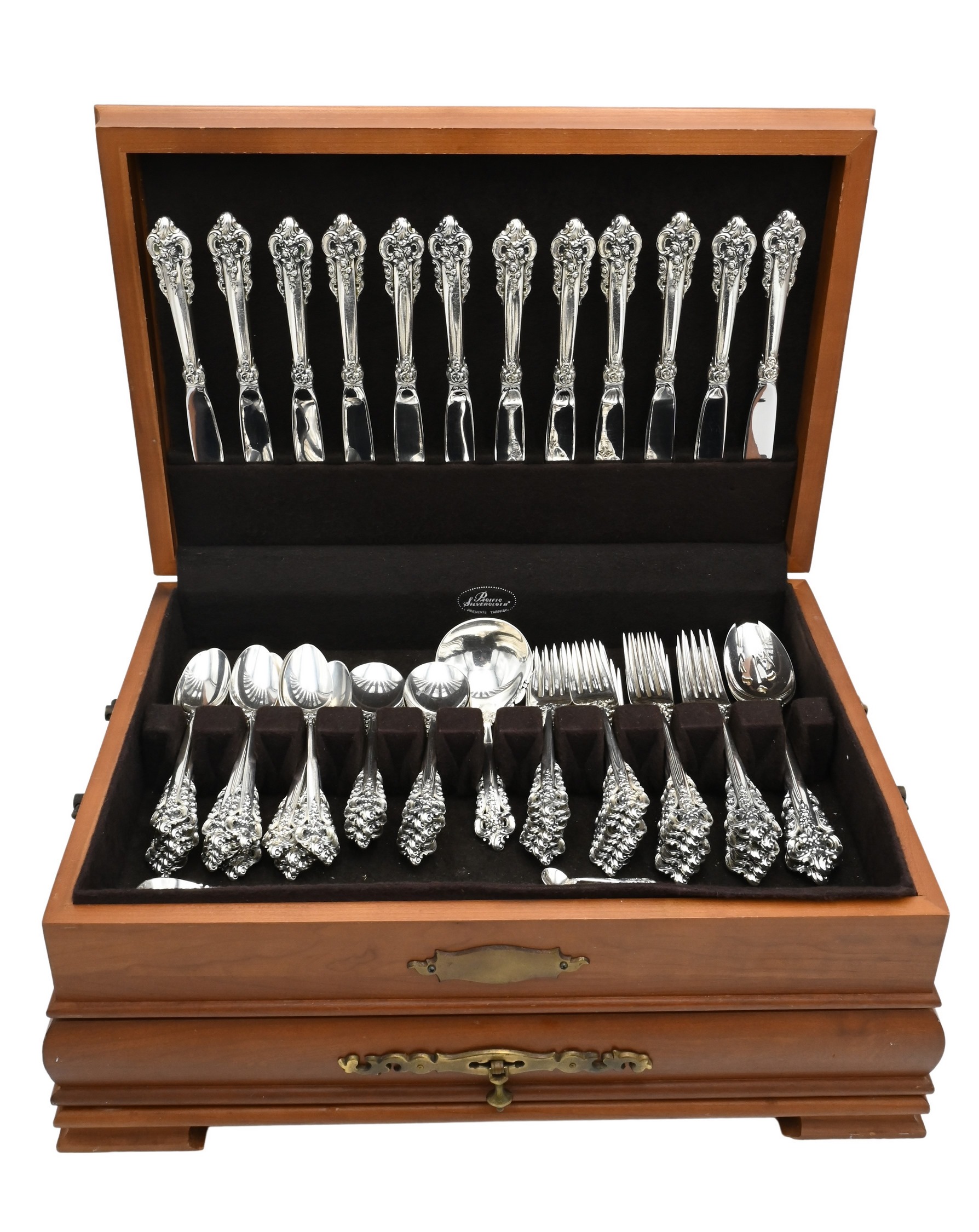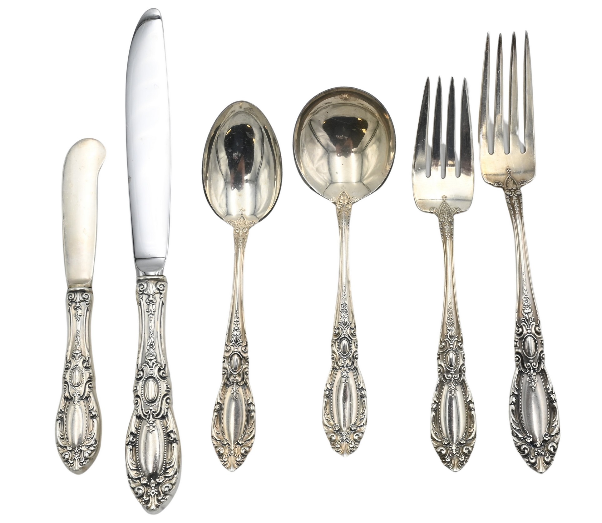 in custom fitted case, to include 10 dinner forks, 12 luncheon forks, 12 salad forks, 12 ice cream forks, one lemon fork, one cake/dessert fork, one olive/pickle fork, one large serving fork, one fish spoon, 12 cocktail forks, 11 soup spoons, 12 teaspoons, 12 demitasse spoons, one large serving spoon, three place spoons, one jelly spoon, one ladle, one tong, 12 dinner knives, 12 luncheon knives, 12 butter knives, one slotted server, one sugar spoon, one cheese server, one cake server, one steak carver, one steak fork, one roast carver, one roast fork, all marked for Gorham