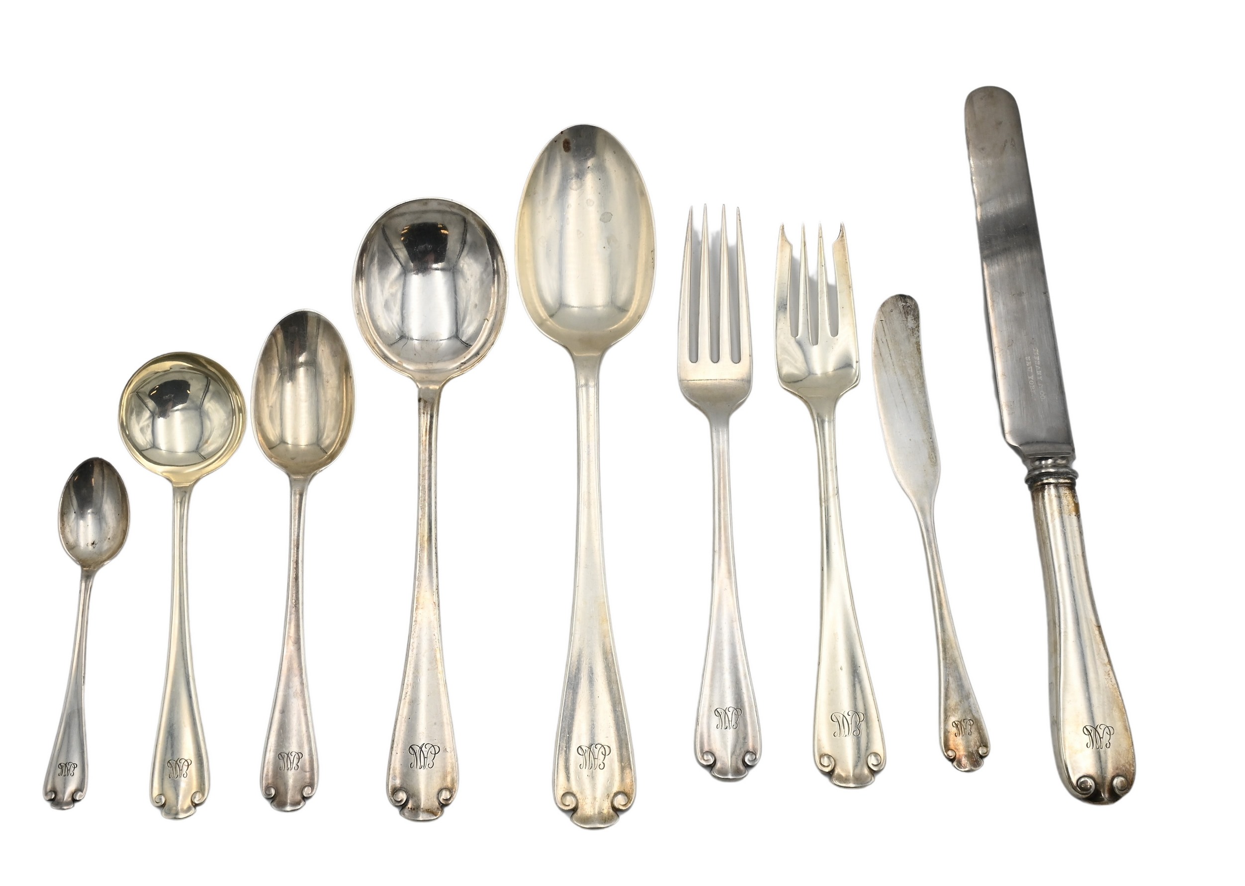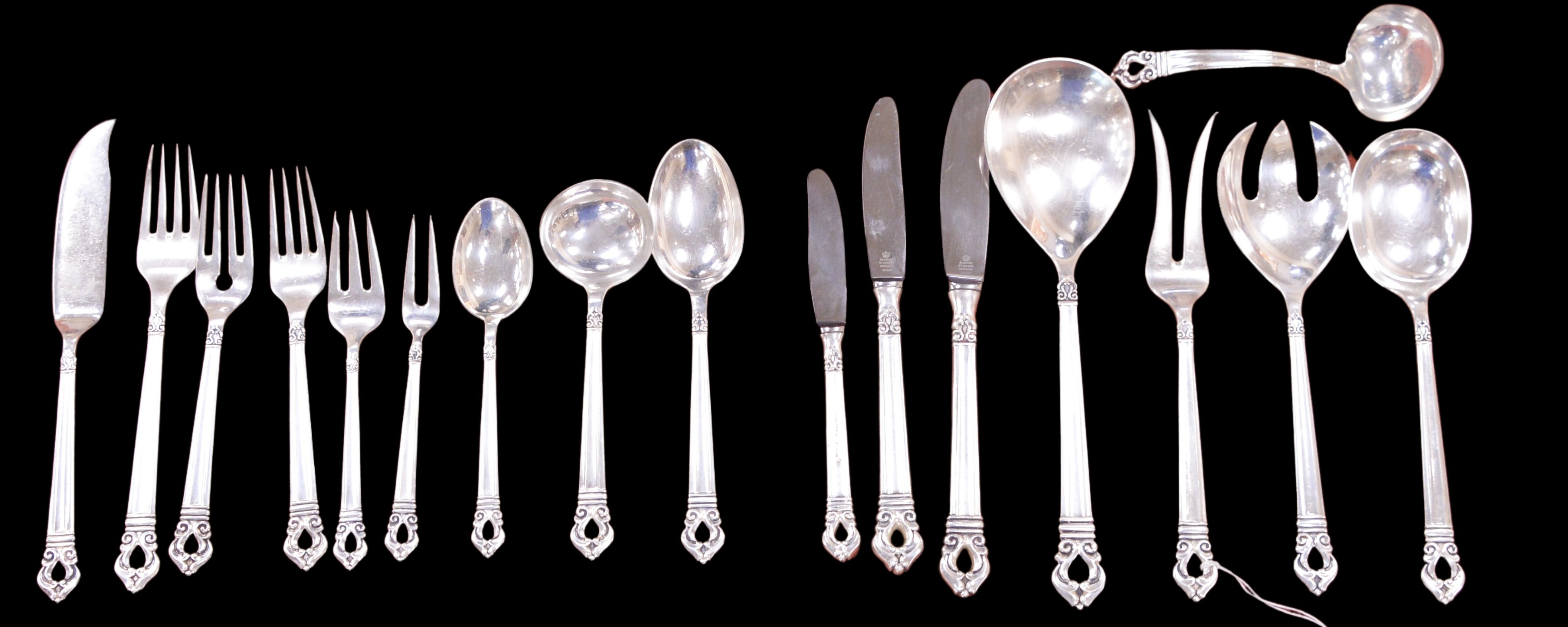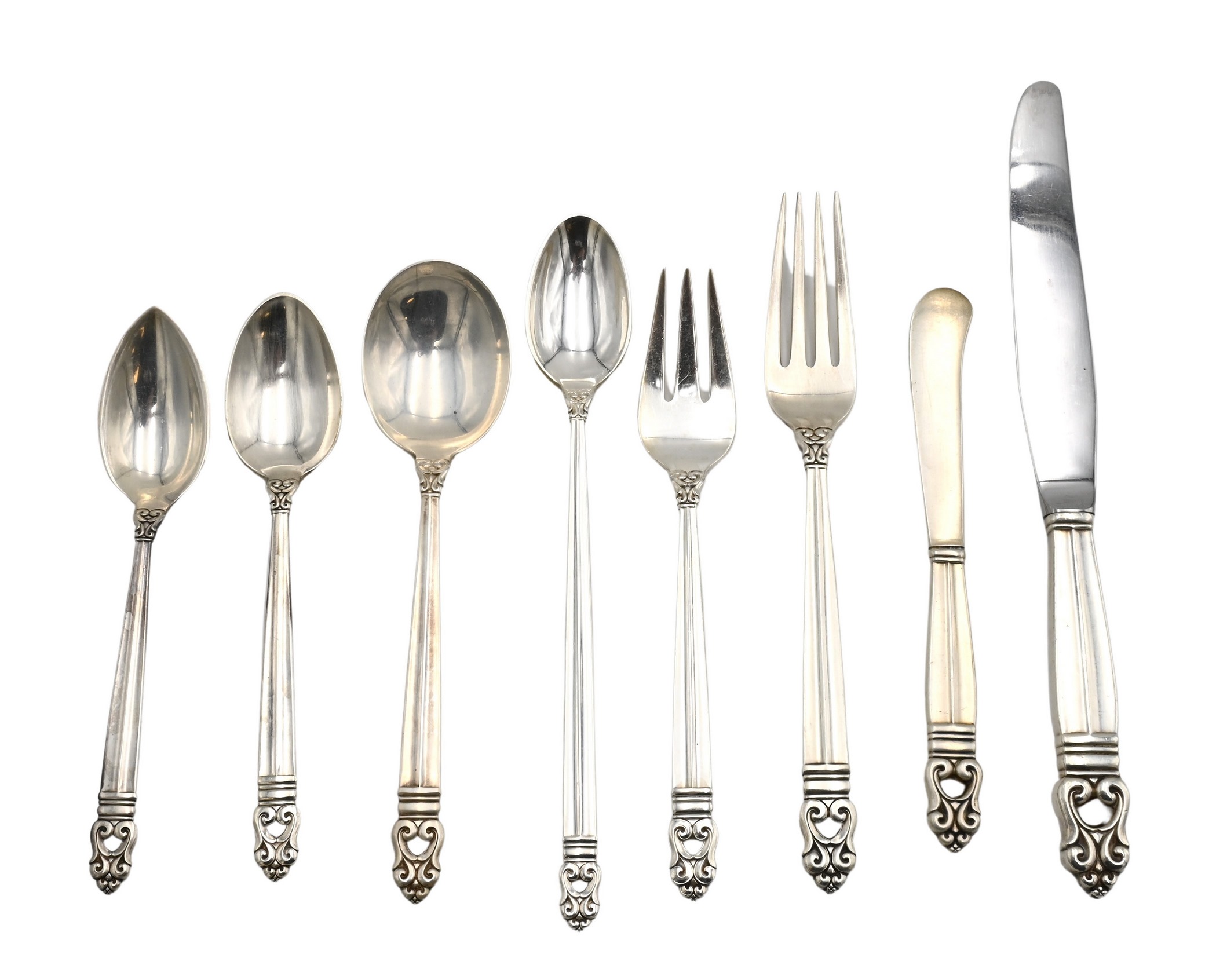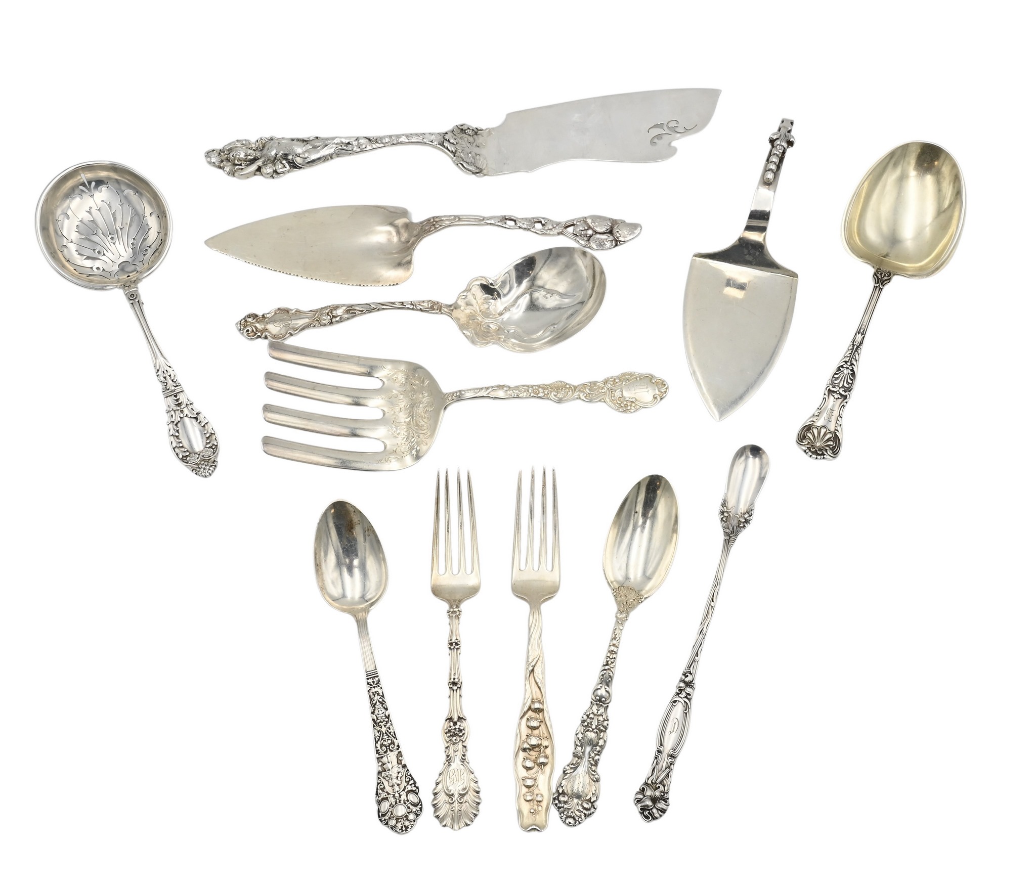 in custom fitted case, to include 10 dinner forks, 12 luncheon forks, 12 salad forks, 12 ice cream forks, one lemon fork, one cake/dessert fork, one olive/pickle fork, one large serving fork, one fish spoon, 12 cocktail forks, 11 soup spoons, 12 teaspoons, 12 demitasse spoons, one large serving spoon, three place spoons, one jelly spoon, one ladle, one tong, 12 dinner knives, 12 luncheon knives, 12 butter knives, one slotted server, one sugar spoon, one cheese server, one cake server, one steak carver, one steak fork, one roast carver, one roast fork, all marked for Gorham