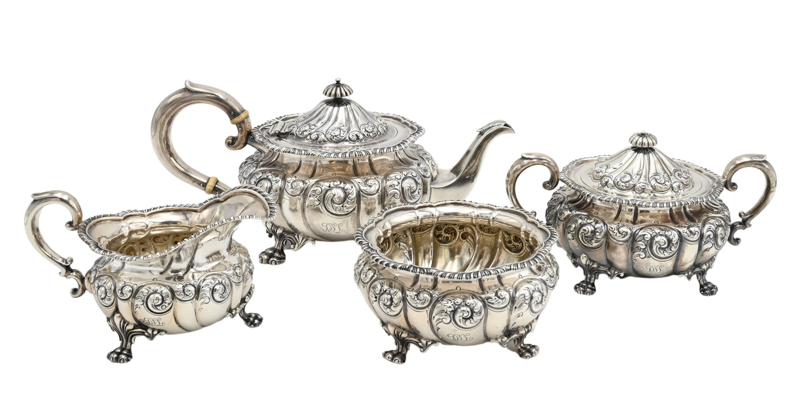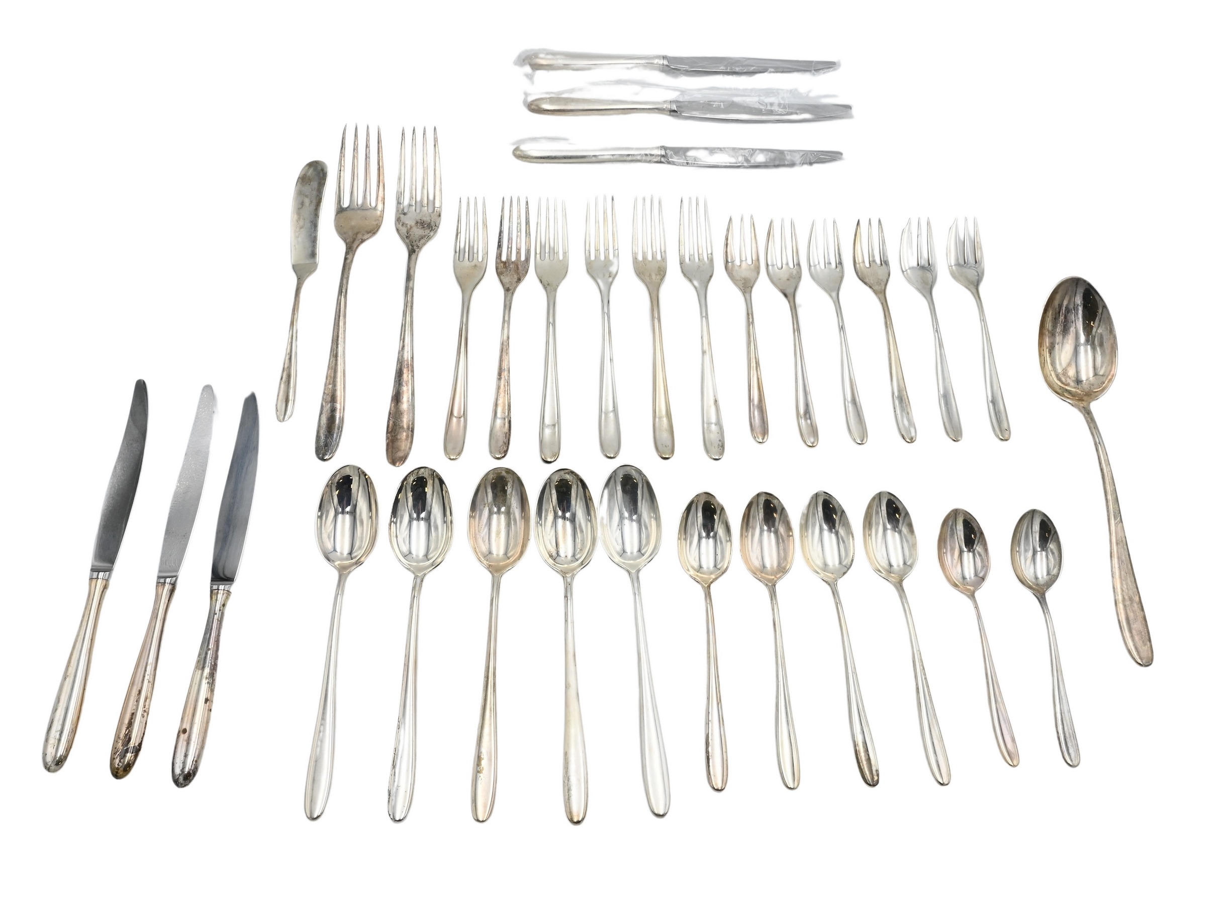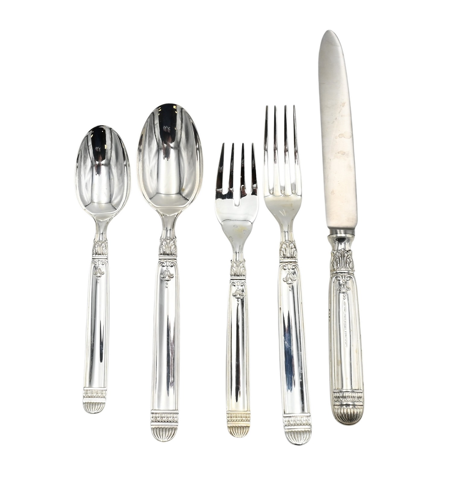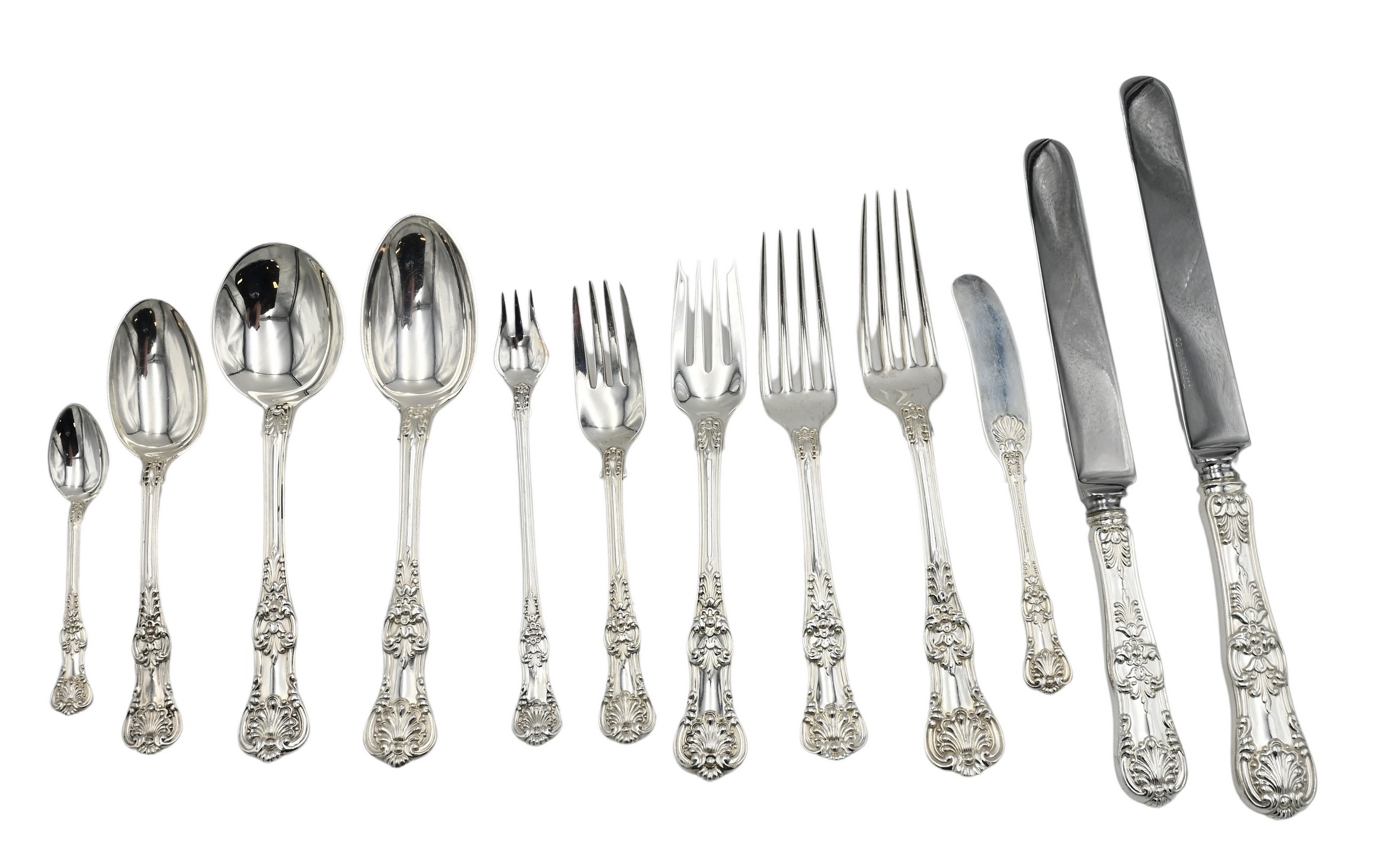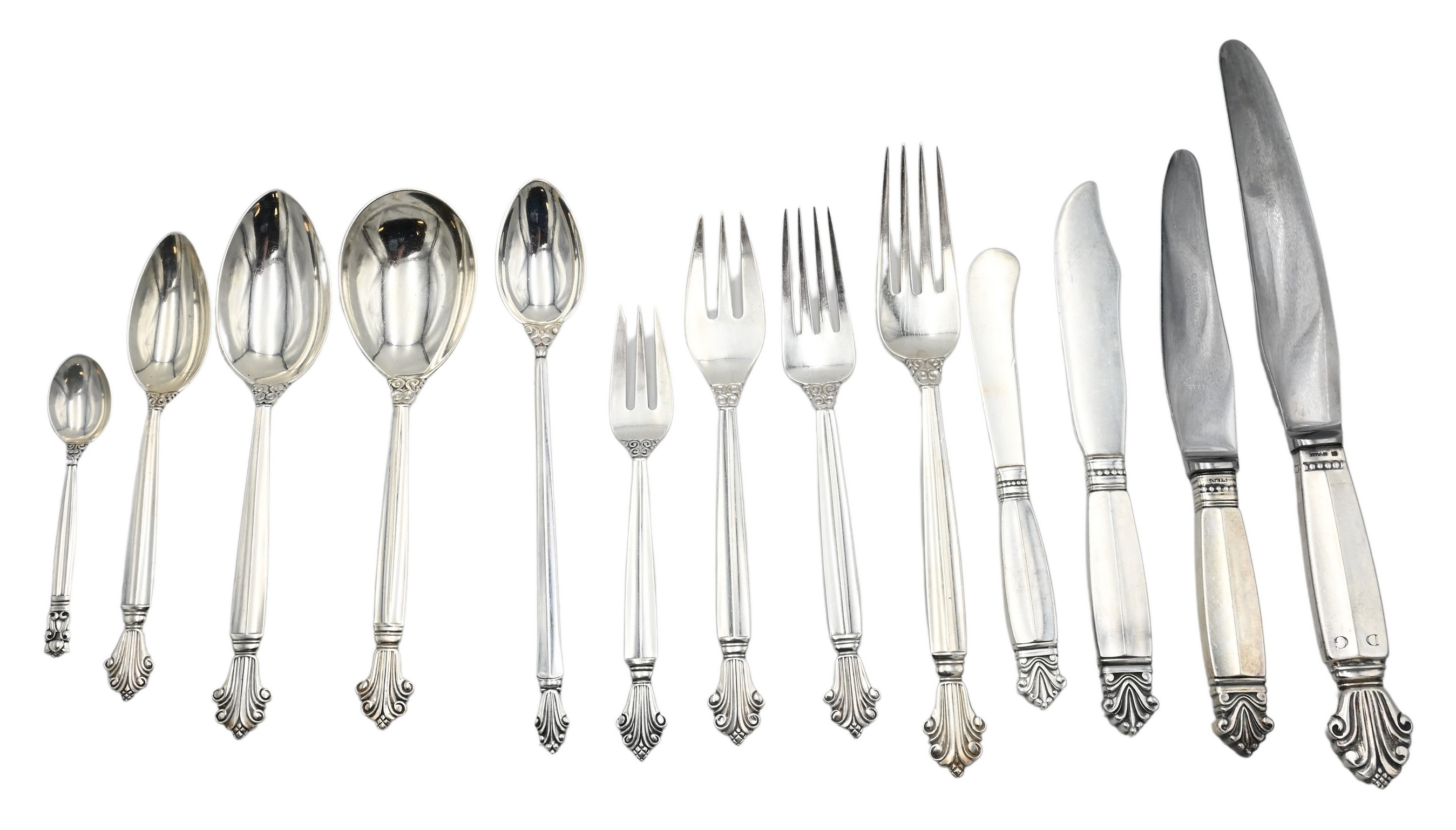 in custom fitted case, to include 10 dinner forks, 12 luncheon forks, 12 salad forks, 12 ice cream forks, one lemon fork, one cake/dessert fork, one olive/pickle fork, one large serving fork, one fish spoon, 12 cocktail forks, 11 soup spoons, 12 teaspoons, 12 demitasse spoons, one large serving spoon, three place spoons, one jelly spoon, one ladle, one tong, 12 dinner knives, 12 luncheon knives, 12 butter knives, one slotted server, one sugar spoon, one cheese server, one cake server, one steak carver, one steak fork, one roast carver, one roast fork, all marked for Gorham
