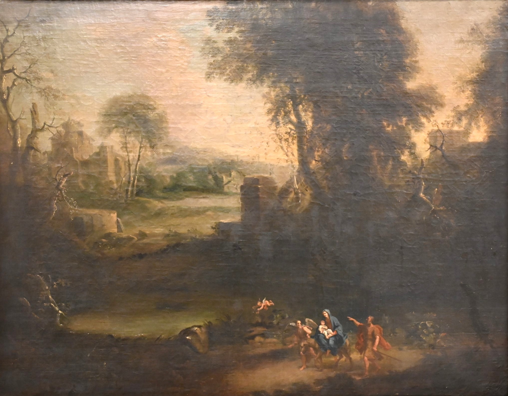 Flight into Egypt, with the Holy Family in foreground being guided by winged angels and a cherub