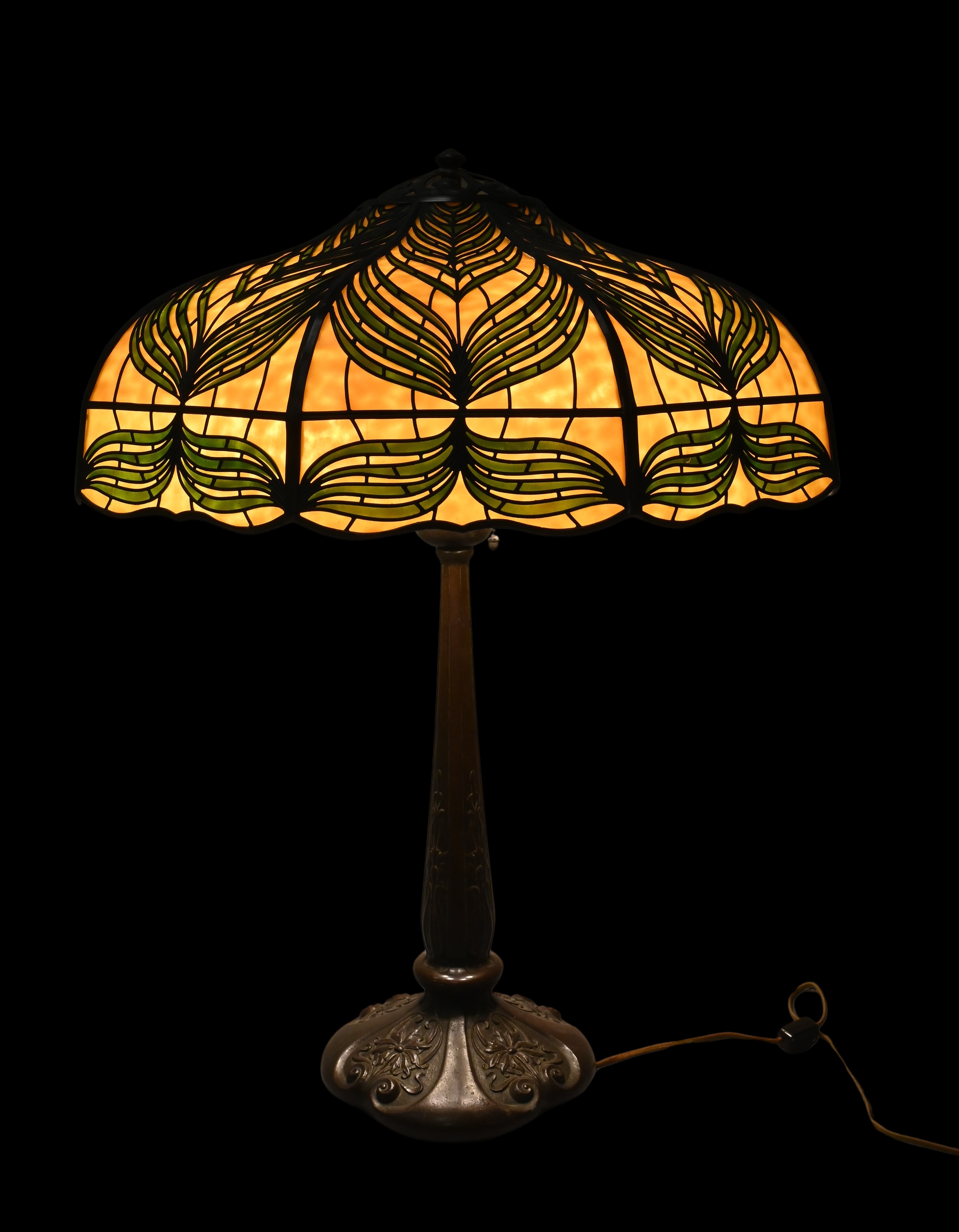 having beige field with green highlights, eight sided with peacock feather motif slag glass and metal overlay on bronze slight base marked Handel