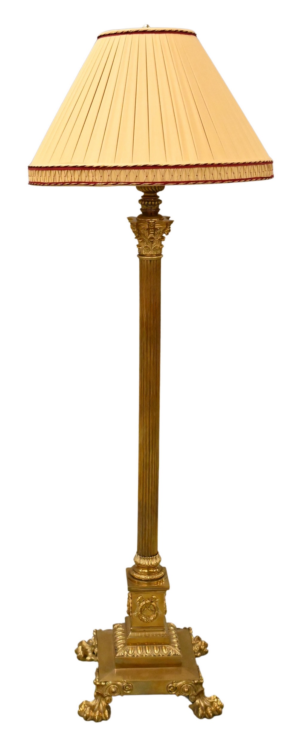 made from a large candlestick having a Corinthian column on multiple square bases, set on large paw feet, having custom silk shade