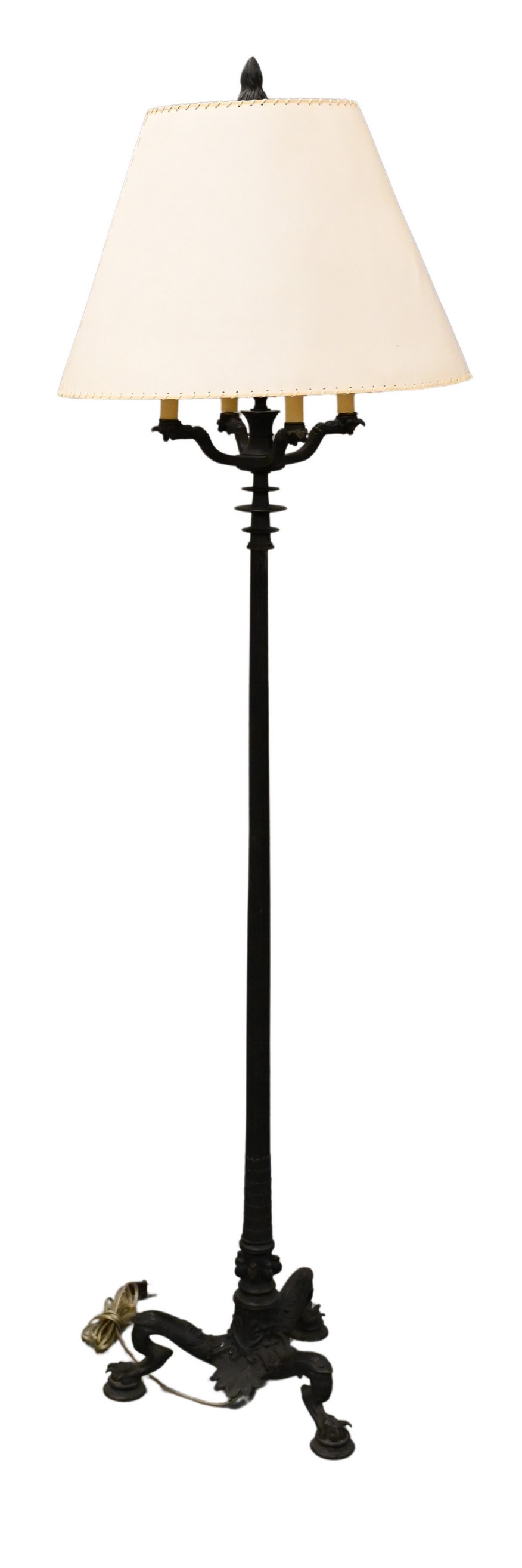 having flame style finial over sockets with foliate design on fluted shaft set on base with three legs and bird claw feet, early 20th century