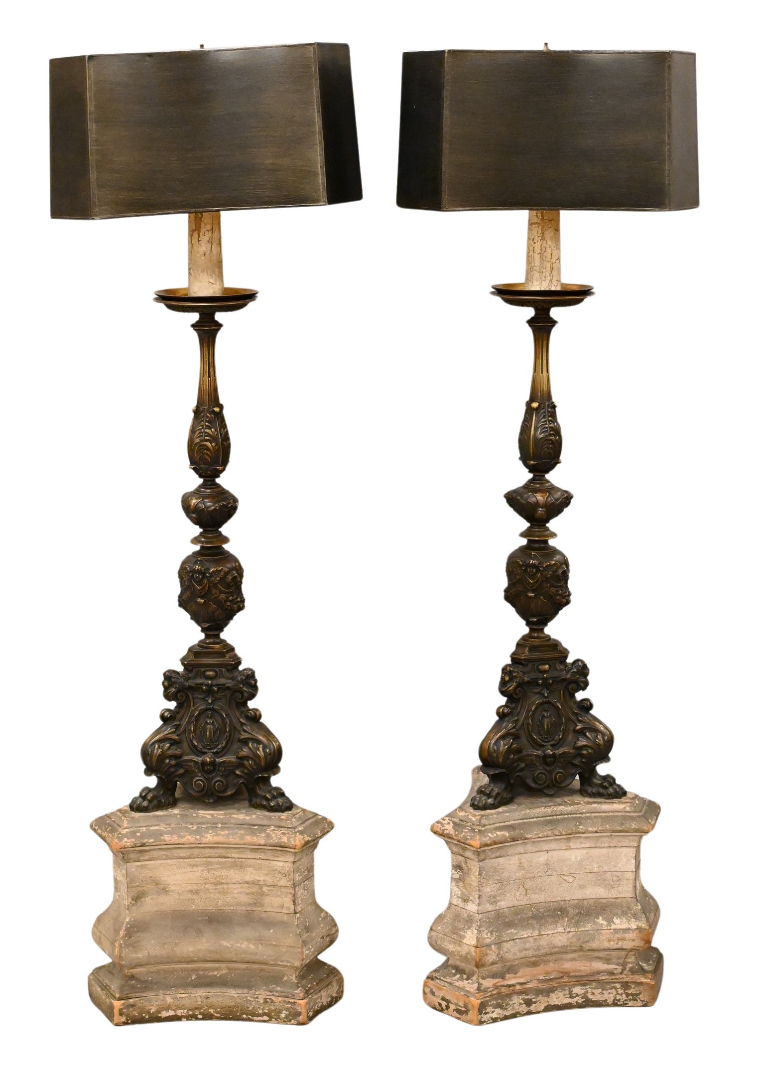 having faux candlestick and electric socket, the candle pricketts in Baroque style having putti faces, medallions with women and paw feet