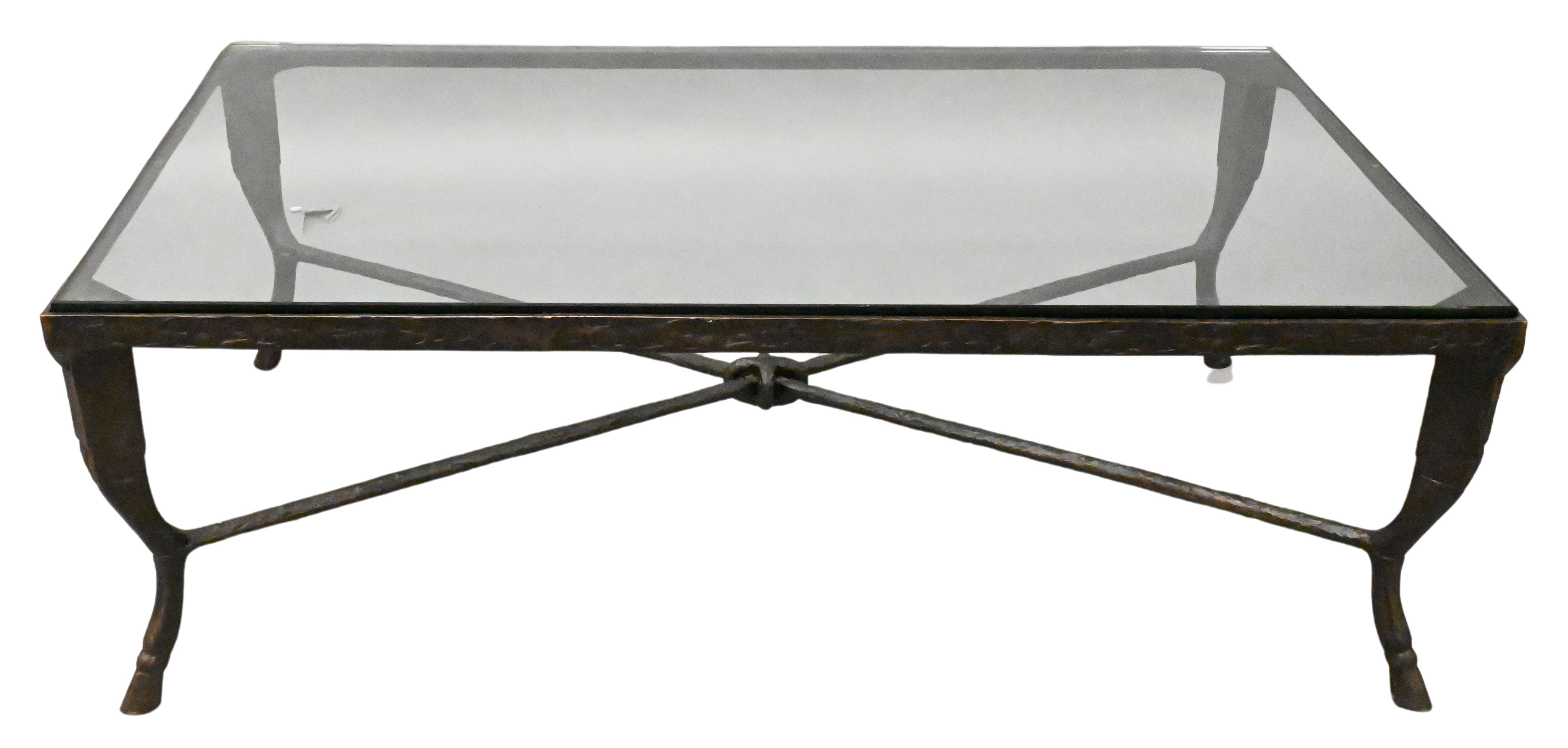 Bronze and glass coffee table having glass top on raised hoof or chevre feet, X form stretcher with center knot