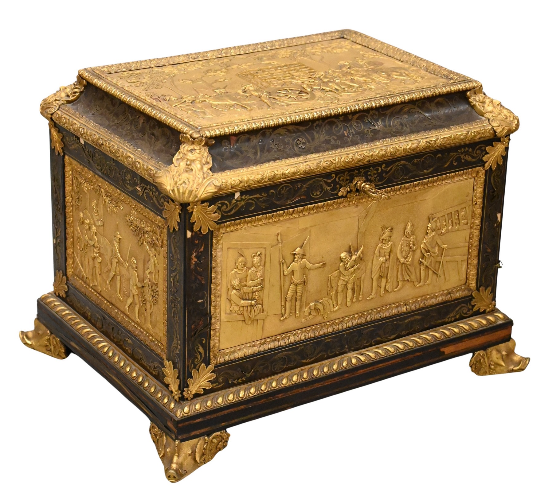 of casket form, the top and side having gilt-bronze relief panels depicting scenes from French and Colonial history, the hinged cover with masks at corners, raised on boar’s head feet,19th century