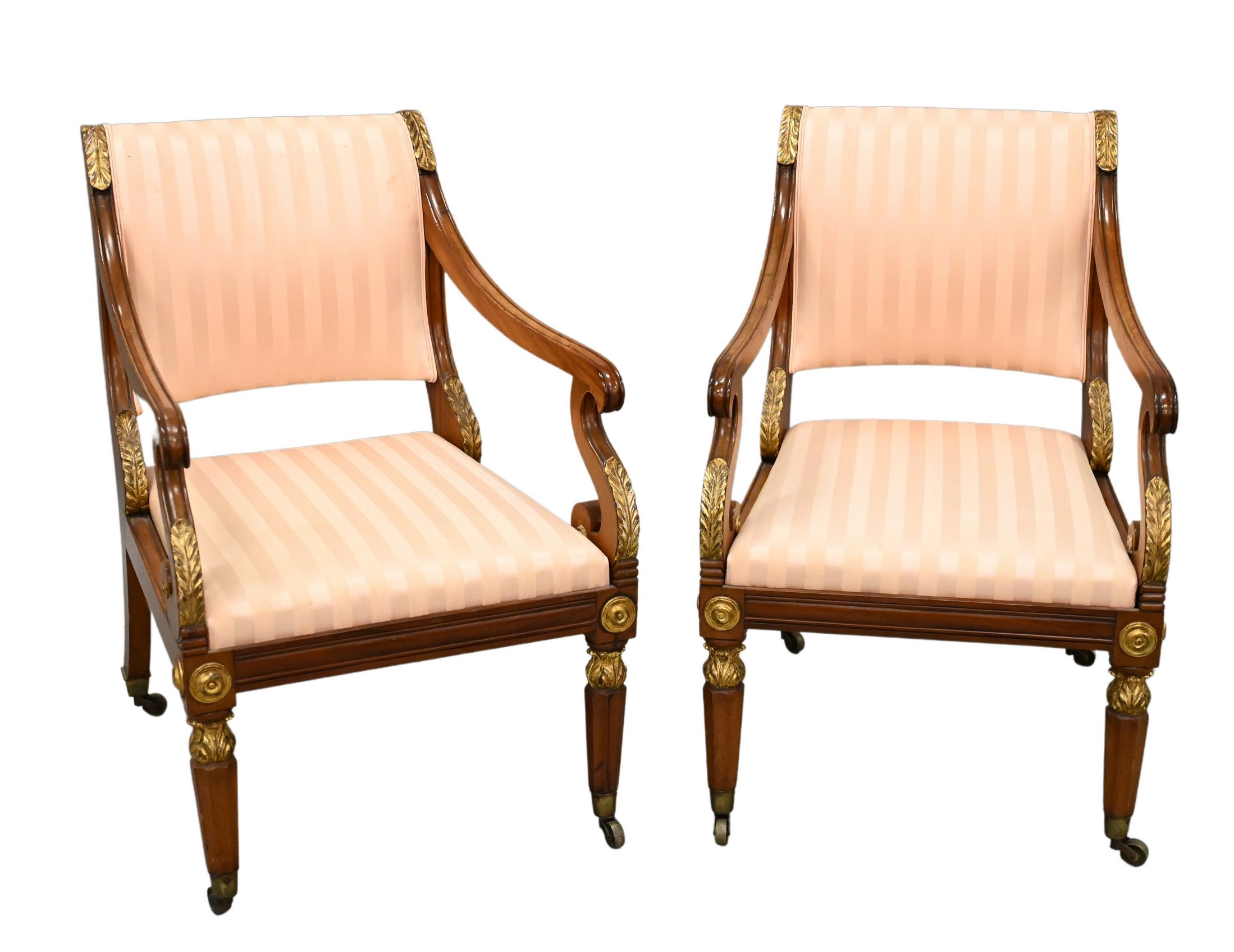 Condition: presents well, upholstery having slight soiling, minor gilt loss, frame with minor wear, back foot of one chair having loss above caster