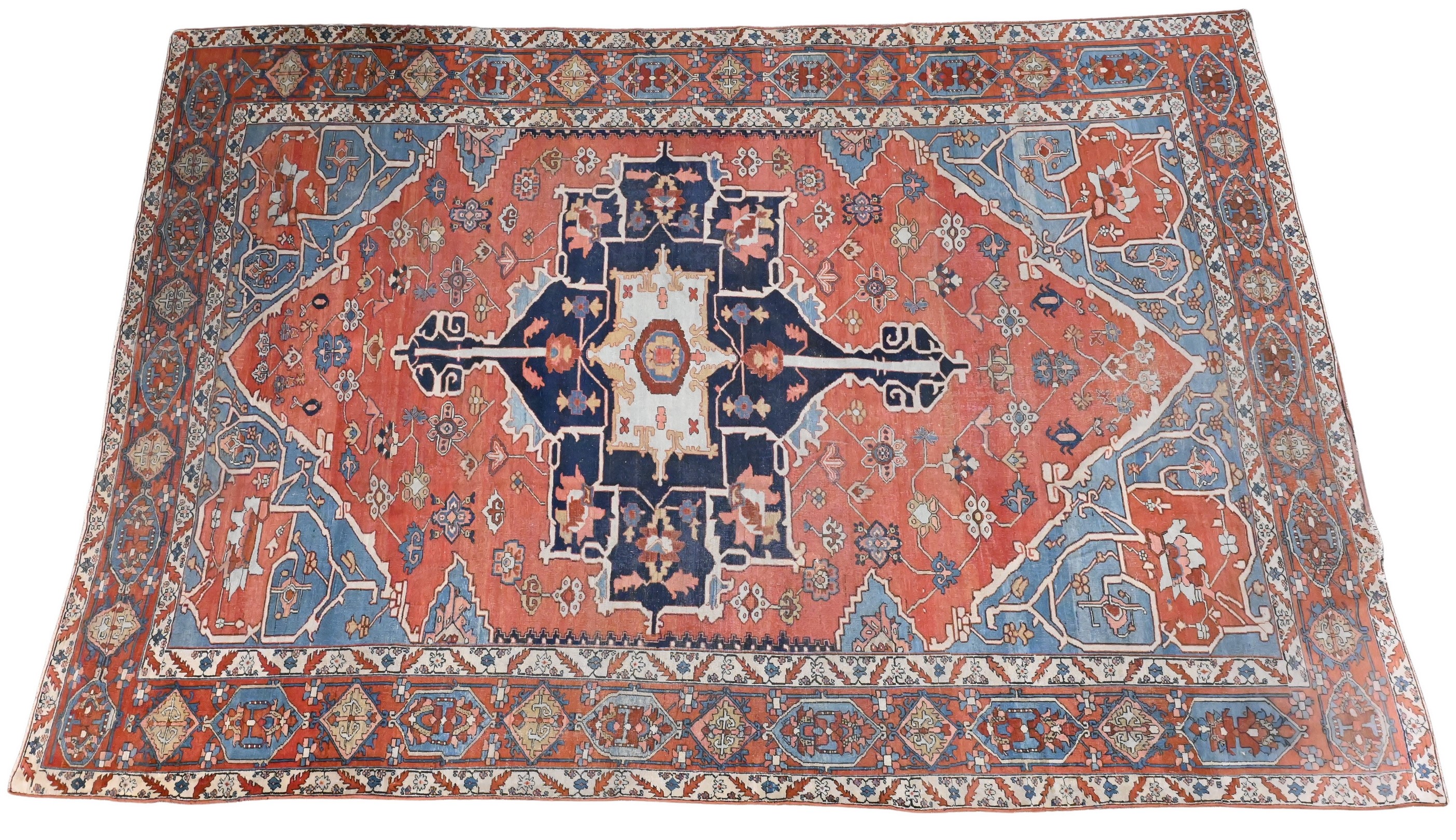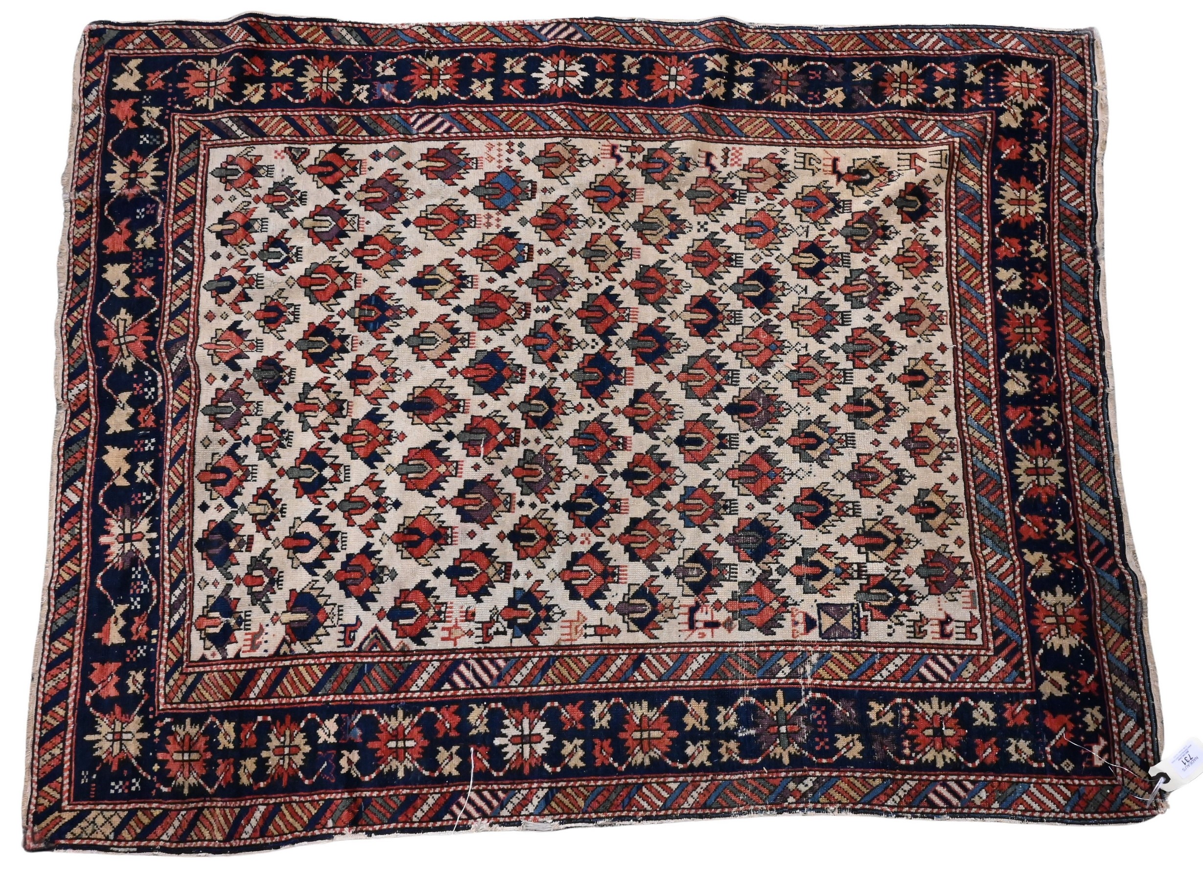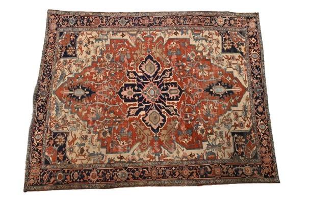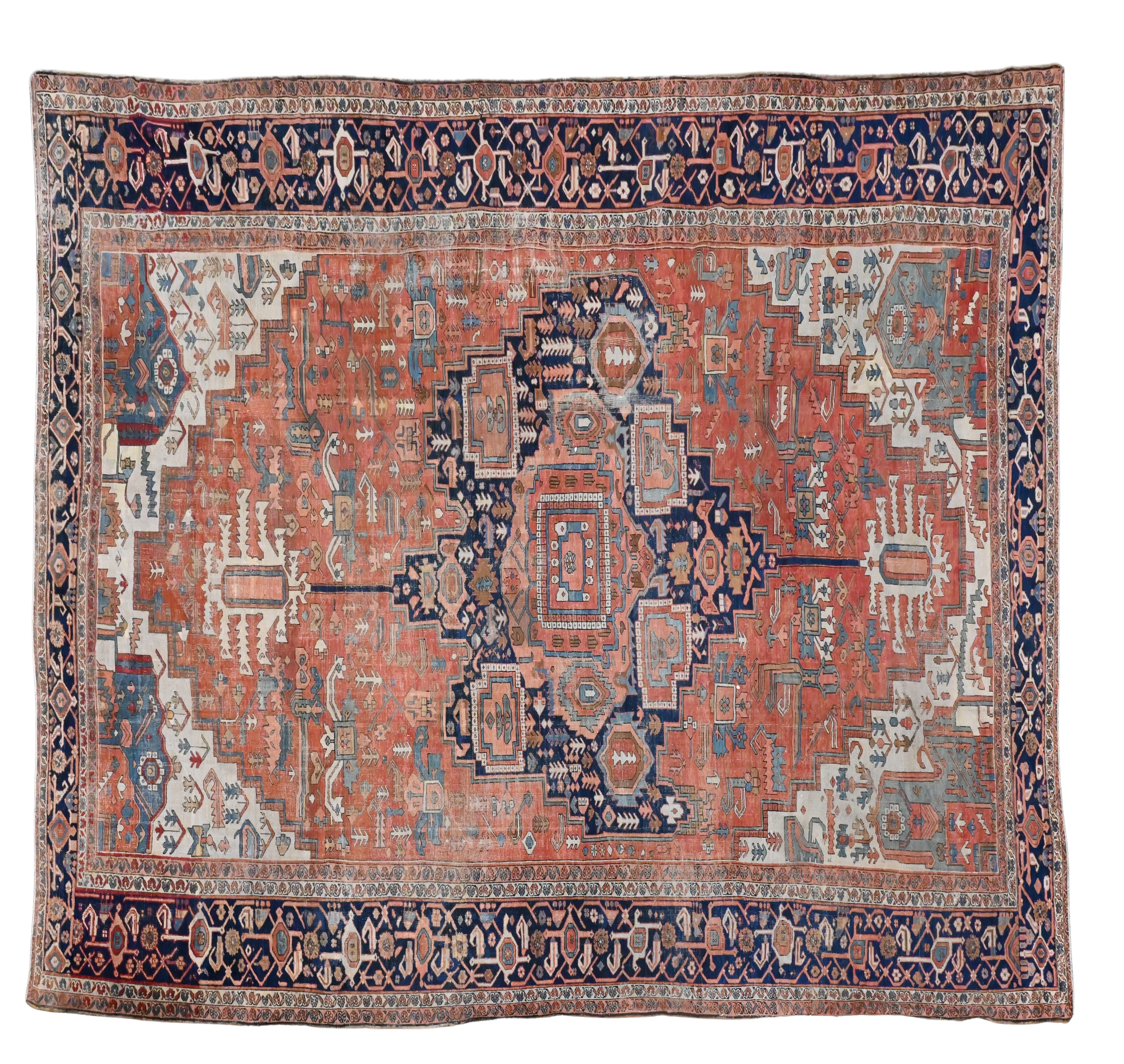 Condition: presents well, wear throughout, a few repairs, minor edge wear, no fringe