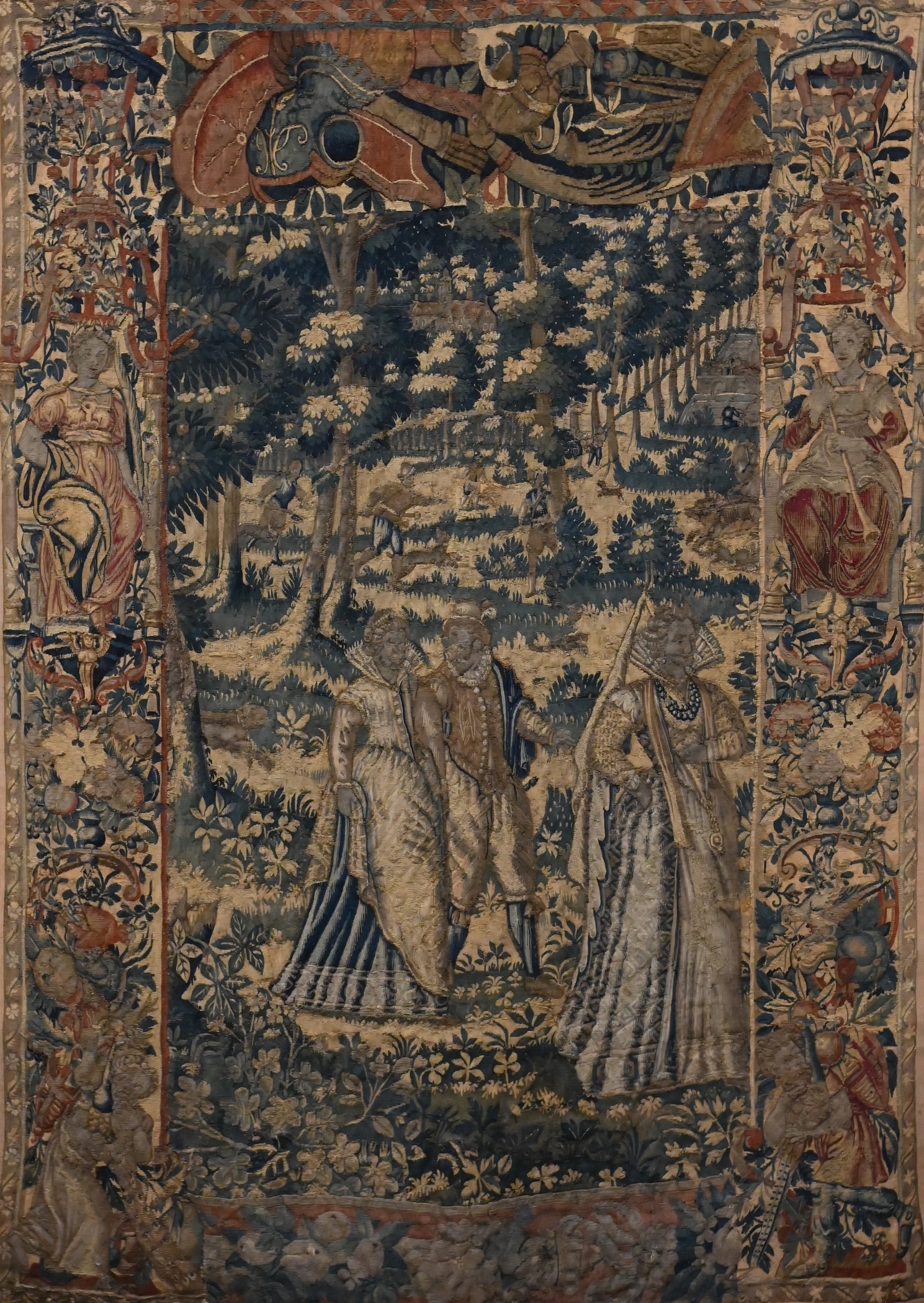 featuring three noble figures in the foreground in Elizabethan dress, small hunting figures and their dogs can be seen in the background amongst the forest trees and distant Chateau, bordered by scrolling foliate and angelic figures