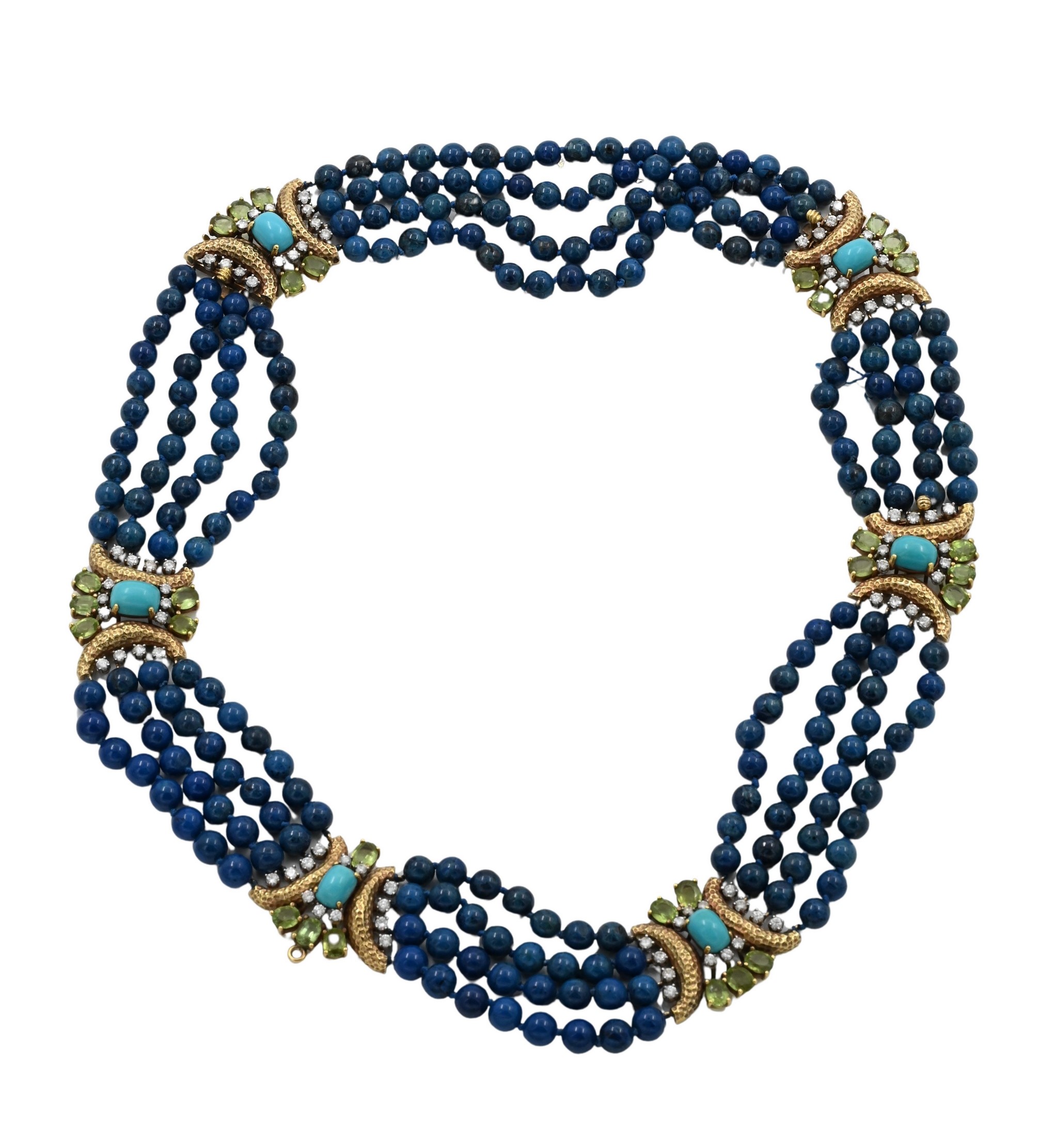 14 inches, 6 inches, and 3 1/2 inches section totaling 23 1/2 inches, four strands of 6.5 mm round lapis beads, six repeating motifs having one 11 mm x 7.5 mm turquoise, five 7 mm x 6 mm oval peridots, and 14 diamonds in each totaling approximately 1.25 carats, total weight 193.2 grams, 24″ long
