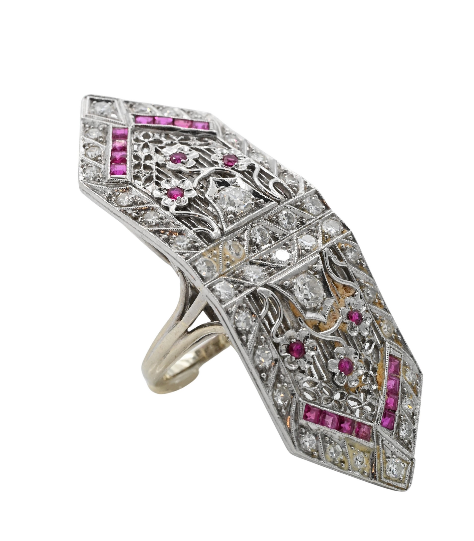 having hinged side rings, 32 – 1.75 millimeter square rubies and 14 diamonds approximately 1.14 carats, total weight 14 grams, missing two rubies, size 5