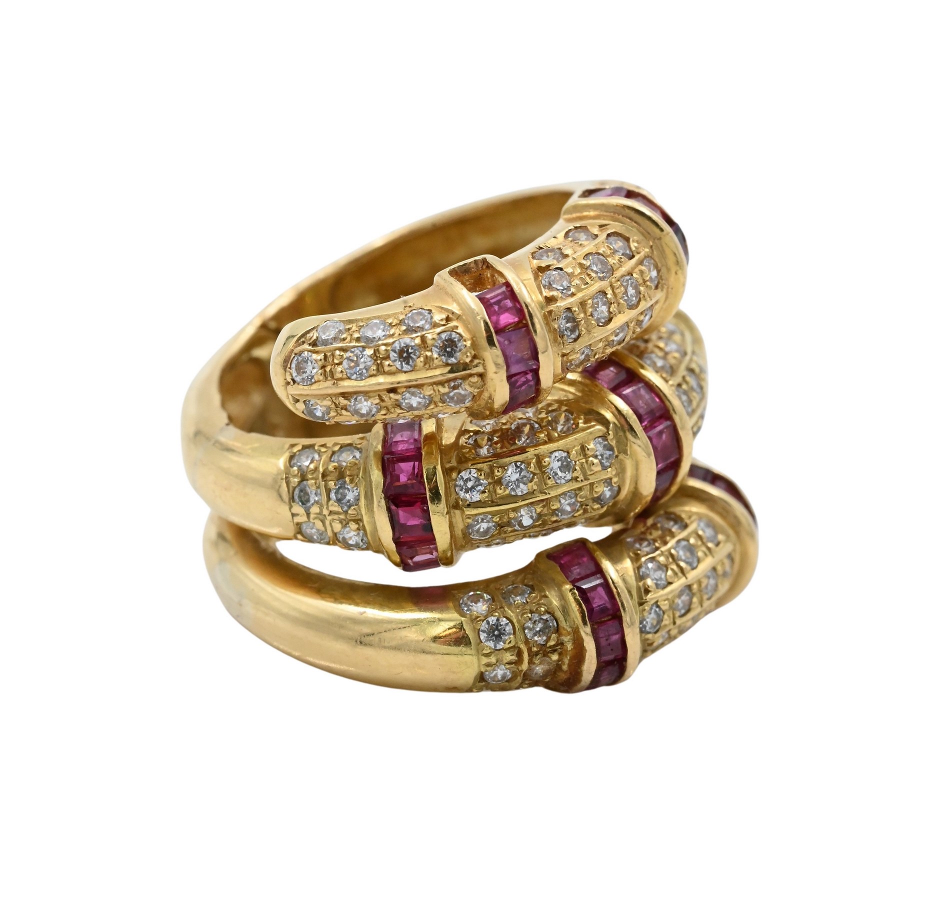 having sixteen 2 millimeter square, six 2 millimeter round rubies, and 36 round diamonds, approximately 2.6 carats total