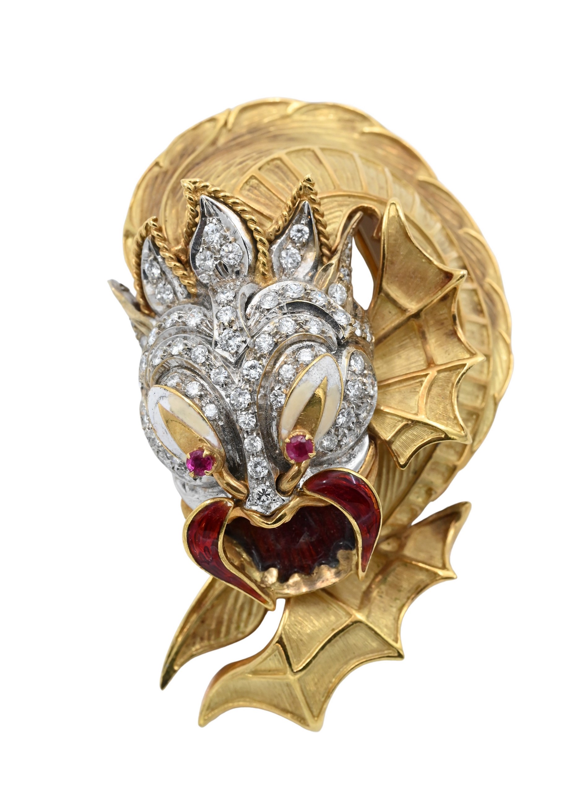 having flying Asian dragon, white enamel and ruby eyes, 59 diamonds approximately 4.4 carats