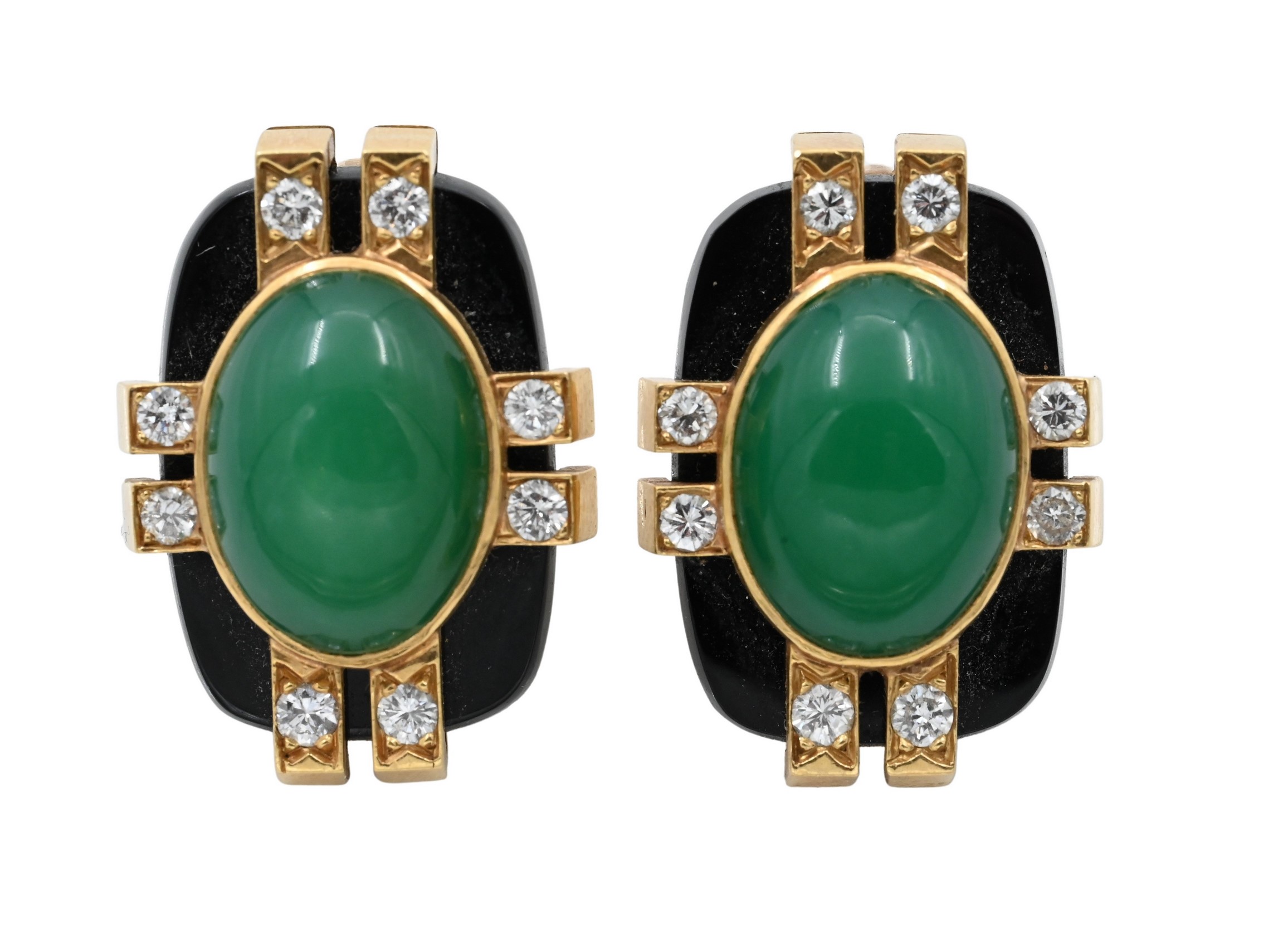 having cushion shaped onyx tablets, center 16 mm x 12 mm oval shaped cabochon cut chrysoprase accented by eight diamonds on each, total approximately 1.10 carats, marked “CS 18K”