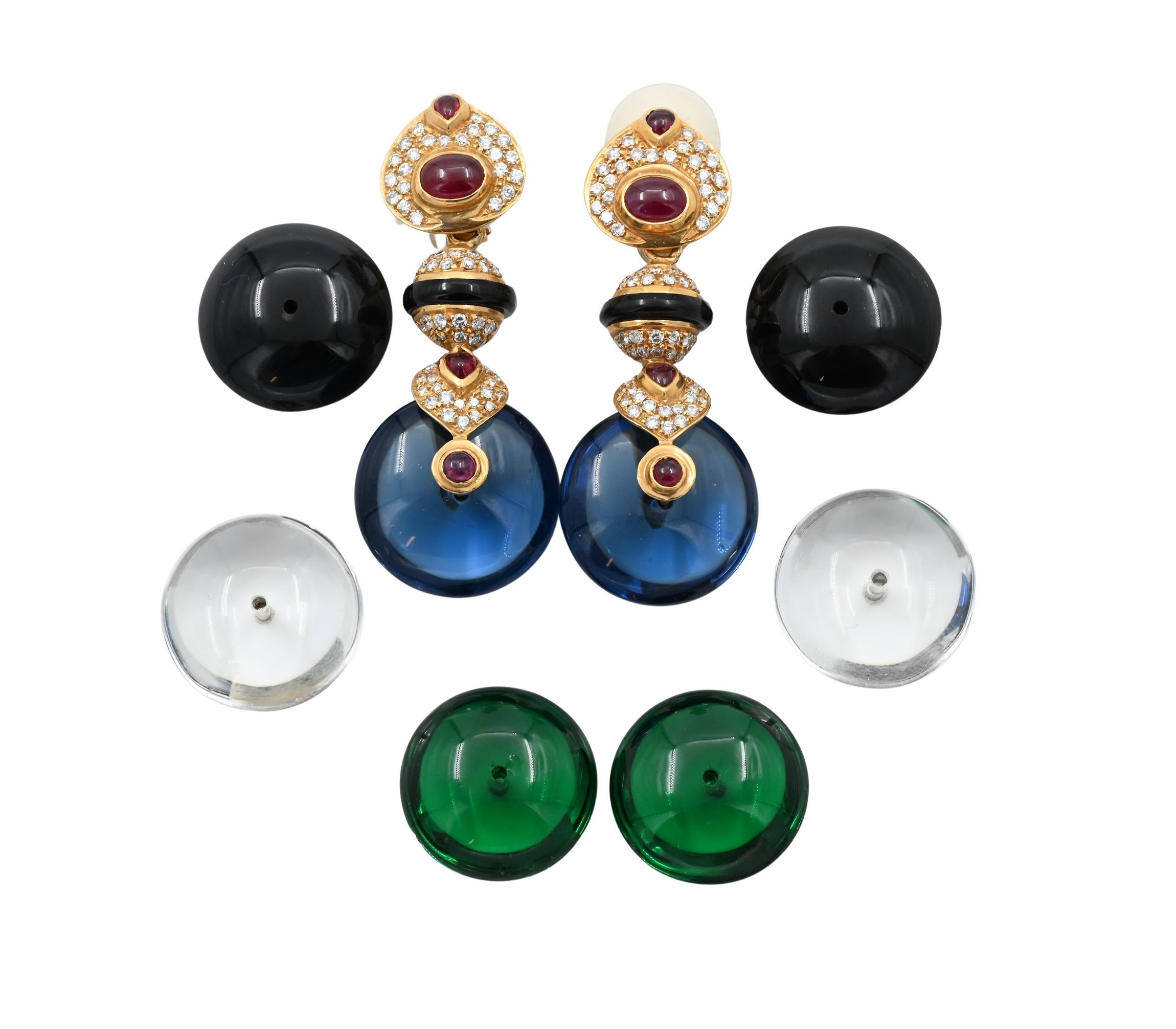 having interchangeable 22 mm bottom glass discs in blue, green, clear, and black, 2 1/4 inches long, 35.3 grams, tops have two 7.5 mm x 5.5 mm oval cabochon rubies, four 4 mm x 3 mm pear shaped cabochon rubies, and two 4 mm round cabochon rubies along with 132 diamonds, total weight approximately two carats, onyx rings surround the middle diamond sections, just earrings total weight 23.5 grams, 2″ long
