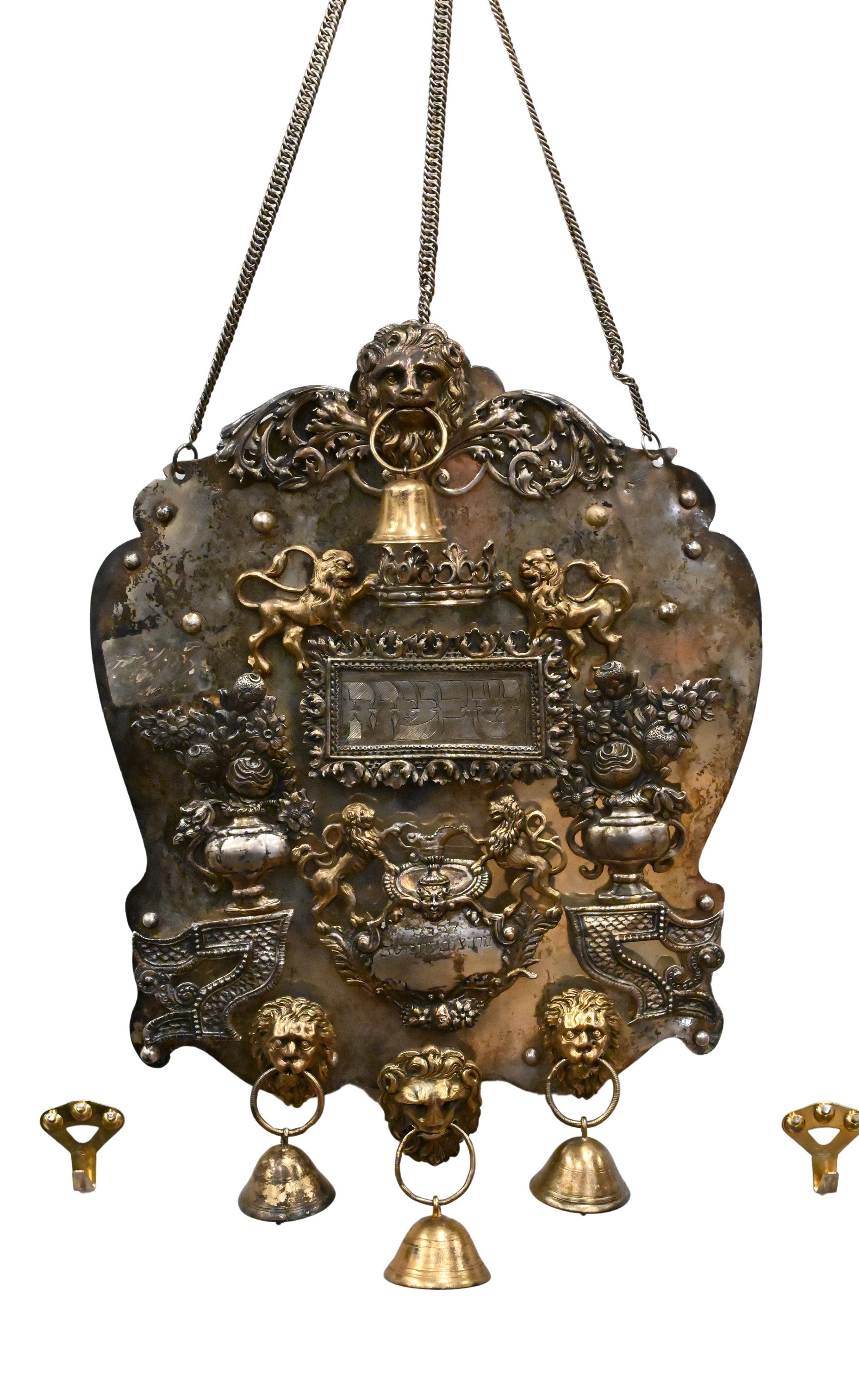 of cartouche form, having four lion heads holding bells along the border, the center motif of two lions holding up a crown above the inscription plate, flanked by two flower vases, hallmarks