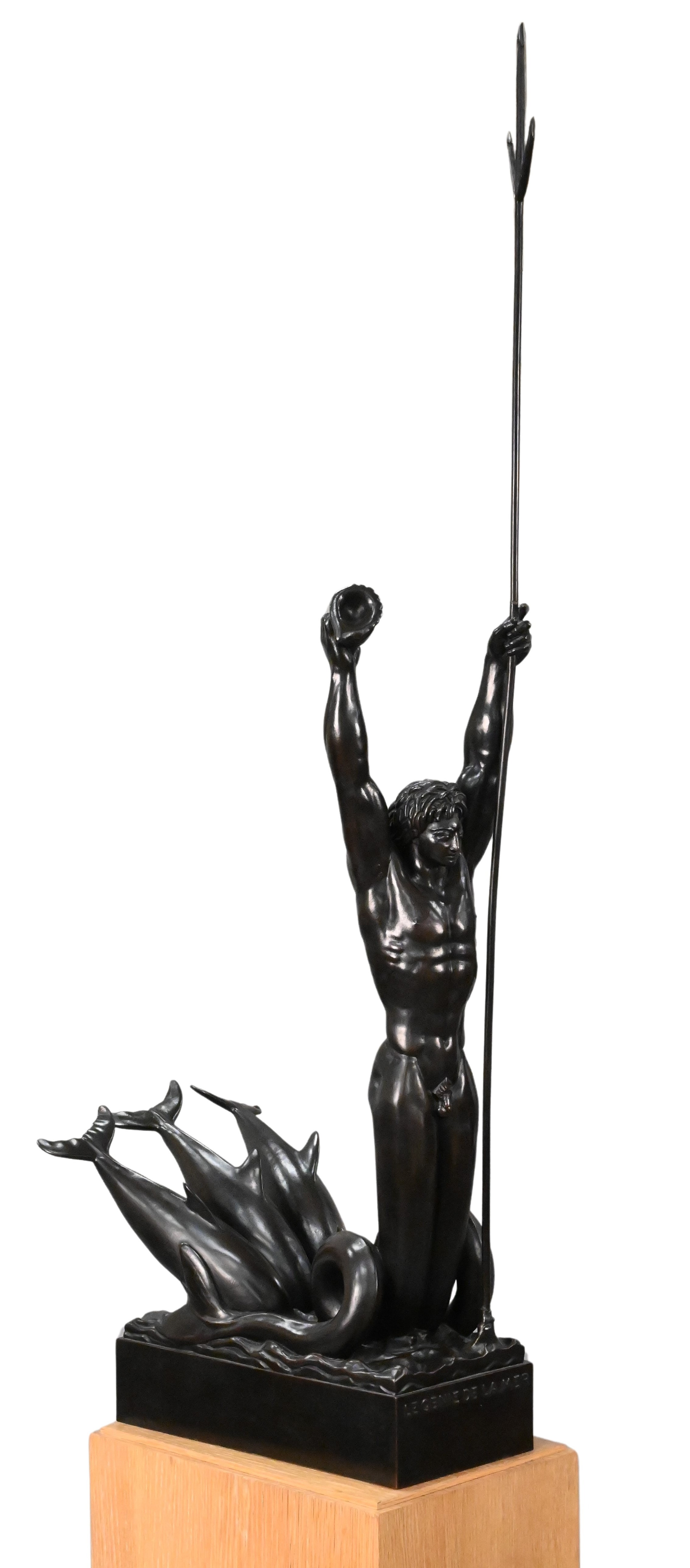 Patinated bronze of the Greek sea god,Triton, on ceruse oak wood pedestal