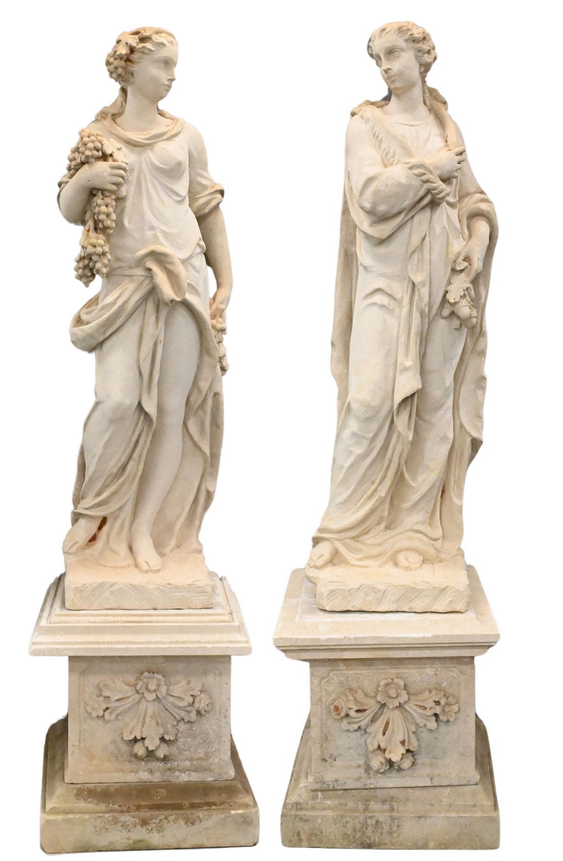one depicting summer in a light dress holding her harvest of grapes, the other depicting winter in her thick fur coat as she holds a cluster of acorns, each mounted on pedestal base, carved sandstone