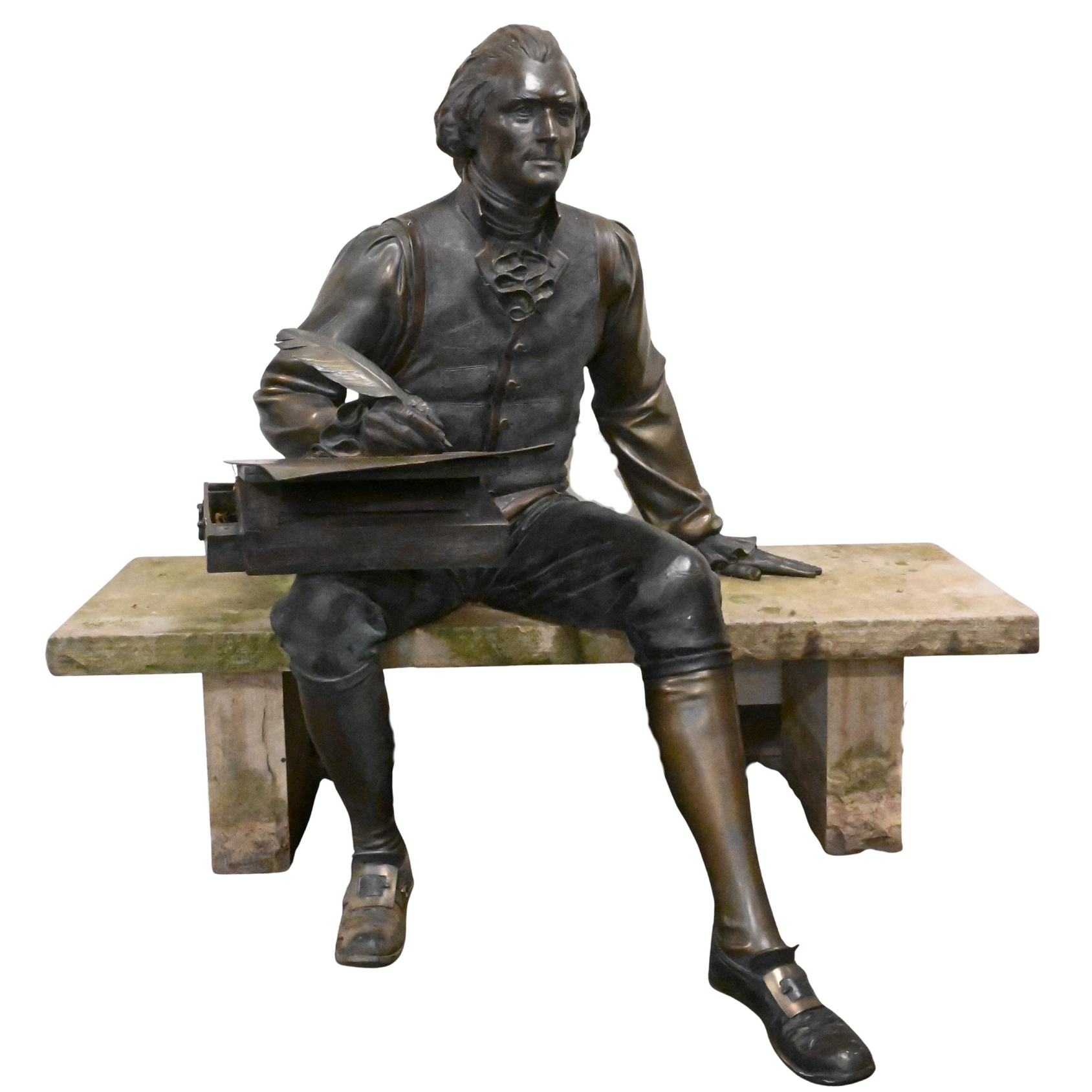 Lifesize bronze statue depicting the third president of the United States writing the Declaration of Independence while sitting on a bench, other editions of this sculpture include one featured at Sorrel Sky Gallery with an asking price of $90,000, one located at the University of Missouri next to the David R. Francis Quadrangle, as well as one located at Booth Western Art Museum, Georgia