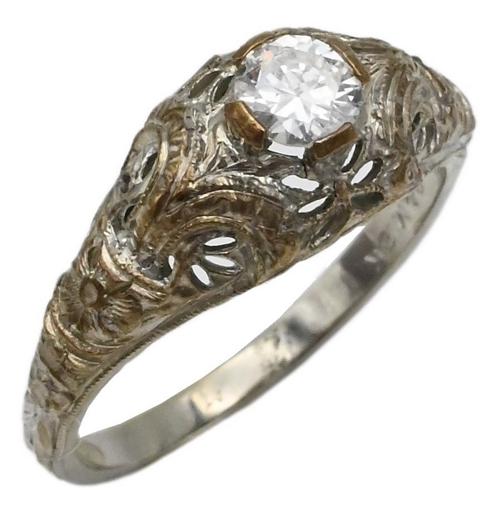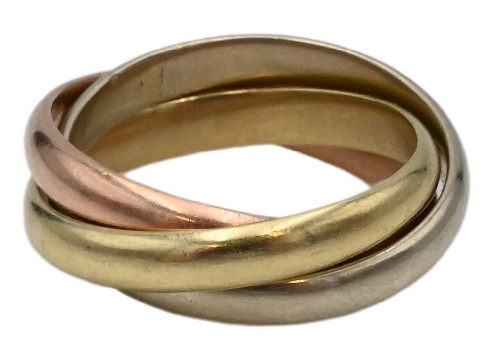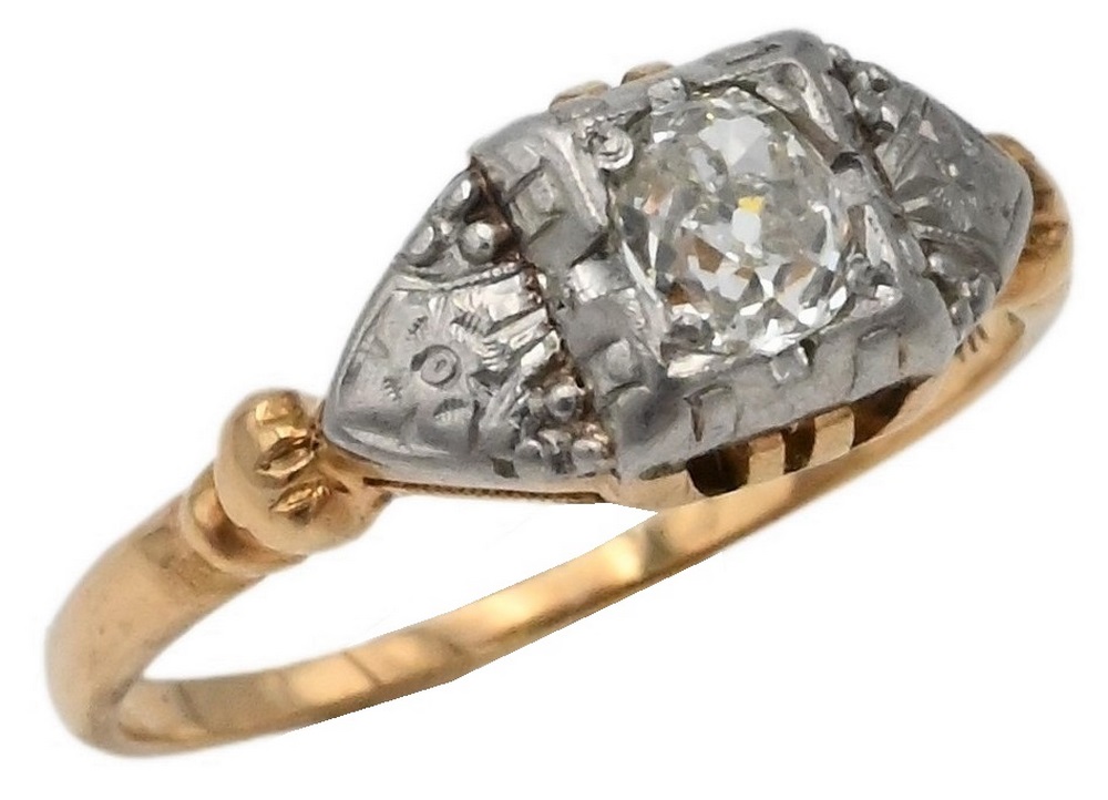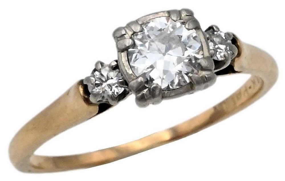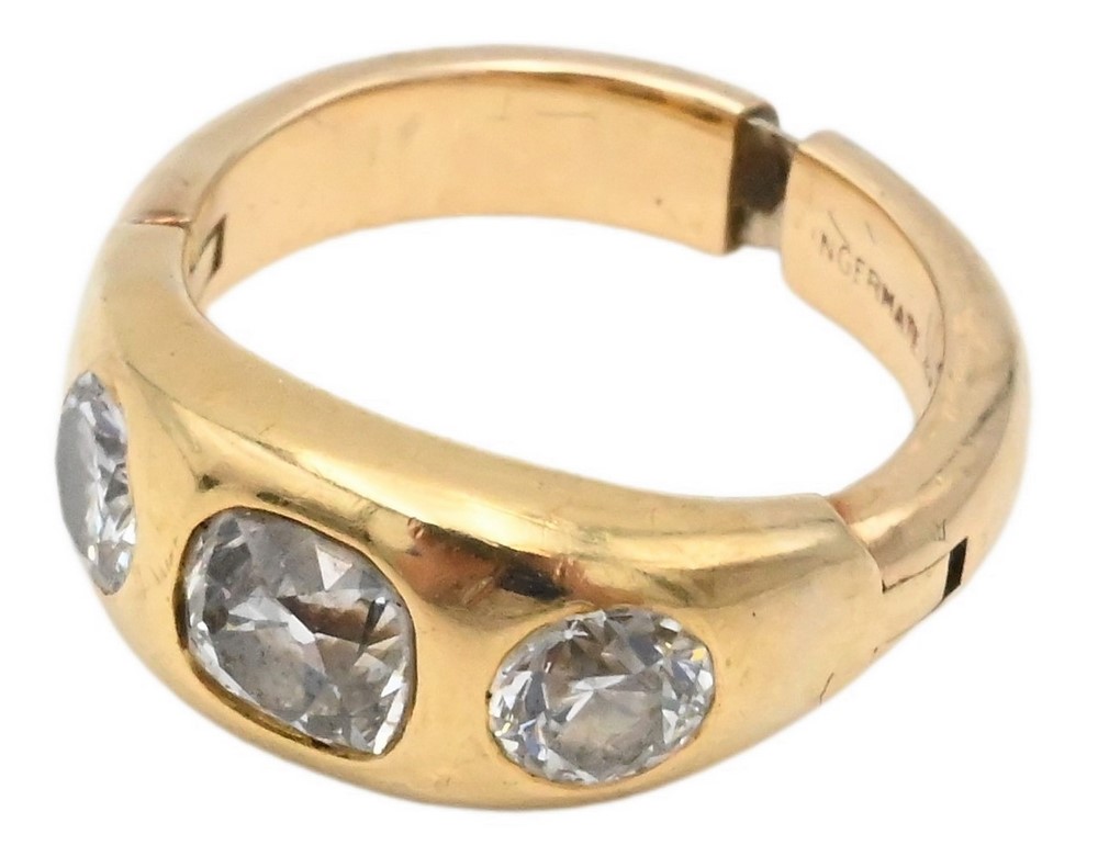 14 Karat Yellow Gold Hinged Ring, set with center cushion cut diamond, approximately 5.3mm x 6mm, flanked by round diamonds, approximately 4.8 millimeters each, size 5 1/4, 7.8 grams.