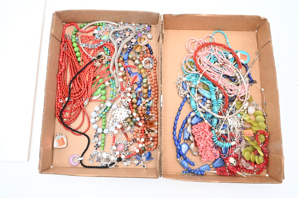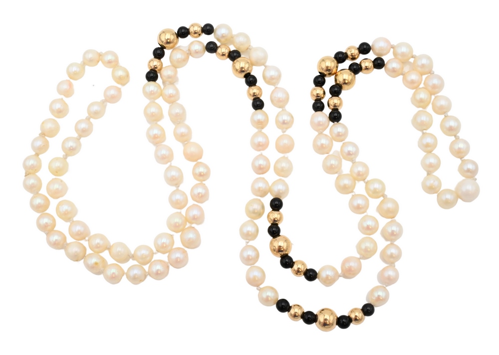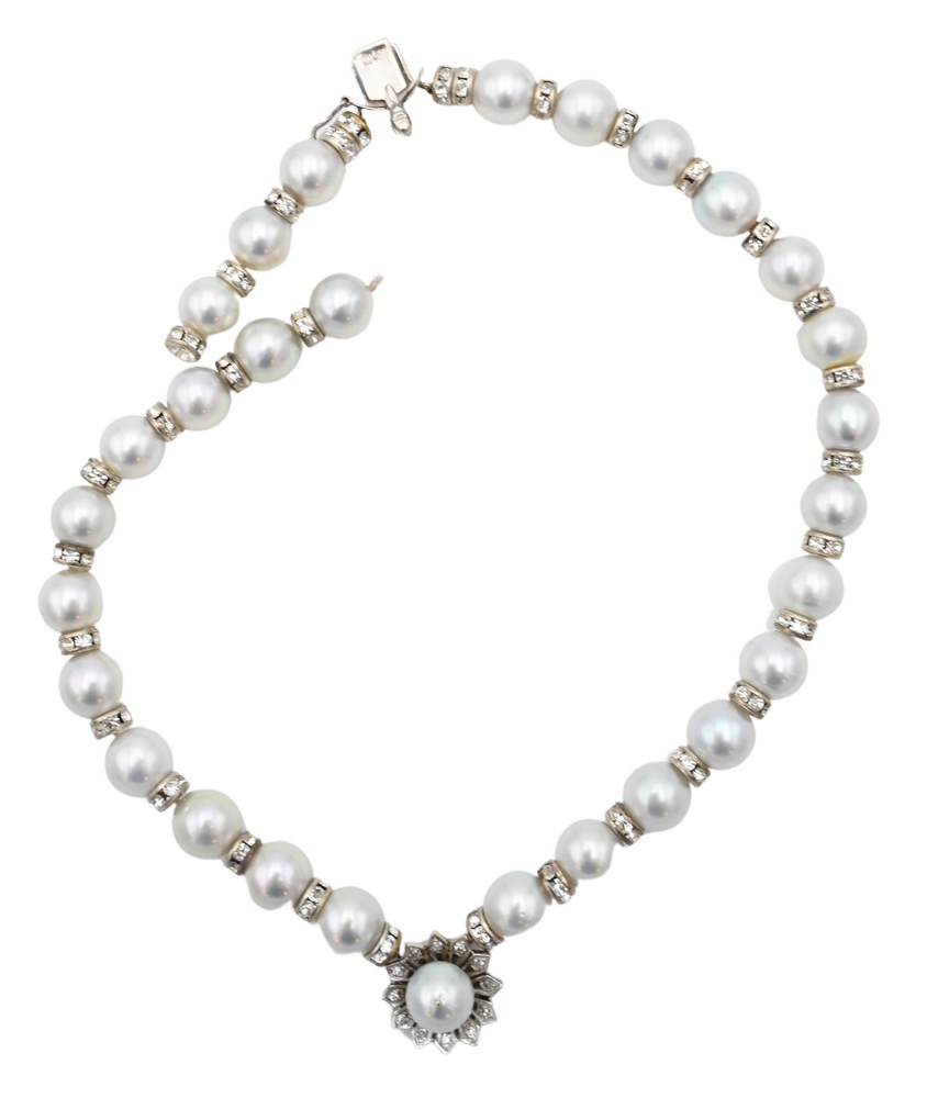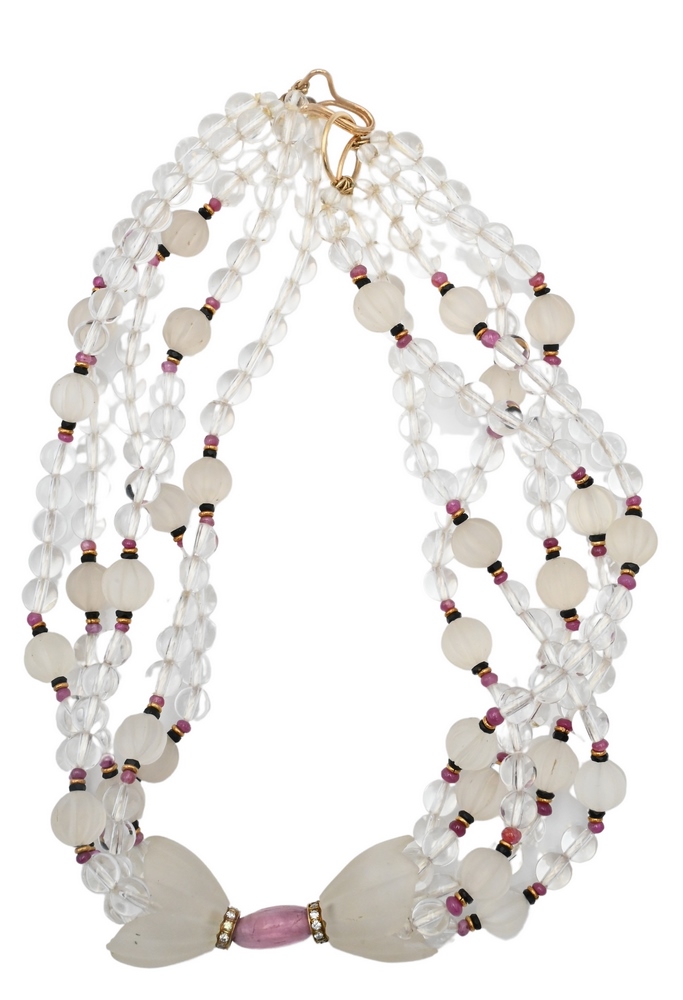 Glass Beaded Necklace, having amethyst, clear and frosted glass beads, gold clasps and spacers, center mounted with 20 small diamonds, length 15 inches.