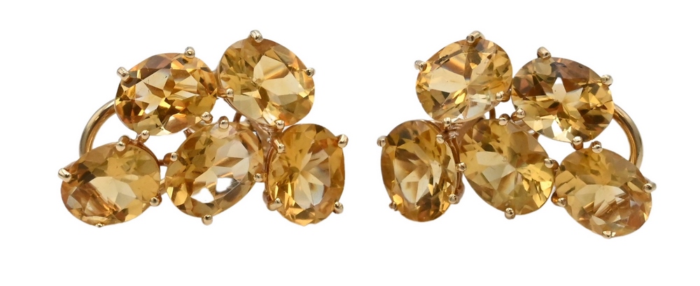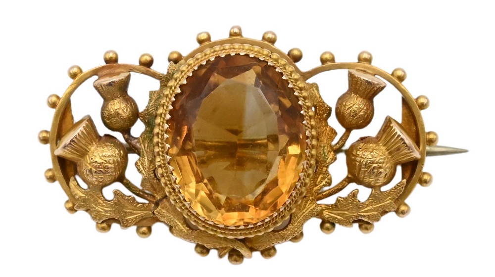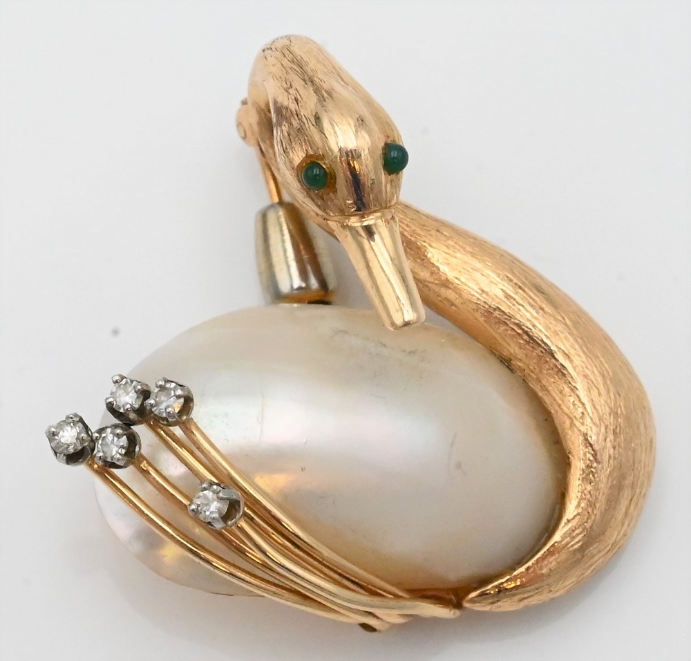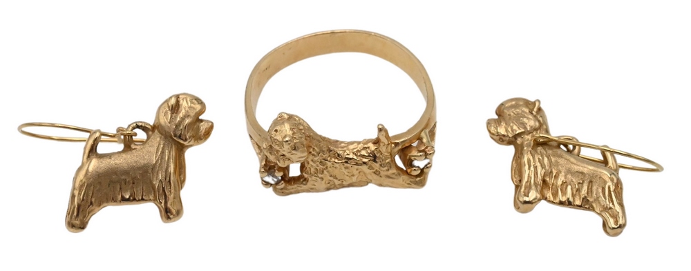 Mappin 18 Karat Yellow Gold Three Piece Set, to include a brooch, 56mm x 38mm; along with a pair of pierced earrings, each set with one diamond; 16 grams.