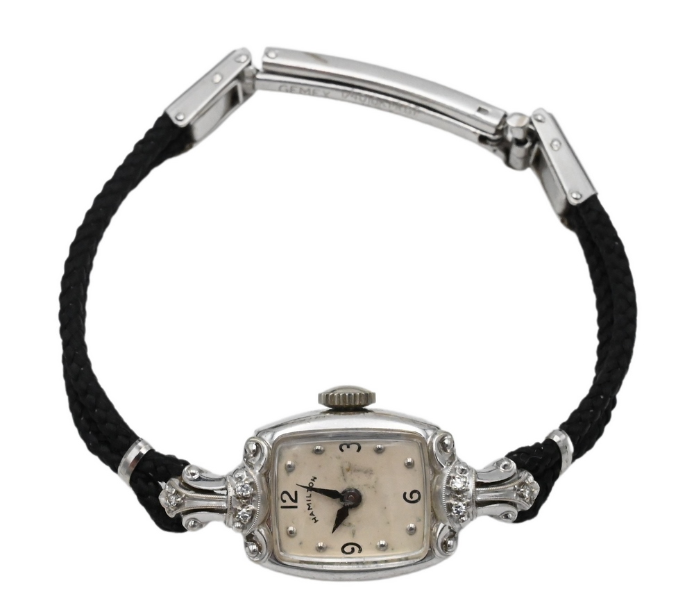 White Gold and Diamond Hamilton Wristwatch, 14K white gold, mechanical wristwatch centering an off-white rectangular dial with dot and Arabic numeral markers, flanked by small single-cut diamonds, completed by a double strand black cord strap and metal clasp, signed ‘Hamilton’, approximately 7.8 dwts. gross. Provenance: Estate of Marilyn Ware, Strasburg, Pennsylvania.