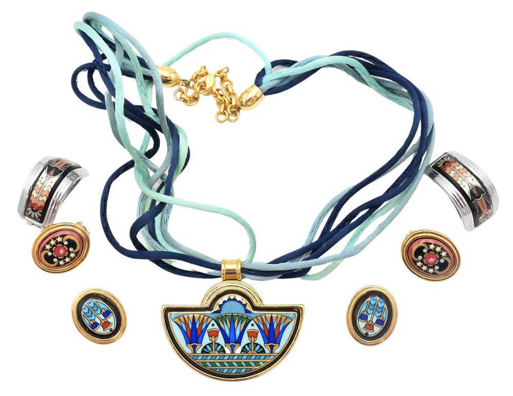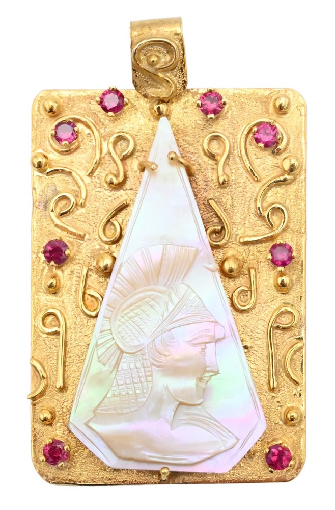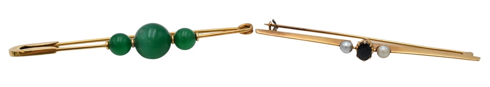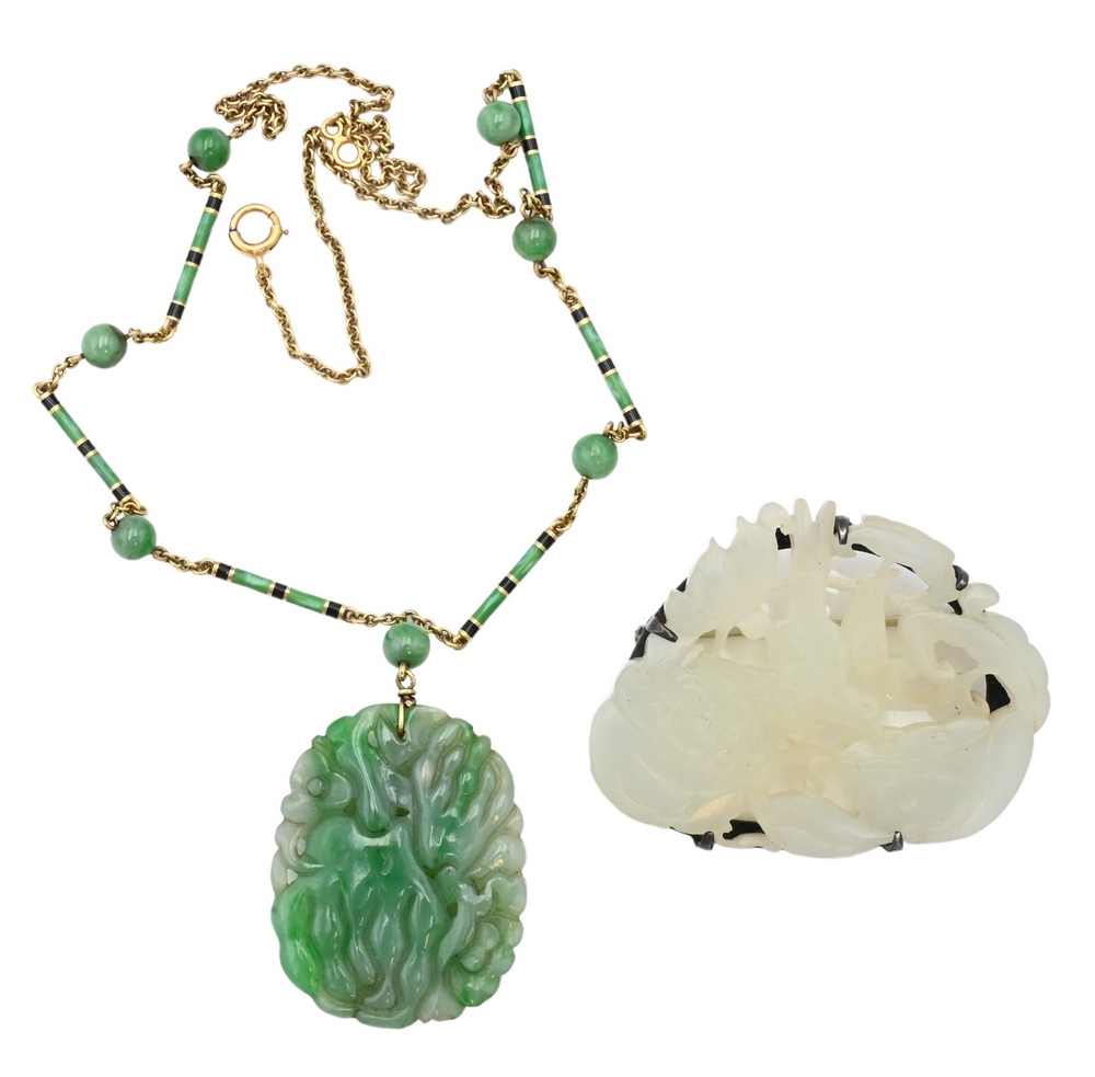 Jade and Jadeite Plaques, to include white carved with bird and lotus, made into a pin, along with a green carved jadeite pendant on 14 karat gold necklace.
