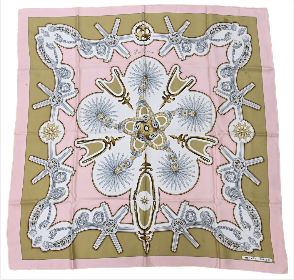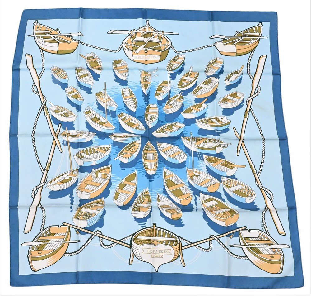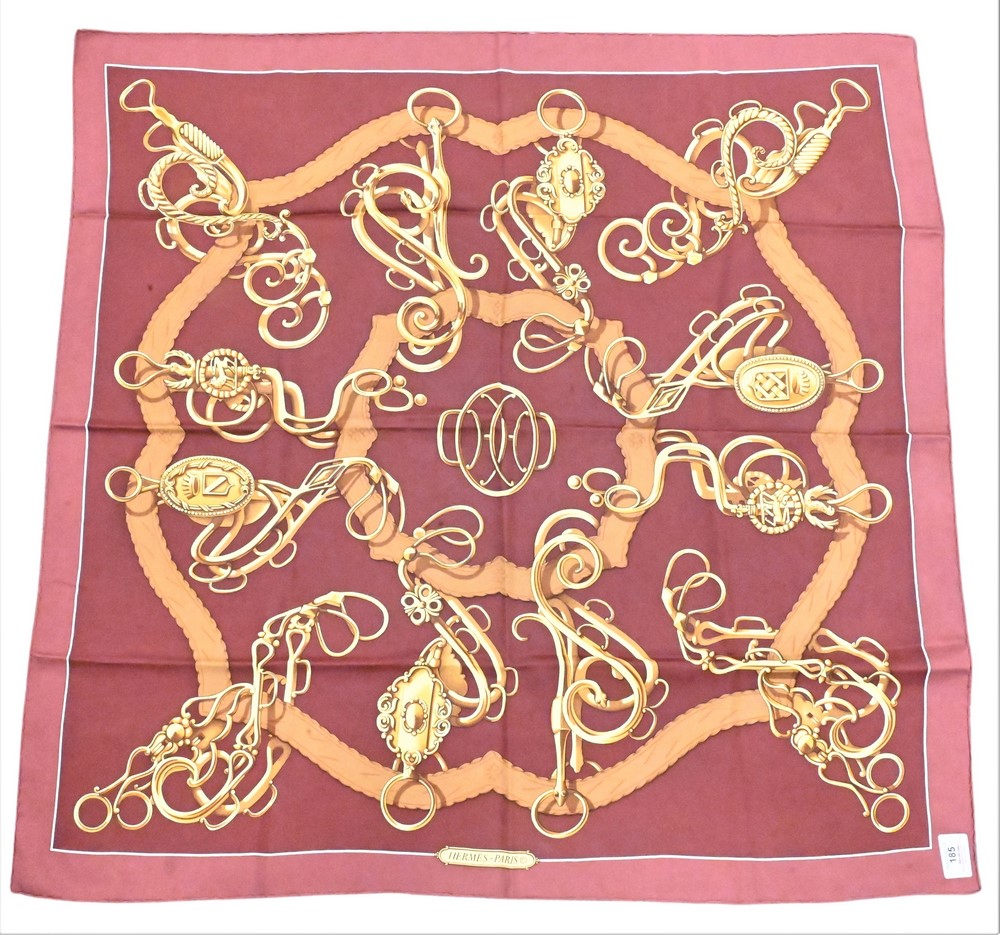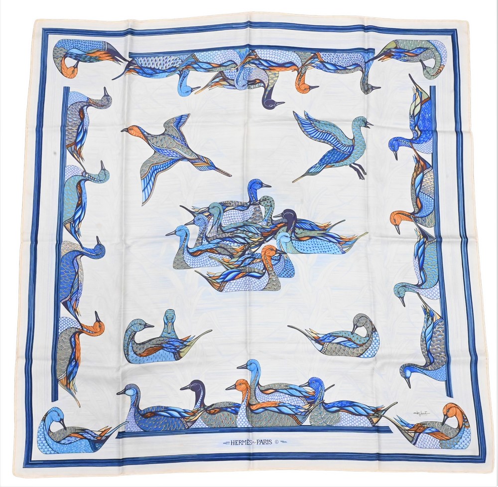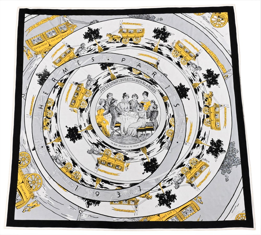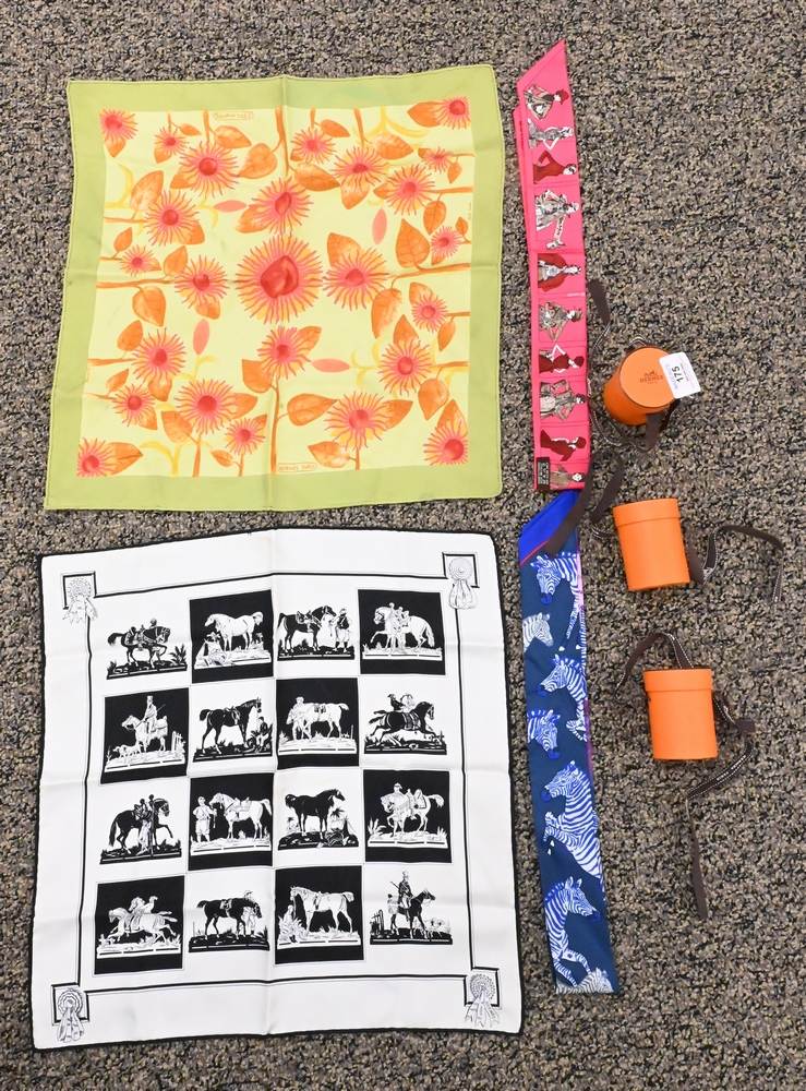 Four Piece Hermes Group, to include two silk ascots with round container; a silk Tournesols handkerchief with box; along with a black and white equestrian handkerchief with box.