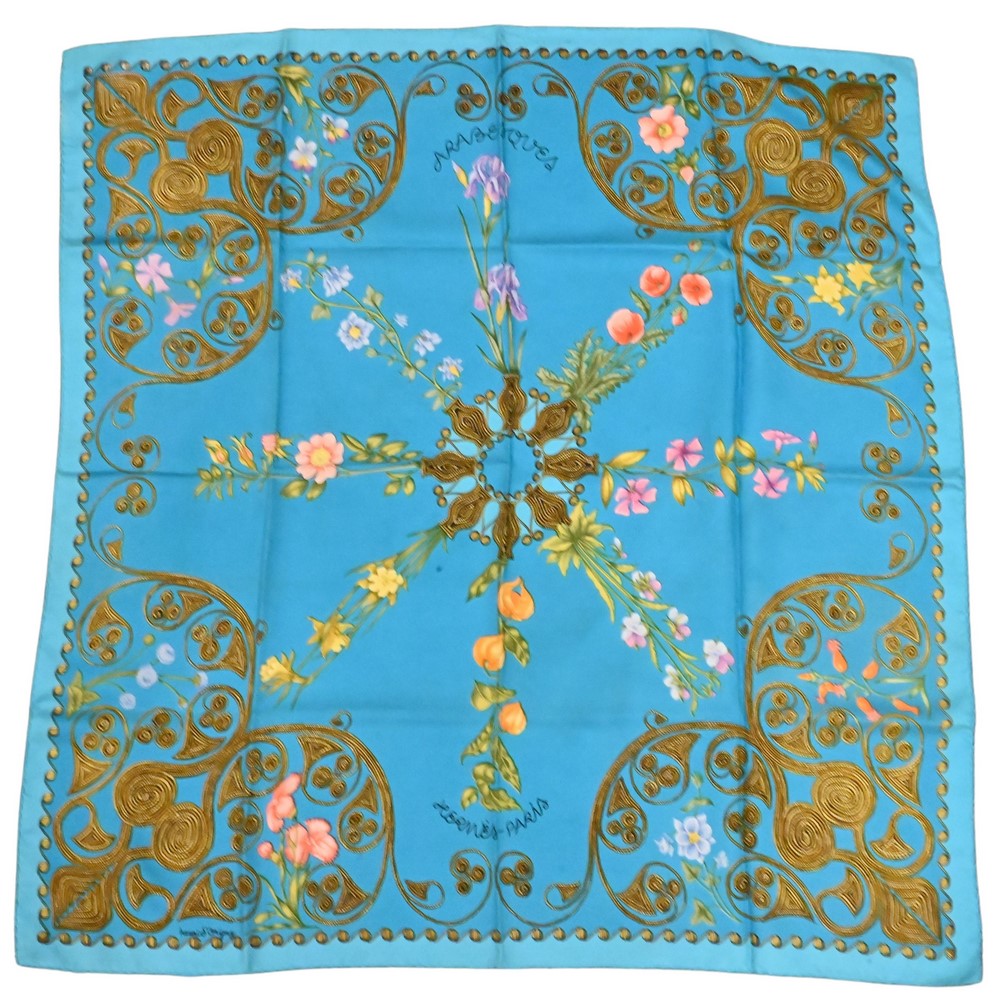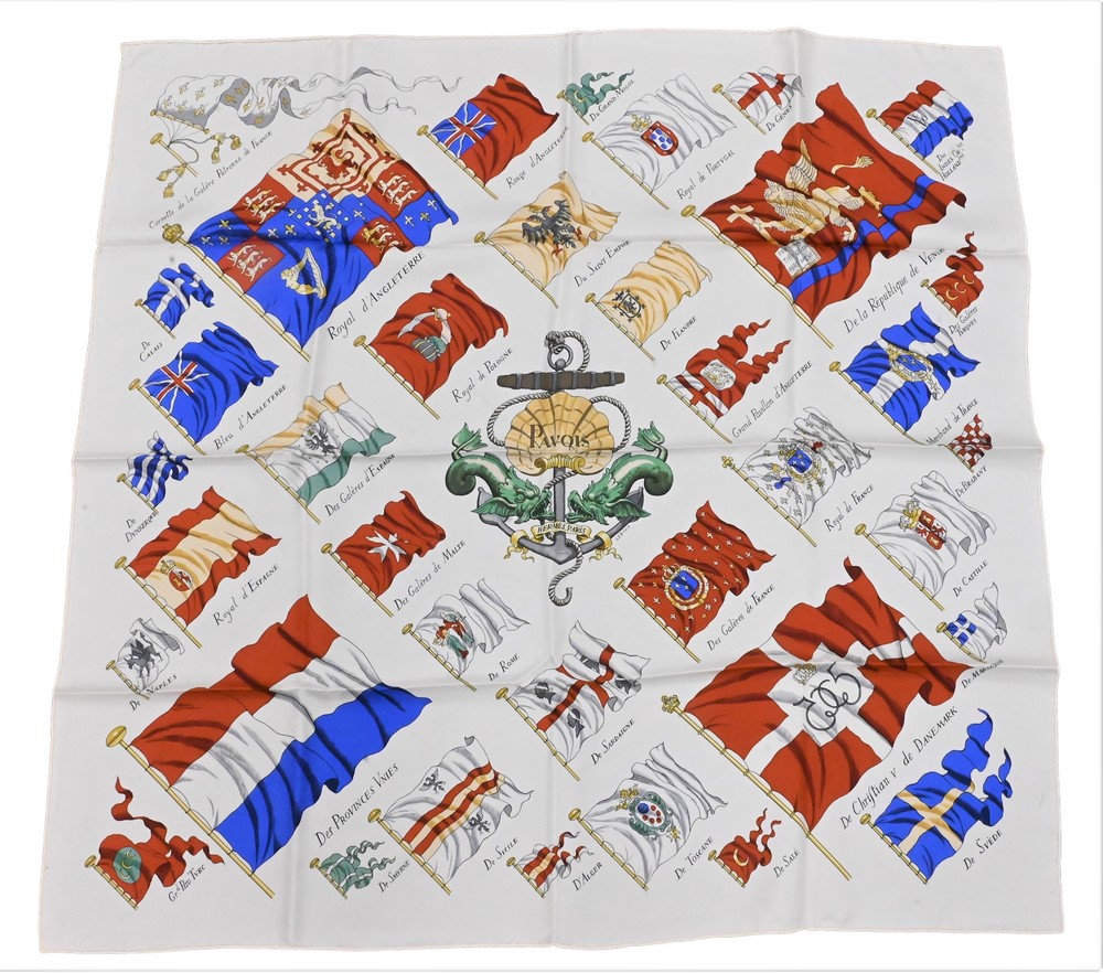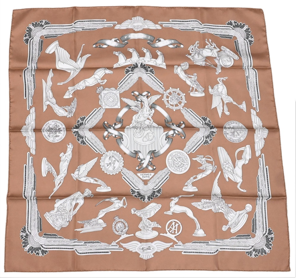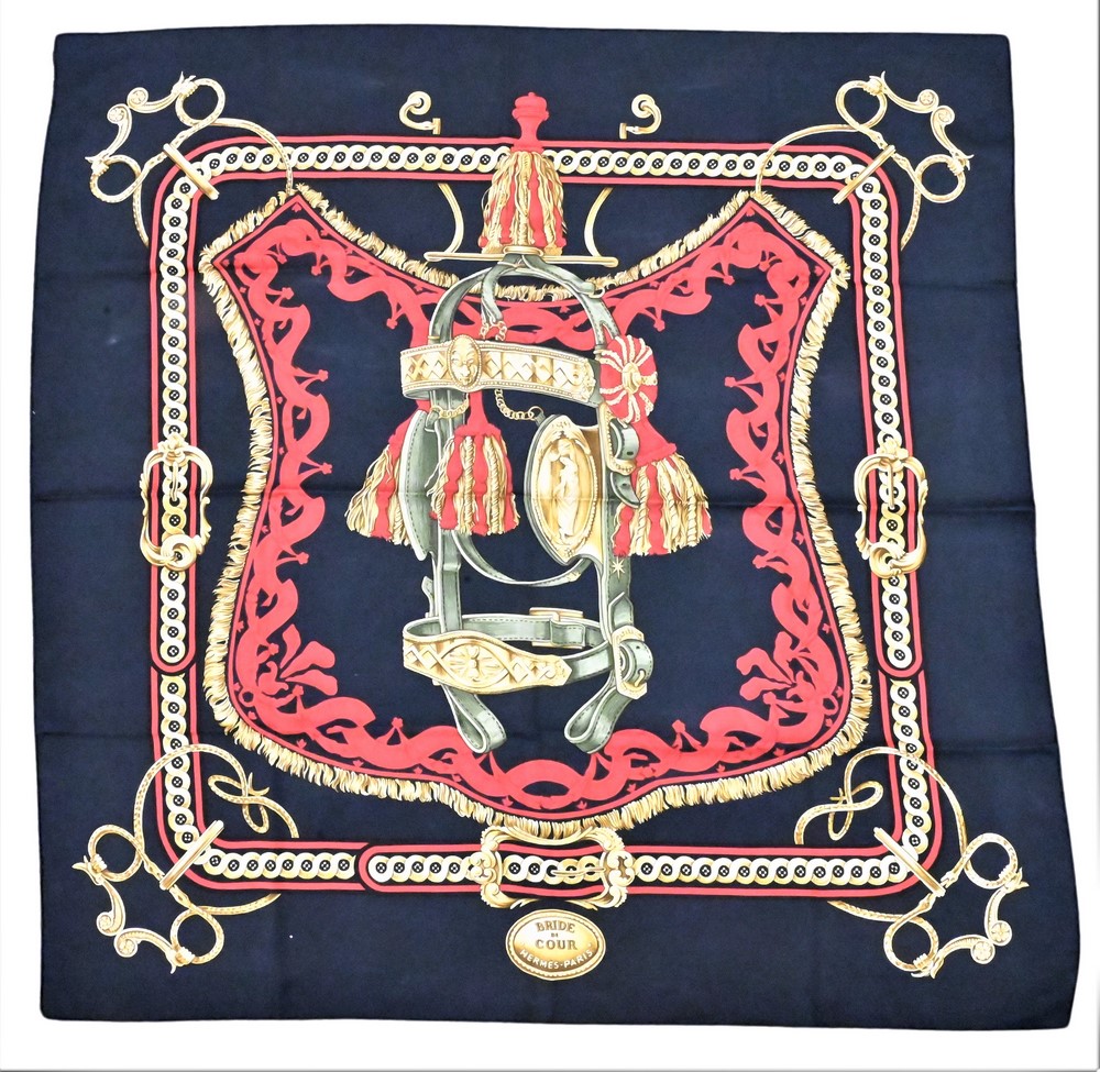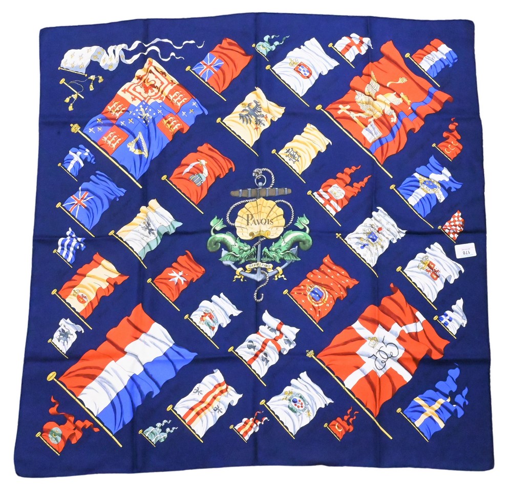 Four Piece Hermes Group, to include two silk ascots with round container; a silk Tournesols handkerchief with box; along with a black and white equestrian handkerchief with box.