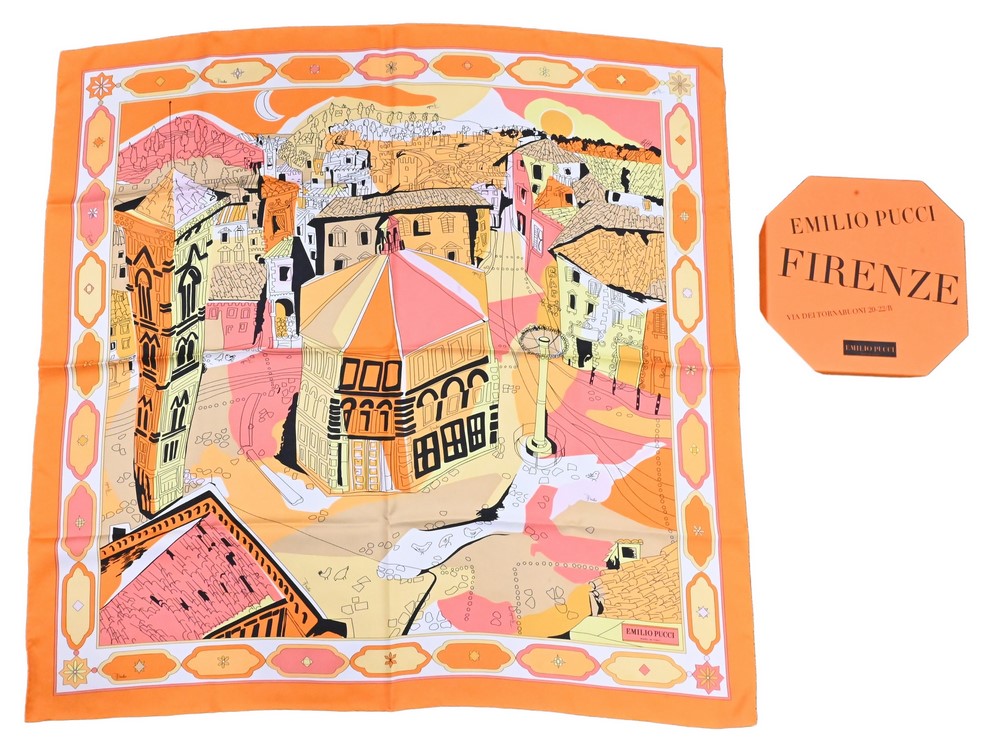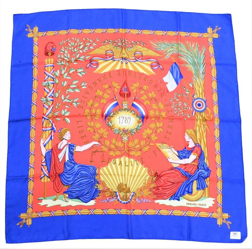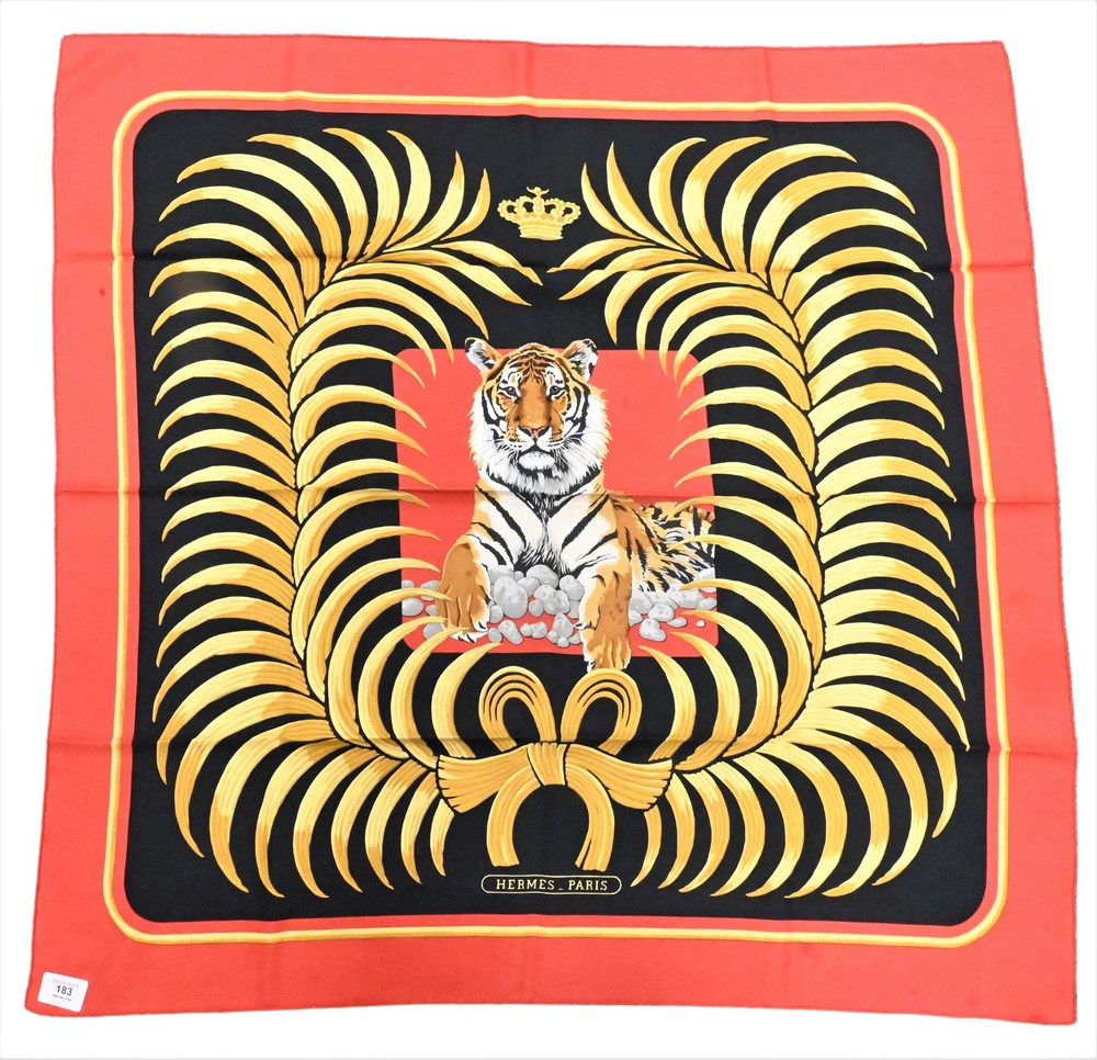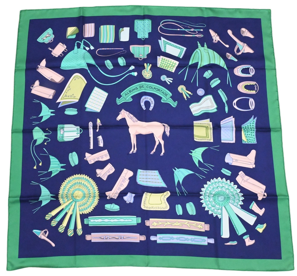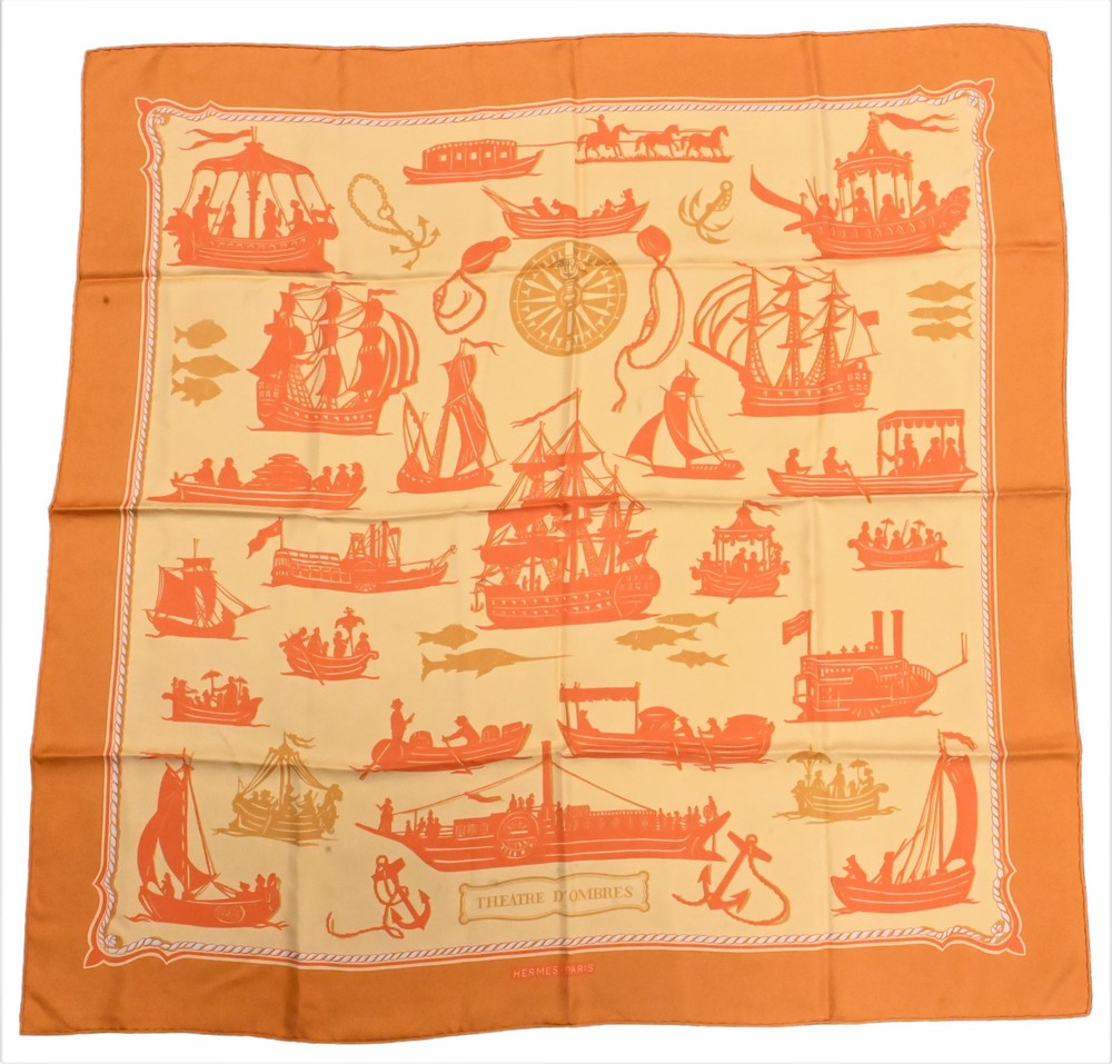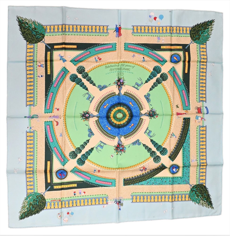 Four Piece Hermes Group, to include two silk ascots with round container; a silk Tournesols handkerchief with box; along with a black and white equestrian handkerchief with box.